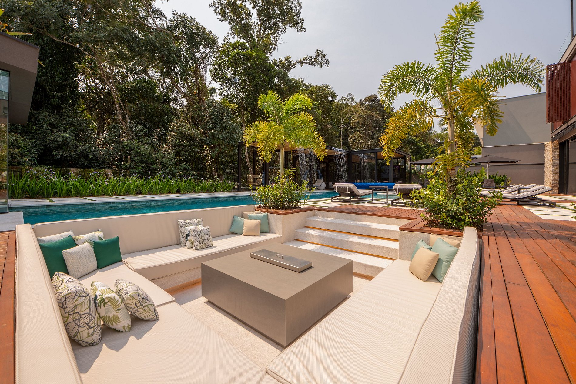 Próximo à piscina, há um home theater fechado, com porta de correr, ar-condicionado, vários sofás e almofadas, perfeito para reunir a família após um dia na praia.