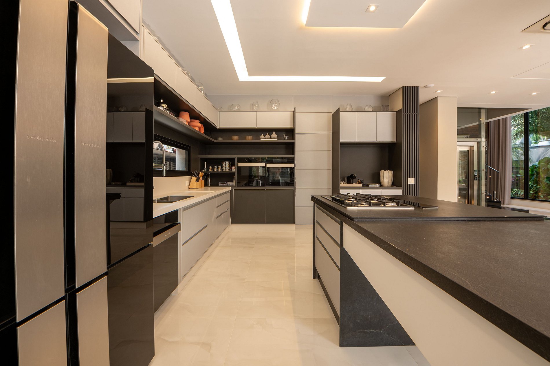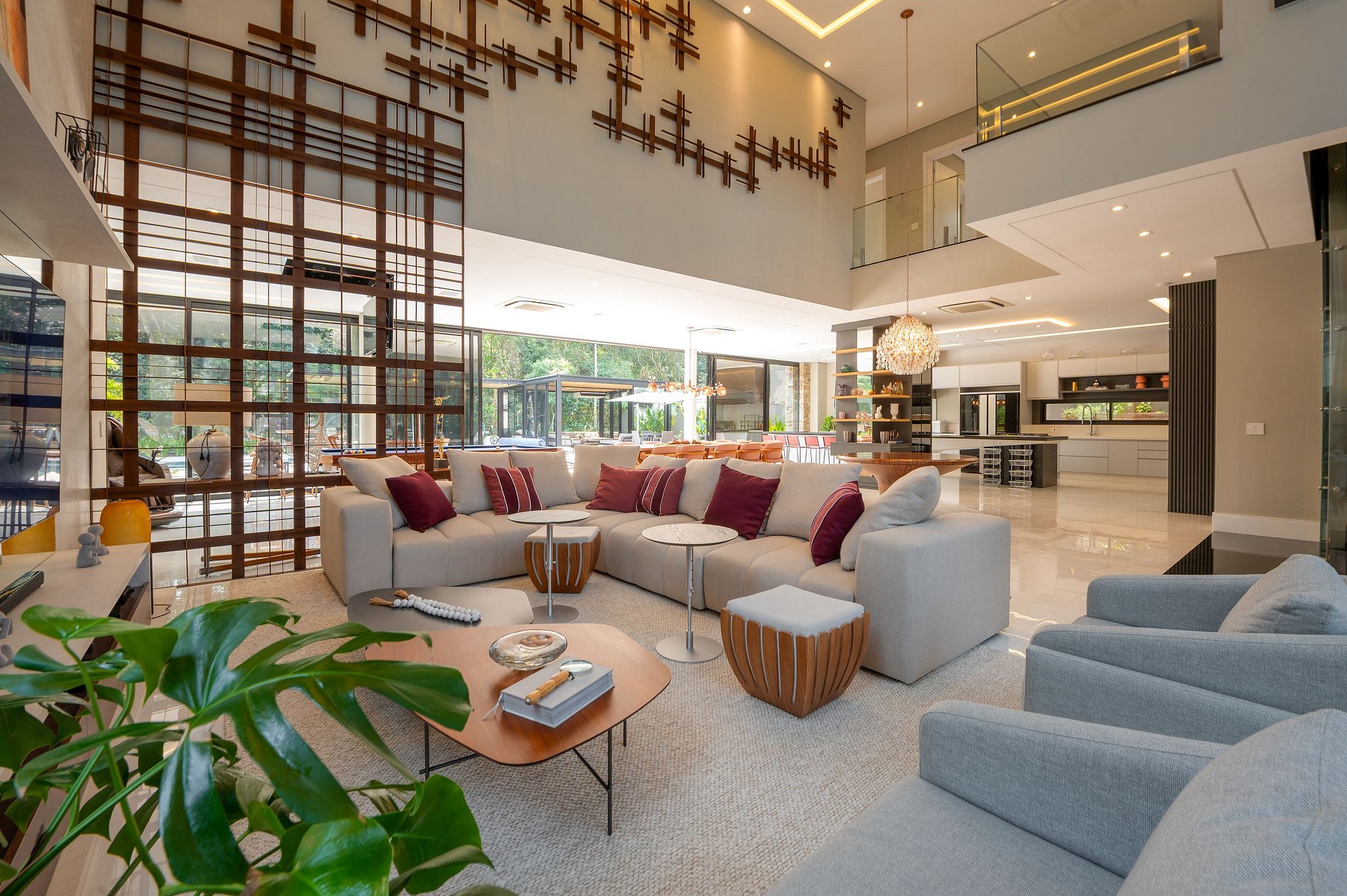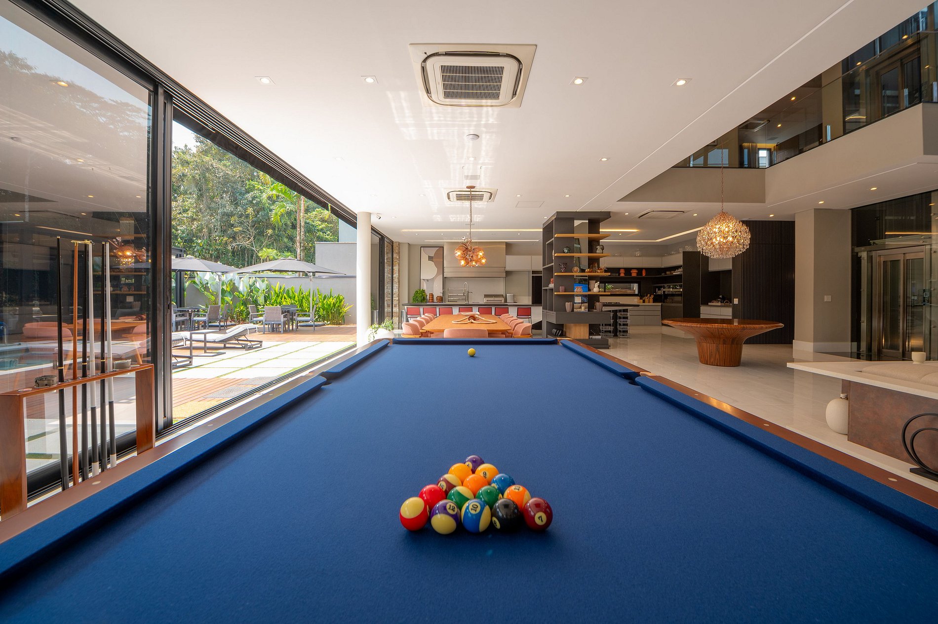 Na varanda integrada à sala, há uma belíssima mesa de jantar com 12 lugares, uma mesa de sinuca e uma moderna adega. A área gourmet é bem equipada, com uma chapa, churrasqueira de alta qualidade e diversos outros utensílios para o preparo das refeições. No segundo andar, há uma sala de TV.