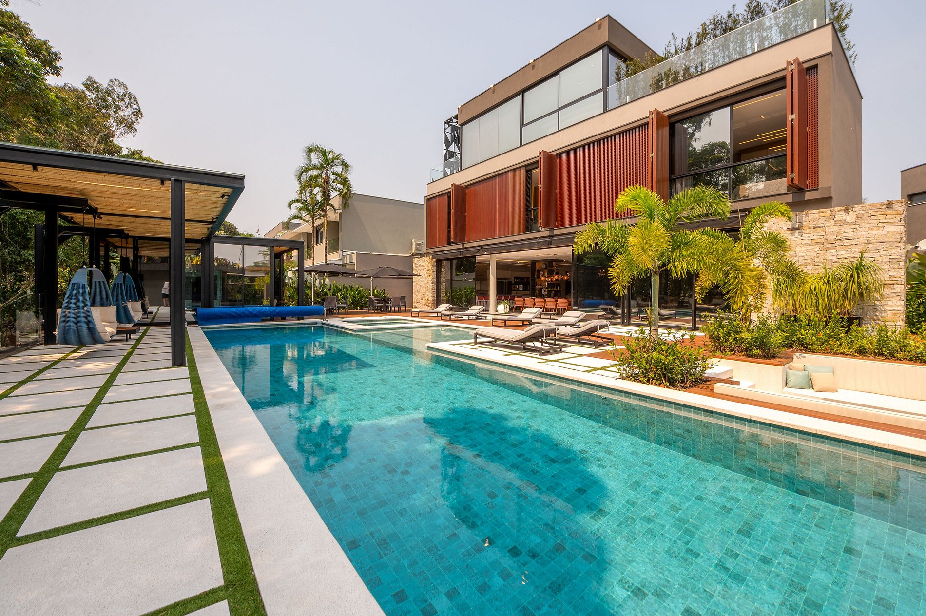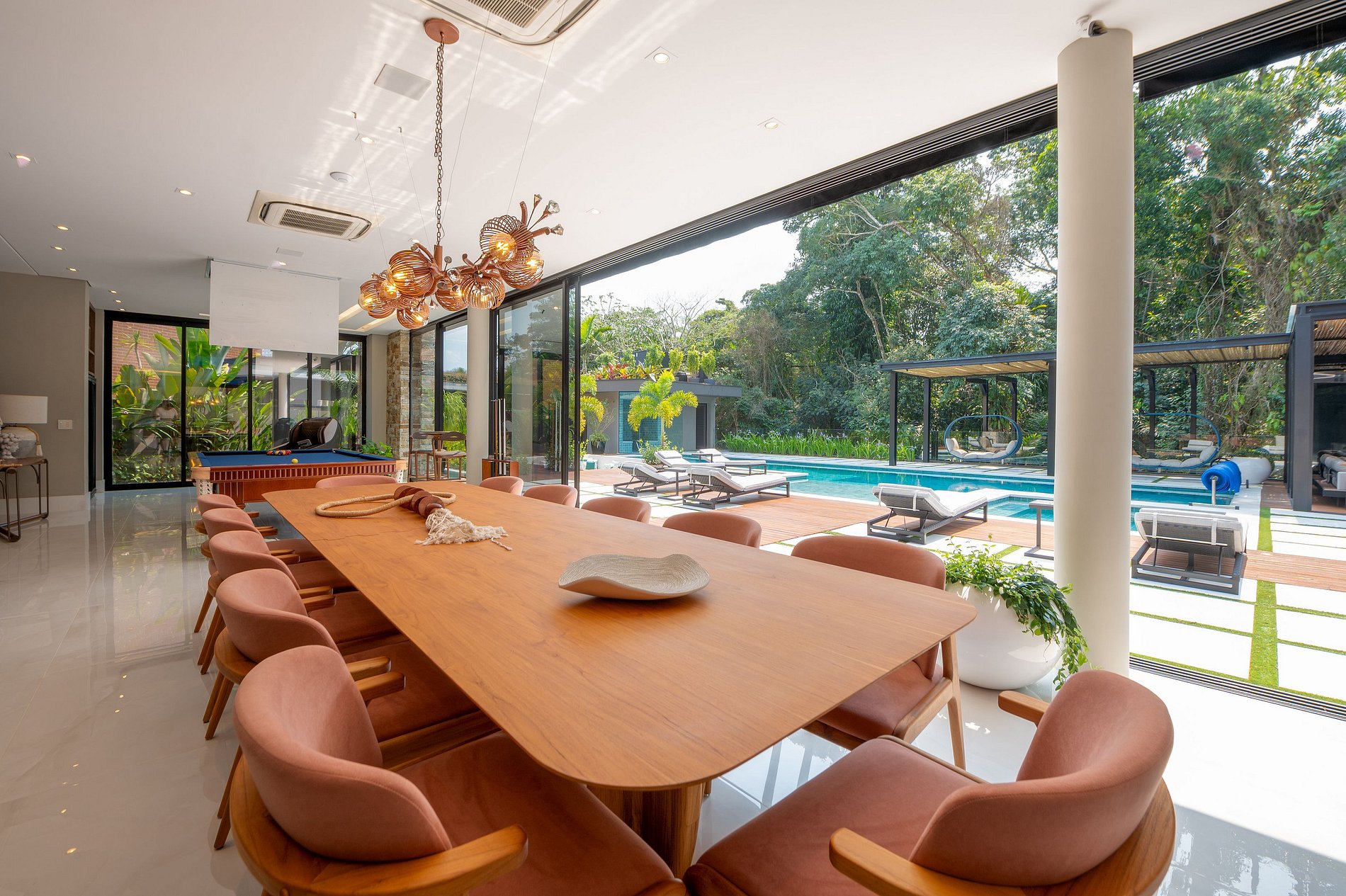 Na varanda integrada à sala, há uma belíssima mesa de jantar com 12 lugares, uma mesa de sinuca e uma moderna adega. A área gourmet é bem equipada, com uma chapa, churrasqueira de alta qualidade e diversos outros utensílios para o preparo das refeições. No segundo andar, há uma sala de TV.