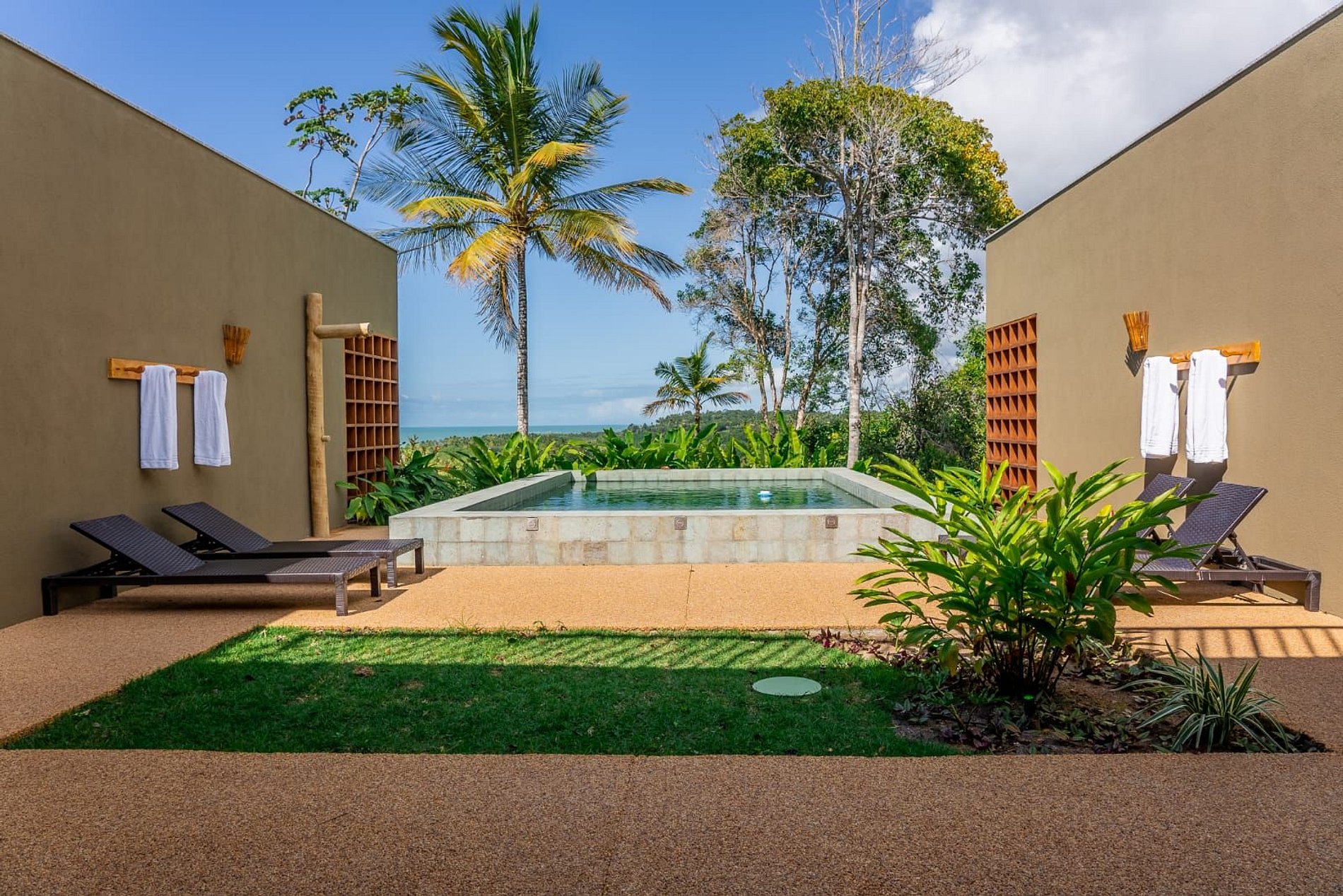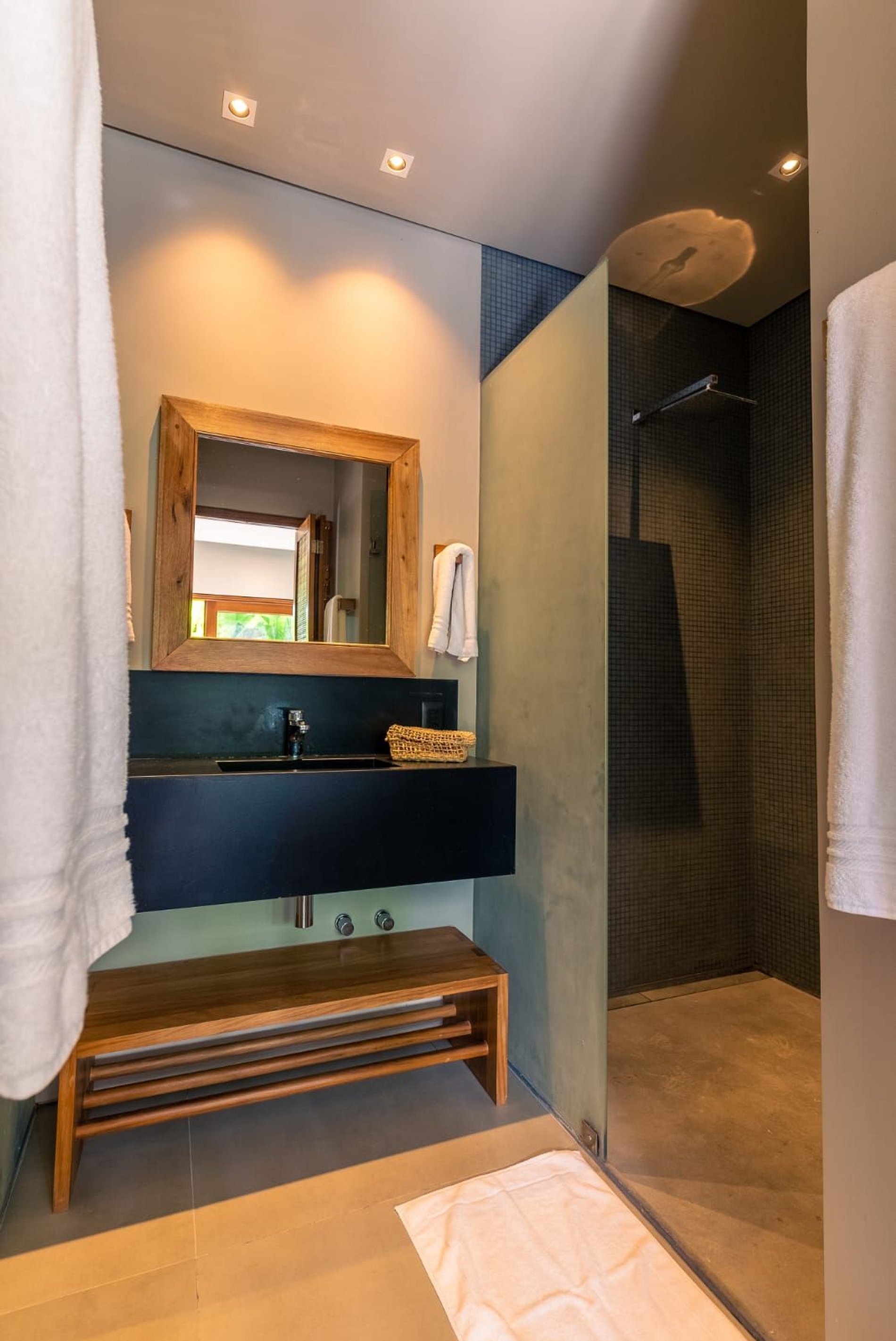 • 5 Suítes espaçosas e confortáveis, com jardim e chuveiro externo individuais. 2 das suítes com vista mar.