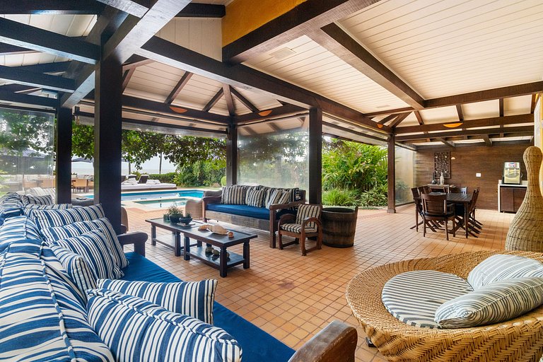 Ambientes iluminados e arejados; salas de estar e de TV integradas, ambas com portas de correr que dão acesso à varanda, e conectam a sala de estar ao espaço gourmet. A casa possui ainda uma segunda sala de TV mais reservada, e uma sala de jantar com pé-direito duplo que traz ainda mais elegância ao ambiente. Mobiliário e decoração sofisticados e com estilo praiano.