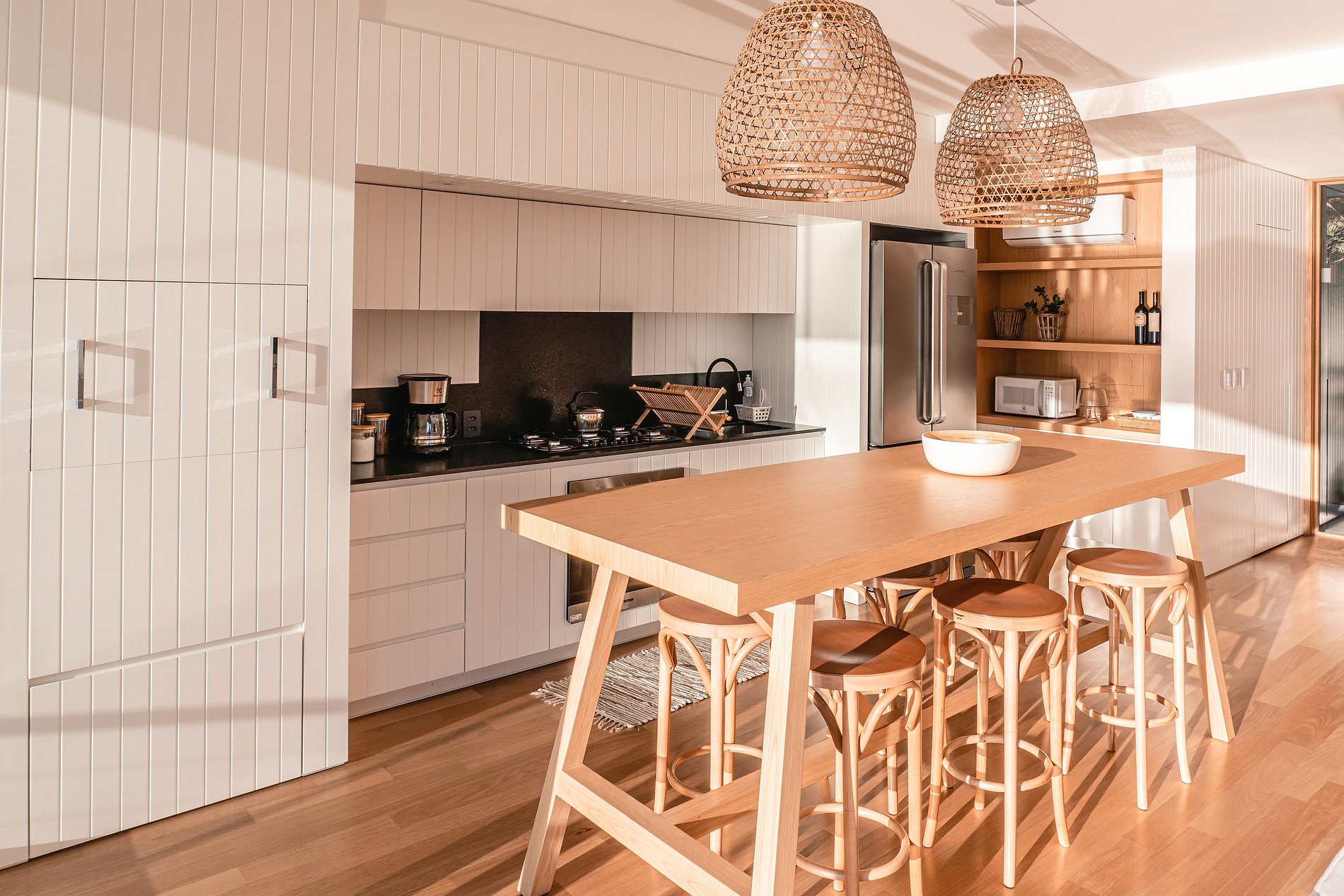 Cozinha completa com armários, eletrodomésticos e utensílios necessários para todo tipo de refeição.