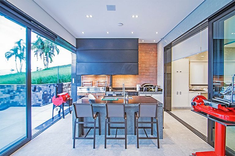 Pressurização de água na casa, pias com filtros, cozinha equipada com equipamentos Eletromec Italiano, coifa, fogão, forno, microondas geladeira e freezer, fogão a lenha da Marca Victorello. Espaço Gourmet totalmente integrado com a área externa, churrasqueira tipo Parrilha Largrill e cervejeira Venax.