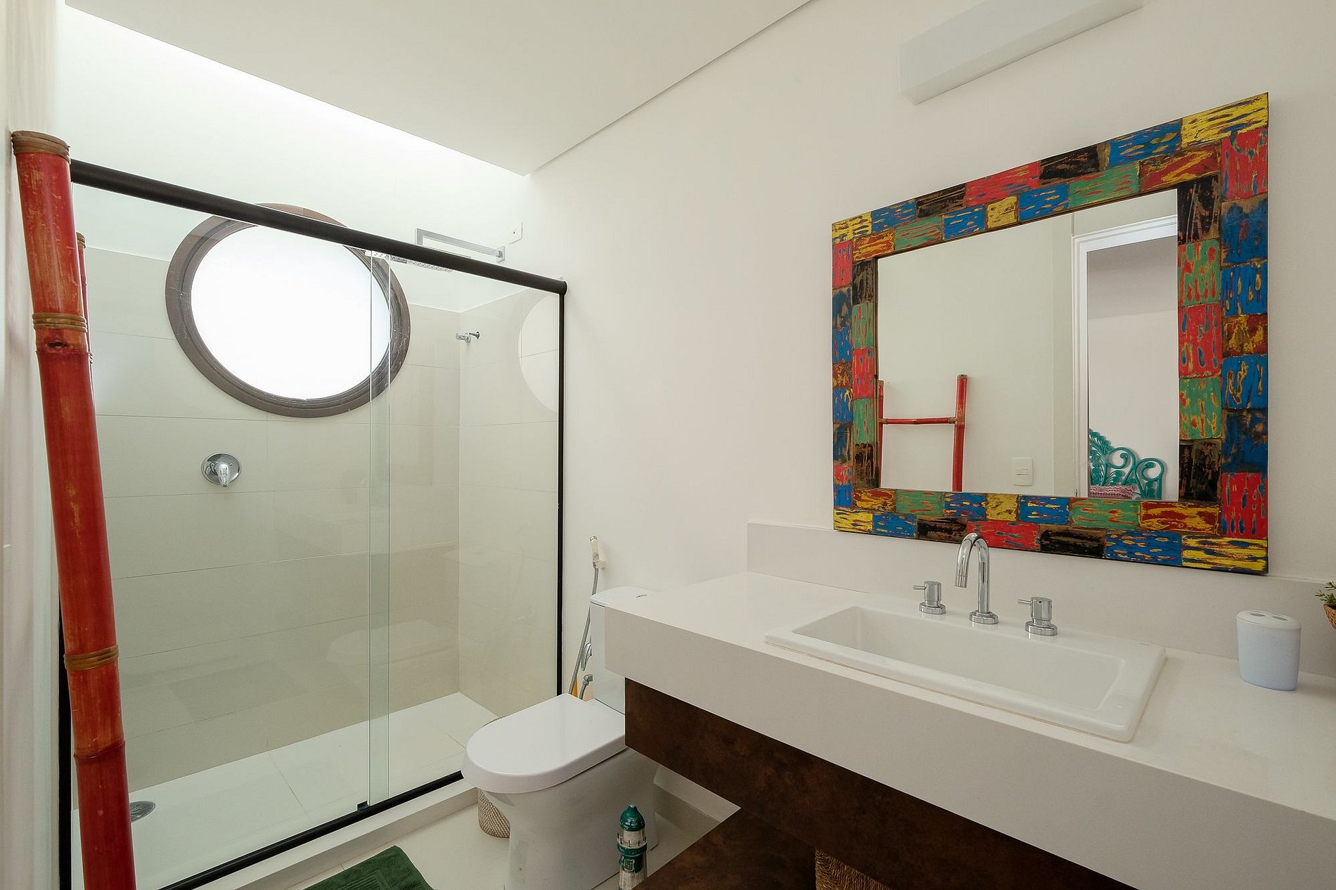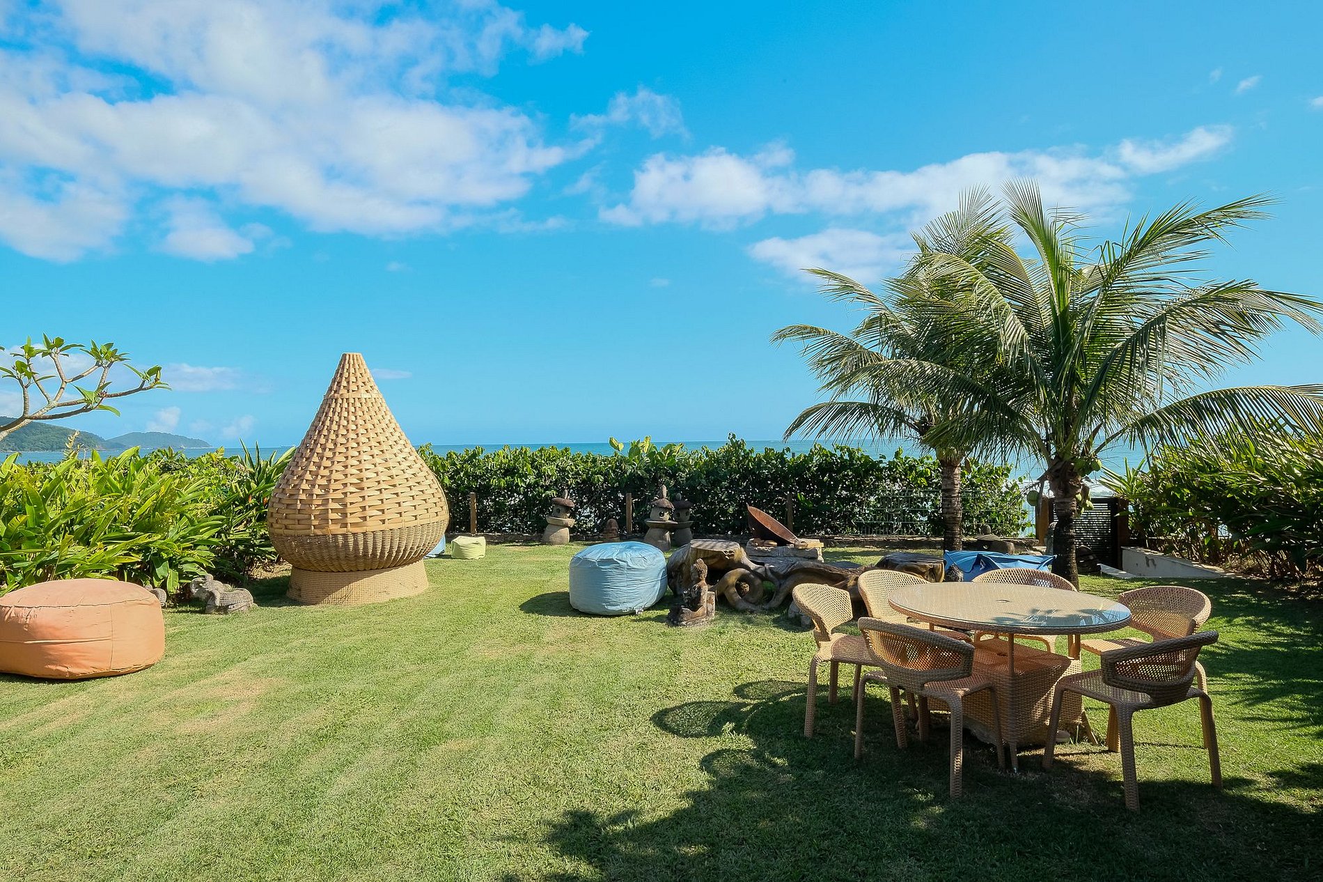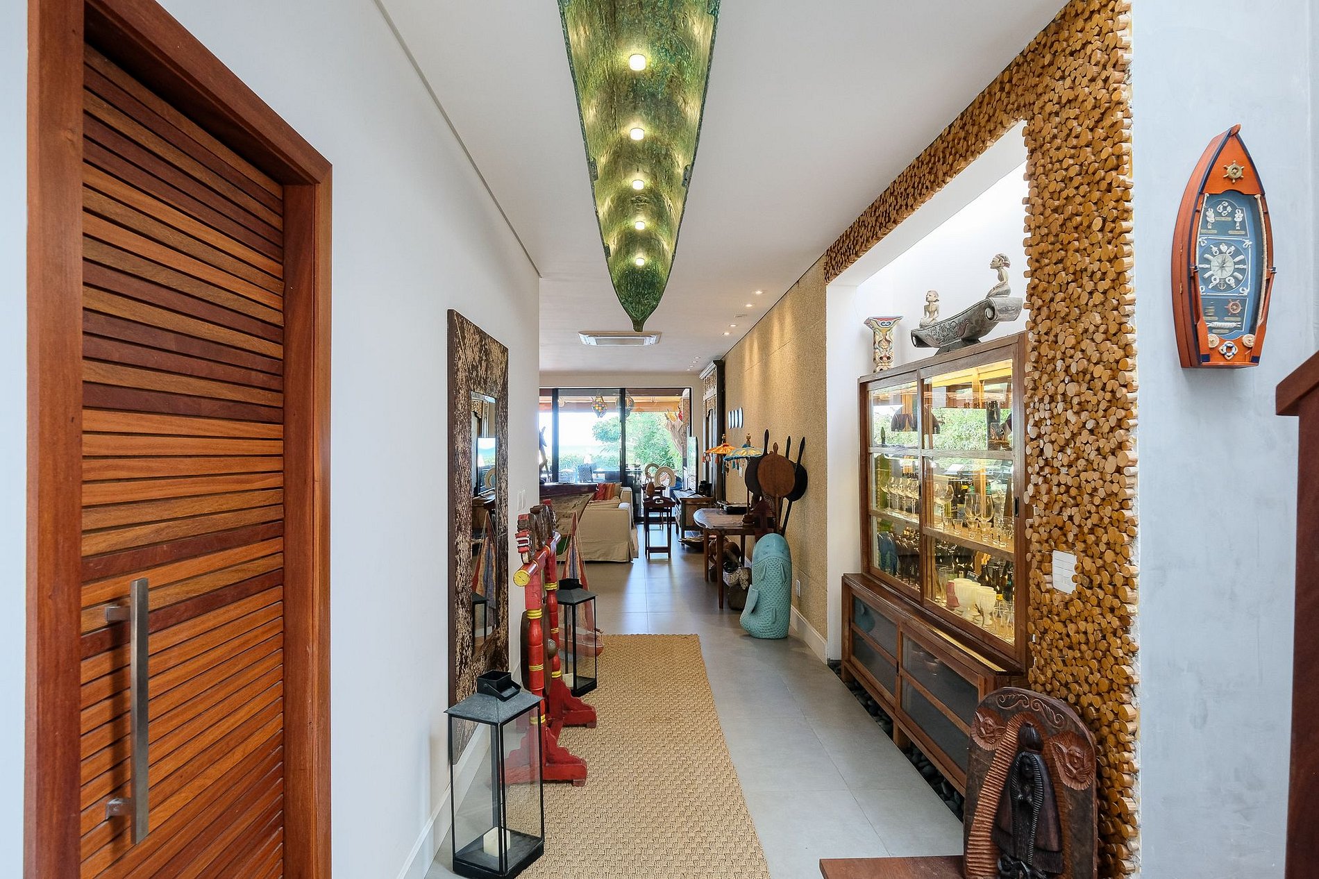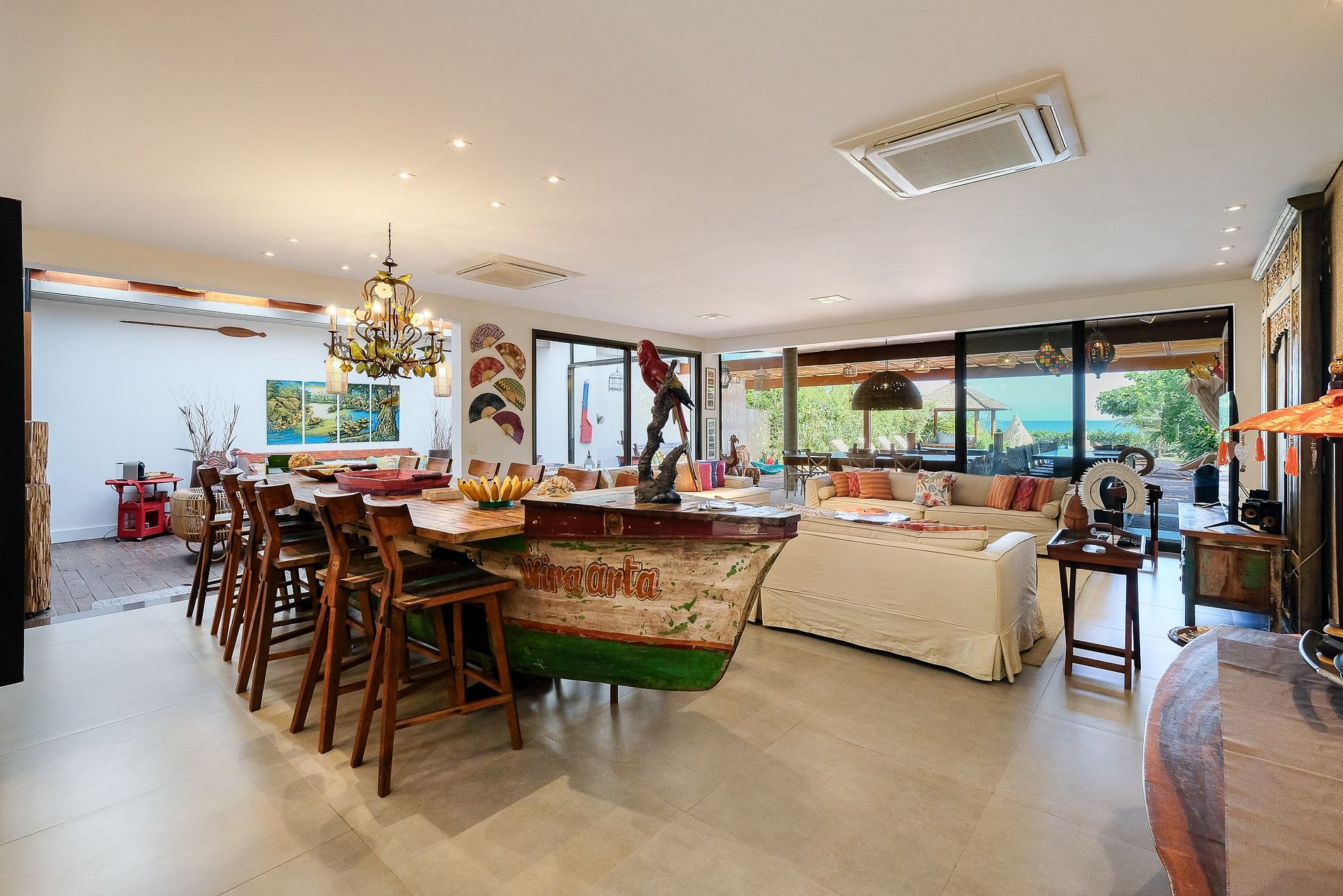 A casa destaca-se pela sua amplitude, luminosidade e decoração Balinesa, que alia charme e elegância. Os ambientes são integrados, proporcionando praticidade e harmonia. Na sala de estar, dois sofás brancos extremamente confortáveis e uma TV criam o cenário perfeito para momentos de relaxamento após a praia. A sala de jantar conta com uma imponente mesa de madeira com capacidade para 12 pessoas, ideal para refeições descontraídas e acolhedoras em família. O rooftop da casa é um diferencial, oferecendo uma área gourmet equipada com forno de pizza e uma vista deslumbrante.