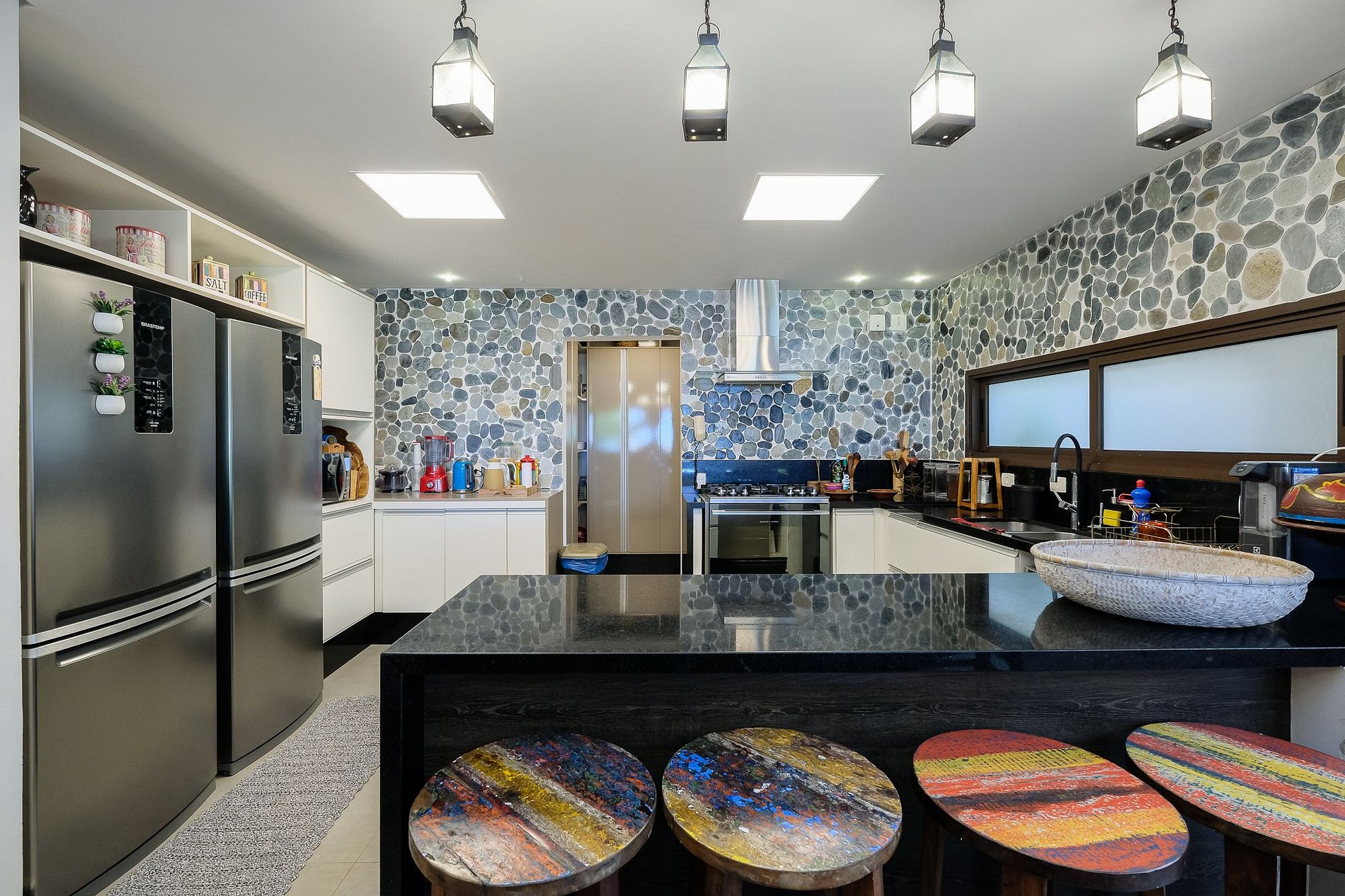 Cozinha aberta para a sala, equipada com um balcão de madeira com quatro bancos, criando um espaço funcional e agradável. Totalmente equipada e repleta de armários, dispõe de diversos utensílios e eletrodomésticos de alta qualidade para o preparo de uma variedade de pratos.