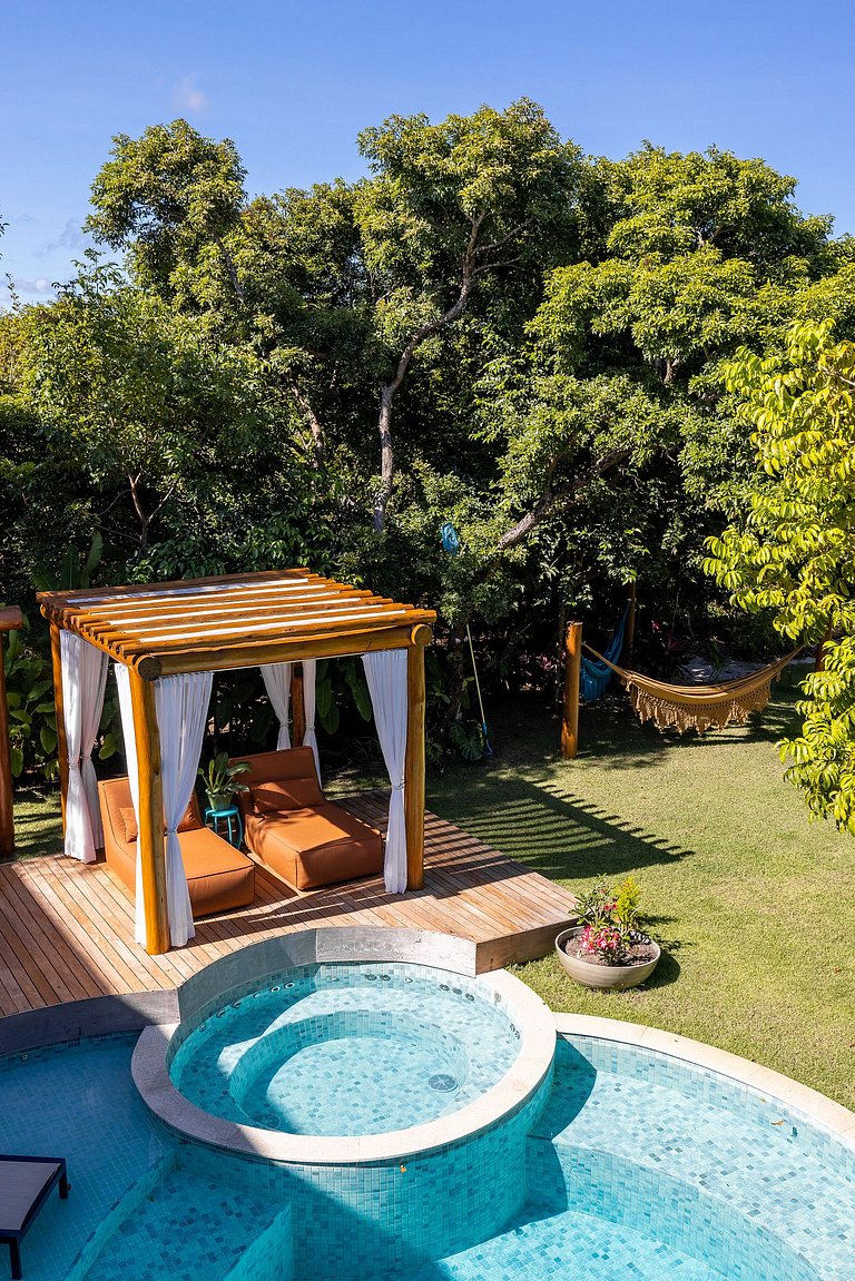 Área externa e demais ambientes com mobiliário de alto padrão. Piscina com vários níveis de profundidade, hidromassagem aquecida ao lado da piscina, redário e mobiliário confortável para descanso e meditação. Mesa redonda com 08 lugares.