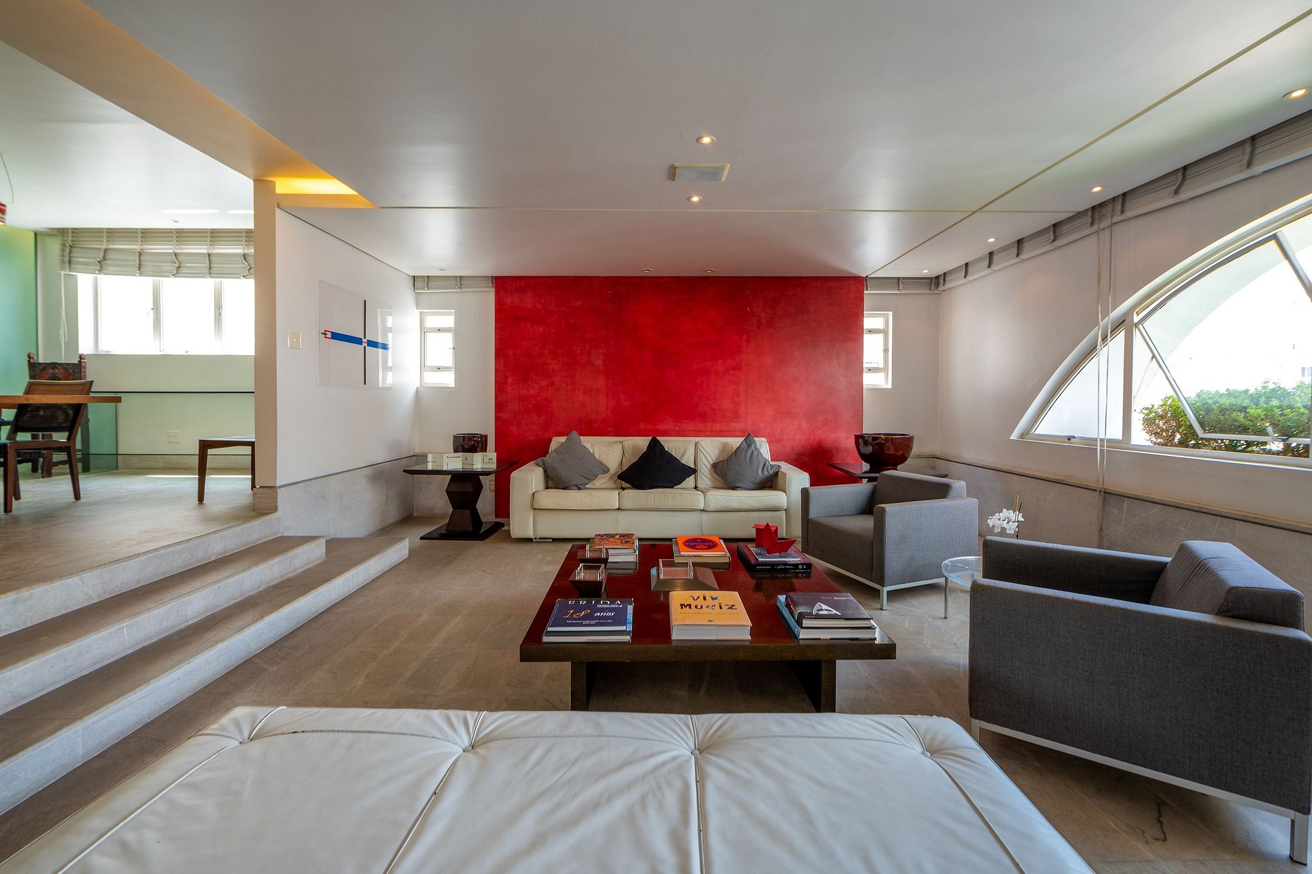Ambientes amplos, bem iluminados e arejados. Enorme sala de estar semi-integrada às salas de jantar e TV, por meio de um bonito jogo de nível de piso. Décor moderno com mobília elegante e sofisticada.