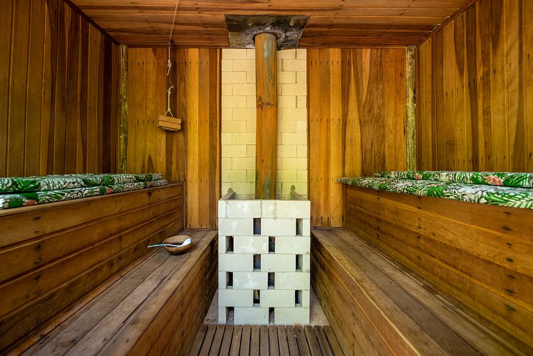 O ambiente externo oferece várias opções de lazer, como uma varanda aconchegante na casa principal, equipada com sofá e poltronas confortáveis e uma elegante mesa de piquenique; além disso, há um espaço gourmet com forno a lenha na casa anexa; spa com sauna seca, pequena piscina e ofurô para 12 pessoas; pula-pula, balanços, horta orgânica e cachoeira