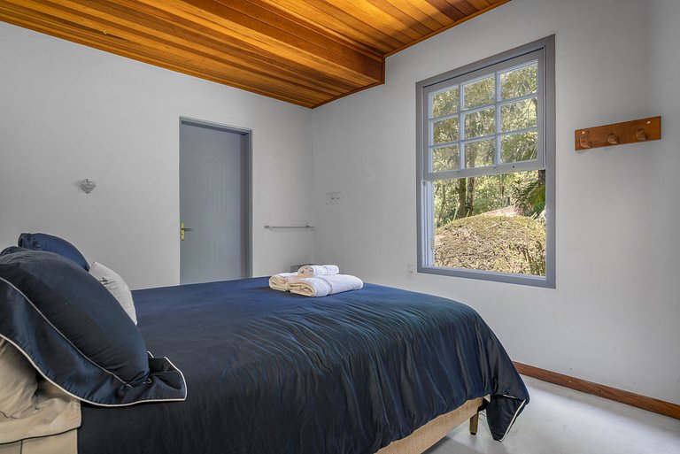 Ambientes arejados e bem iluminados, que recebem bastante luz natural através das grandes portas de vidro e janelões. A casa principal, possui sala de estar integrada às salas de TV, de jantar e à cozinha, num ambiente com uma elegante lareira suspensa e teto revestido com madeira, configurando um espaço aconchegante e acolhedor.
