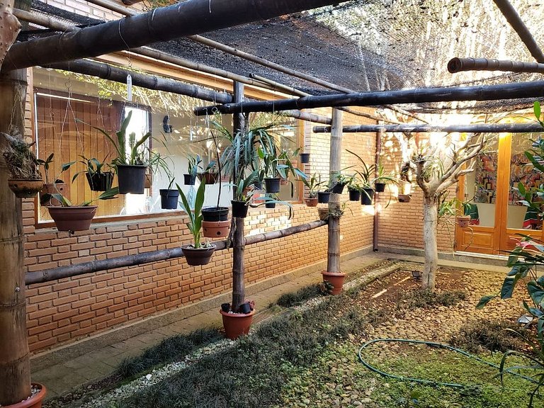 Contíguo à cozinha, o espaço gourmet conta com churrasqueira e belas mesas de madeira cobertas por um pergolado cheio de plantas, configurando um espaço charmoso e acolhedor.