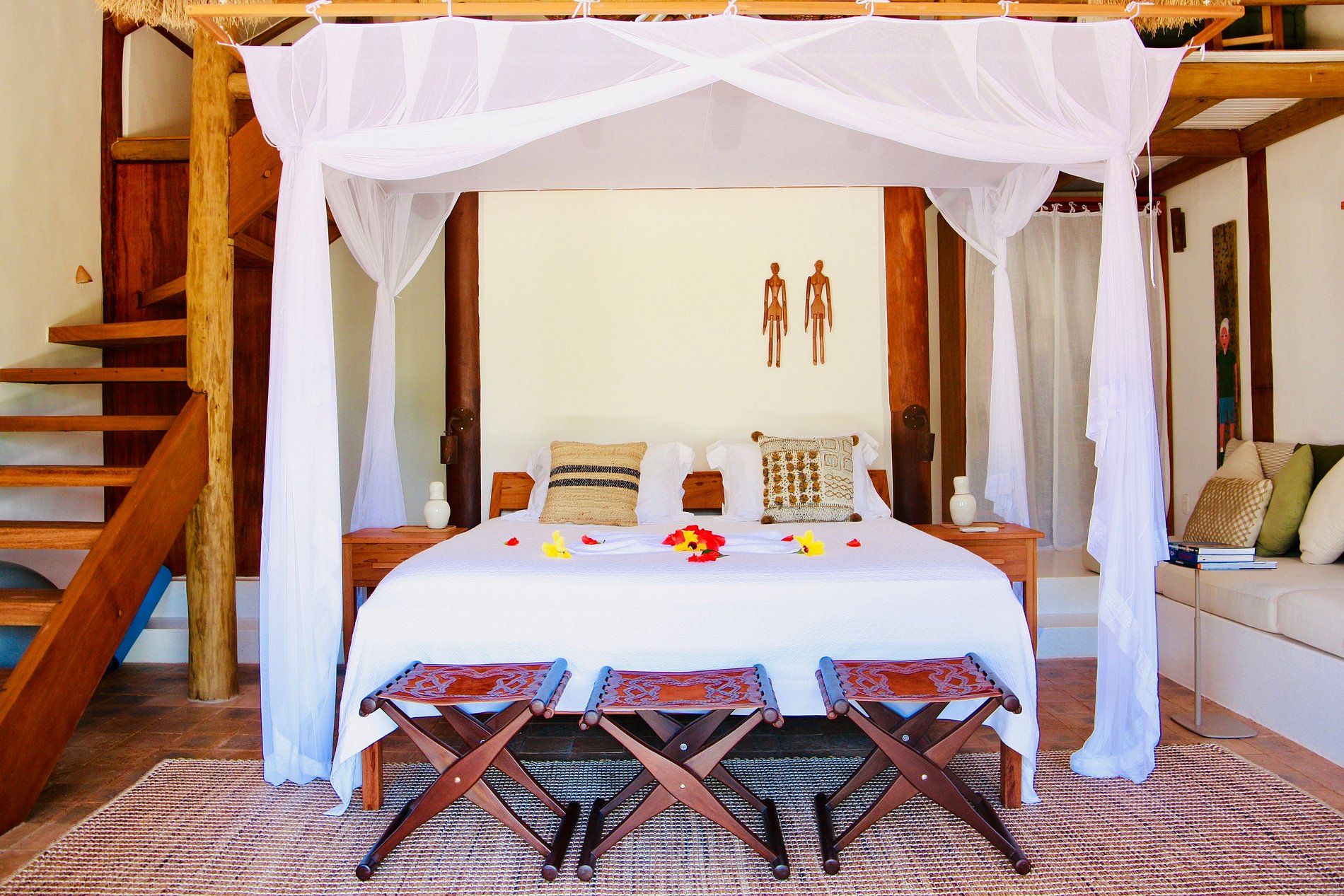 Ambientes arejados e bem iluminados; salas de estar e jantar, localizadas na varanda e integradas à cozinha, em um espaço com pé-direito duplo e um lindo telhado de piaçava, que une de forma harmônica a rusticidade à elegância trabalhada na decoração praiana e no mobiliário sofisticado e contemporâneo. Sala de TV com espaço de trabalho, localizados no andar superior da suíte máster, em um recinto reservado e superaconchegante.