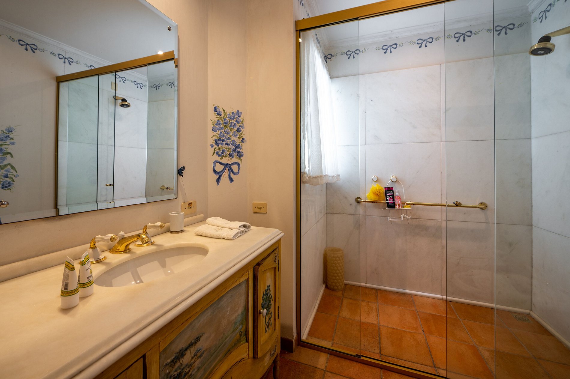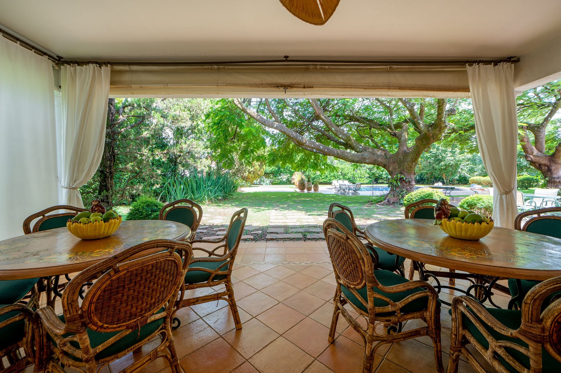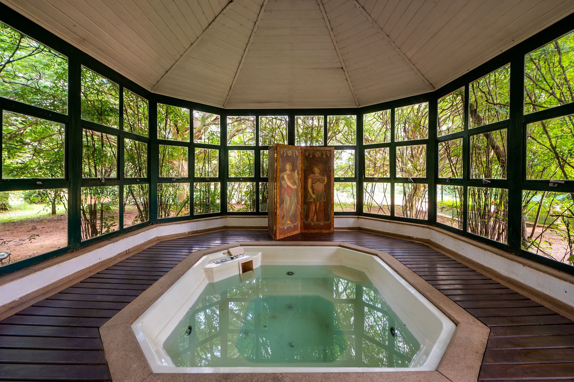 Grande pavilhão lindamente decorado, com área gourmet com churrasqueira, geladeira e balcão para o preparo de drinks e aperitivos; área de SPA com sauna úmida, Jacuzzi e 01 suíte com 01 cama King; sala de TV com confortáveis sofás e poltronas; e uma bela área de refeições com mesa para 10 pessoas. Quadra de tênis, campo de golf particular
