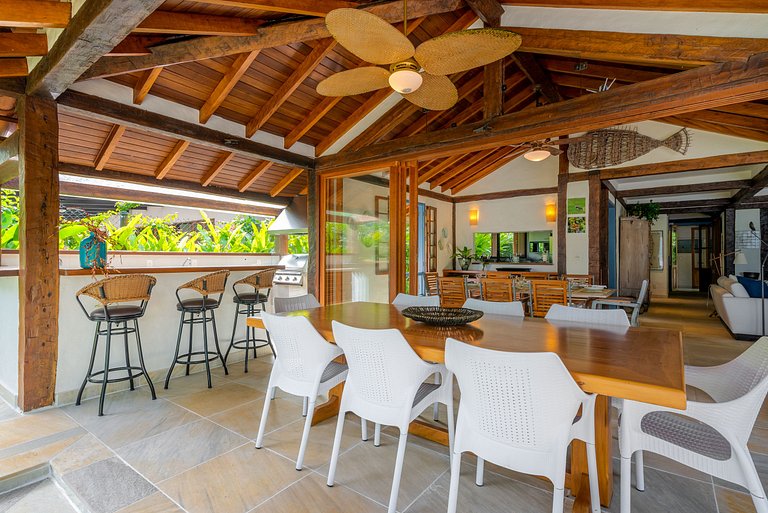 e elegante, janelões de correr com vista para o mar e jardim e a deslumbrante paisagem da Mata Atlântica.