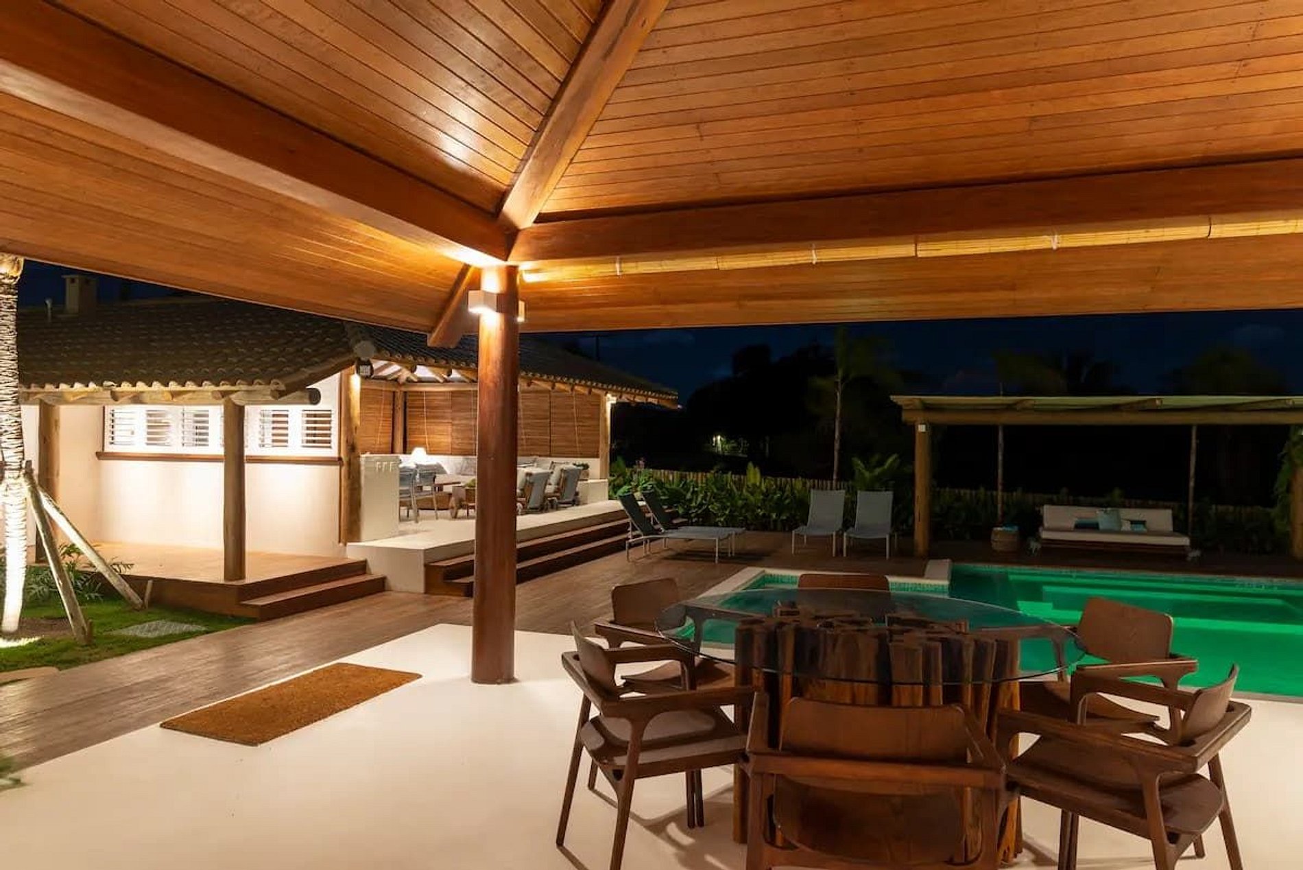 A casa é sofisticada, elegante e confortável, toda aberta para o exterior e com muita luz natural e ventilação cruzada. Salas de jantar, de estar e de TV integradas, com uma bela decoração e mobília em madeira, trazendo rusticidade de forma requintada.
