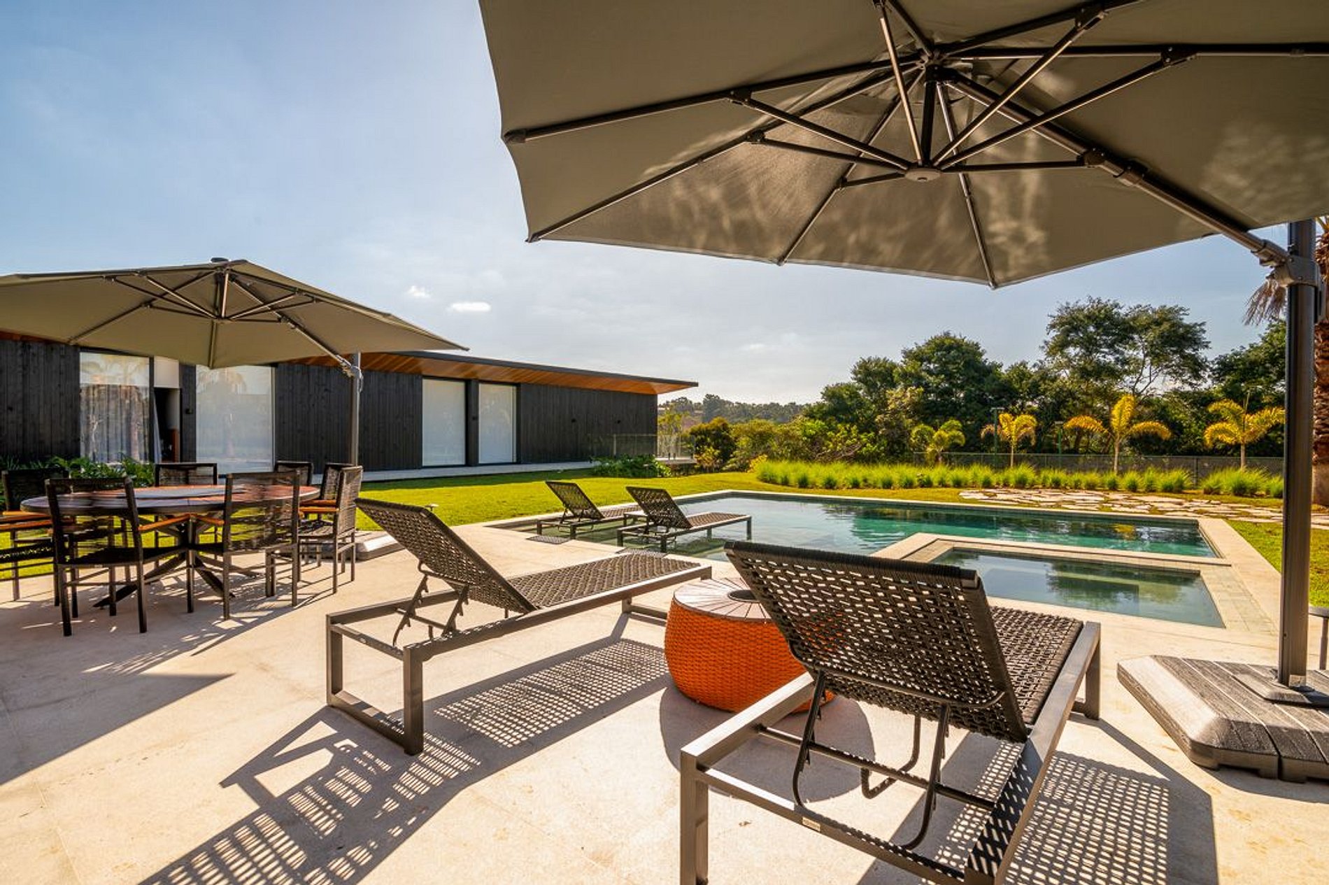 Linda piscina aquecida (aquecimento contratado à parte) com prainha para espreguiçadeiras e hidromassagem. Na área que a cerca, há dois ombrelones, um sobre espreguiçadeiras e outro sobre uma mesa redonda para 08 pessoas.