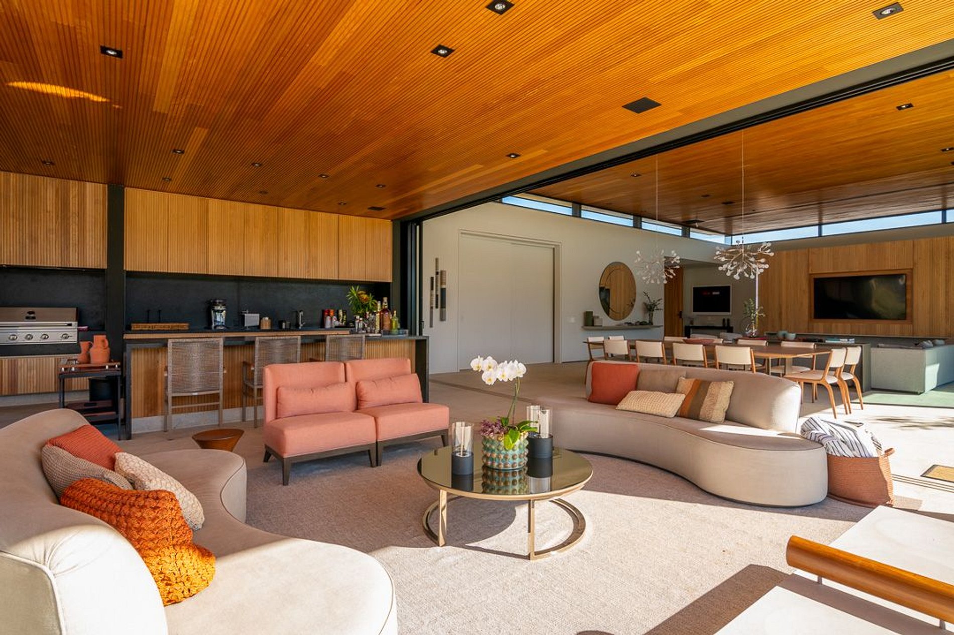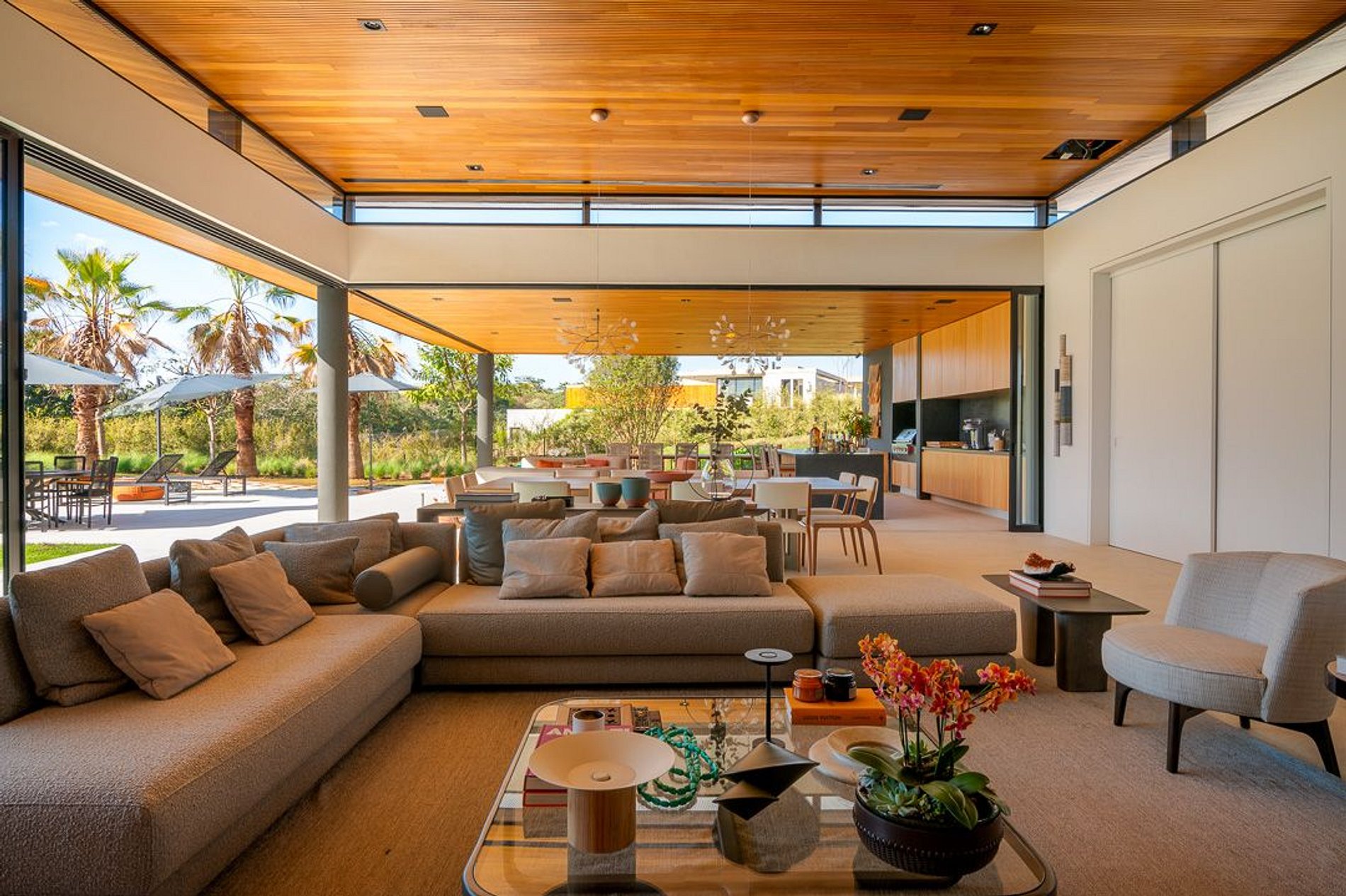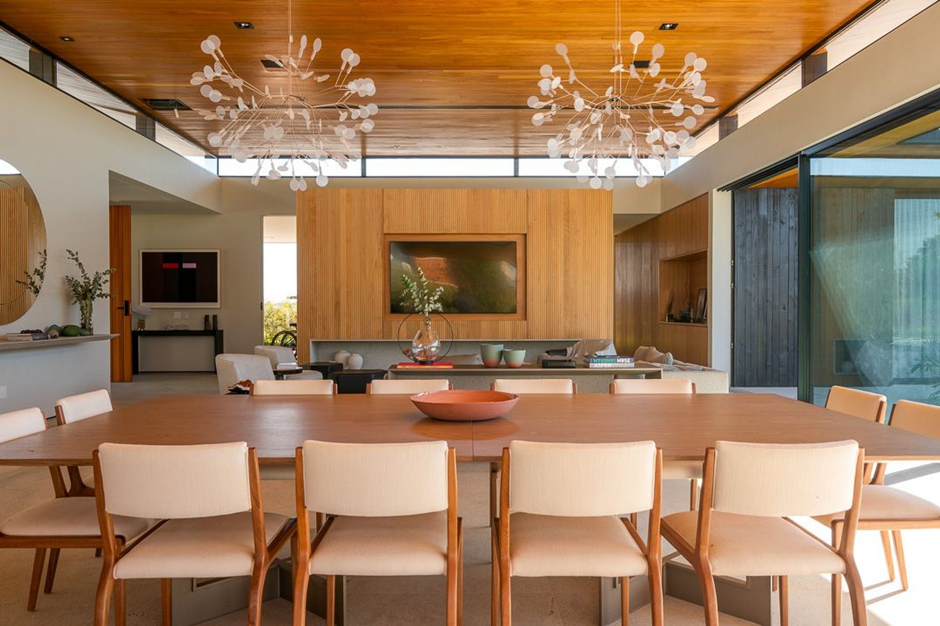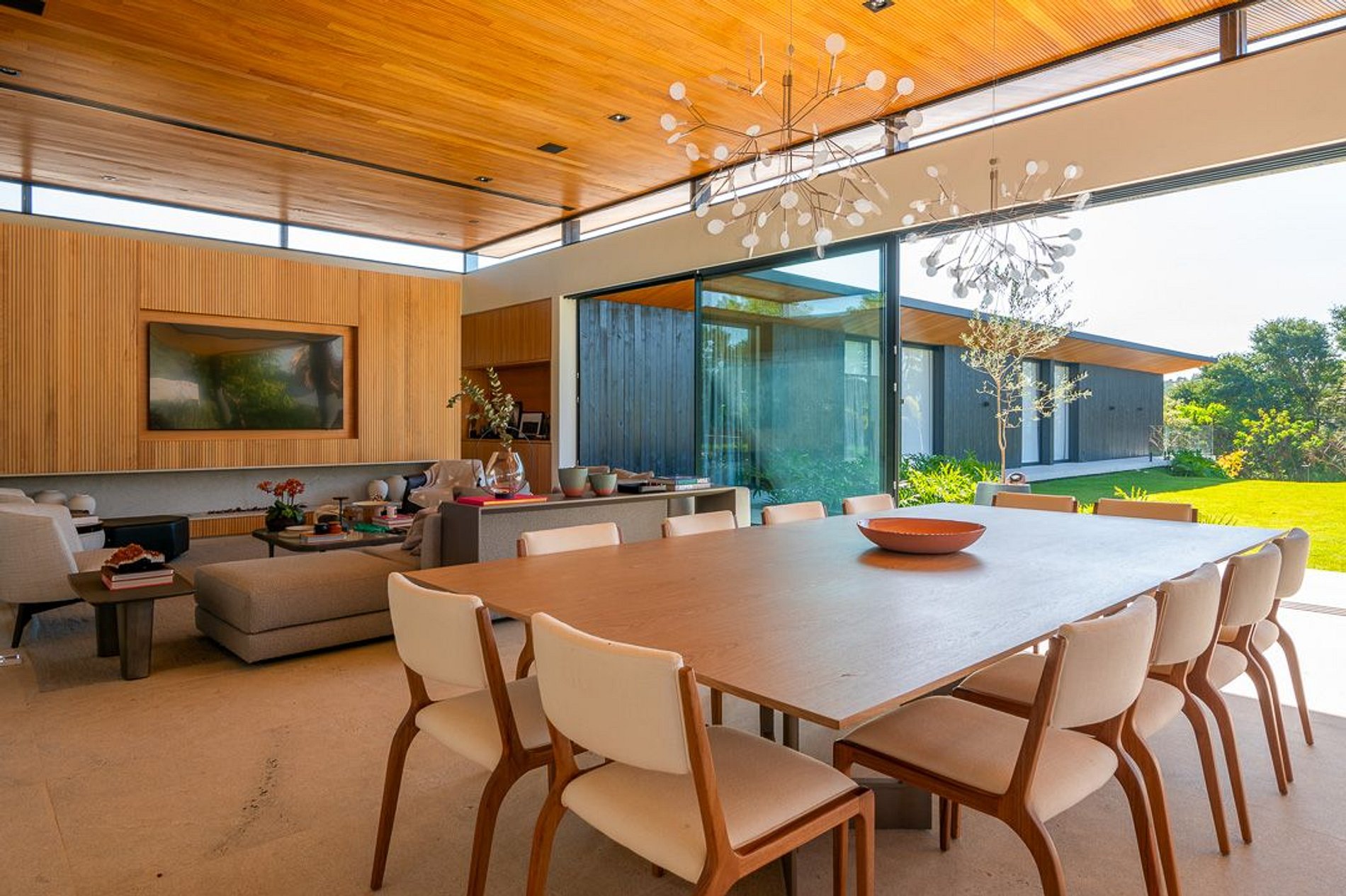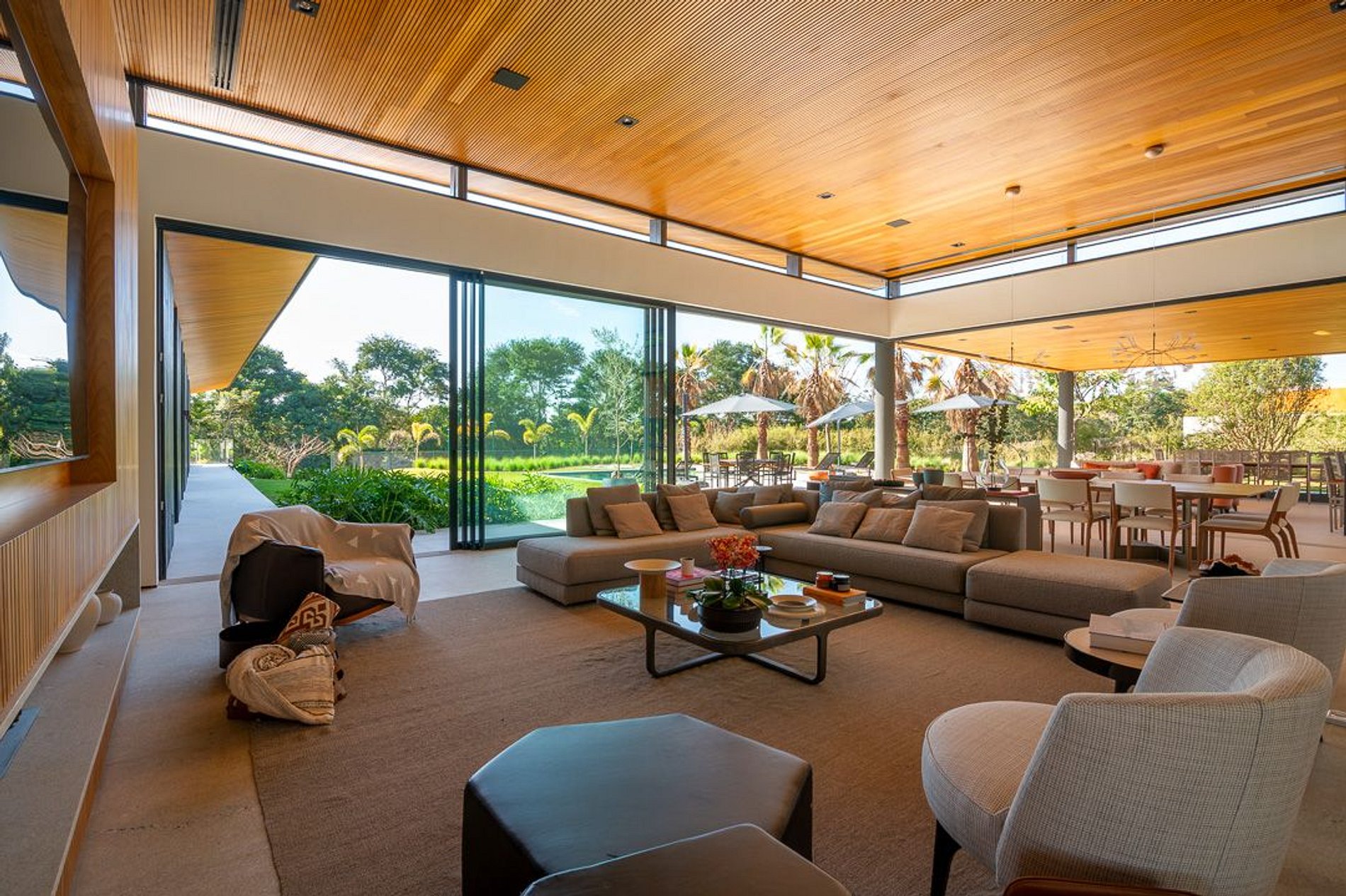 Ambientes arejados e bem iluminados; sala de jantar integrada à sala de estar/TV, à cozinha e ao espaço gourmet. Imensas portas de correr – que se abrem completamente – permitem a entrada de muita luz natural e a união do ambiente externo ao interno, trazendo a natureza para a decoração dos ambientes. Mobiliário contemporâneo e sofisticado e uma decoração elegante e minimalista.