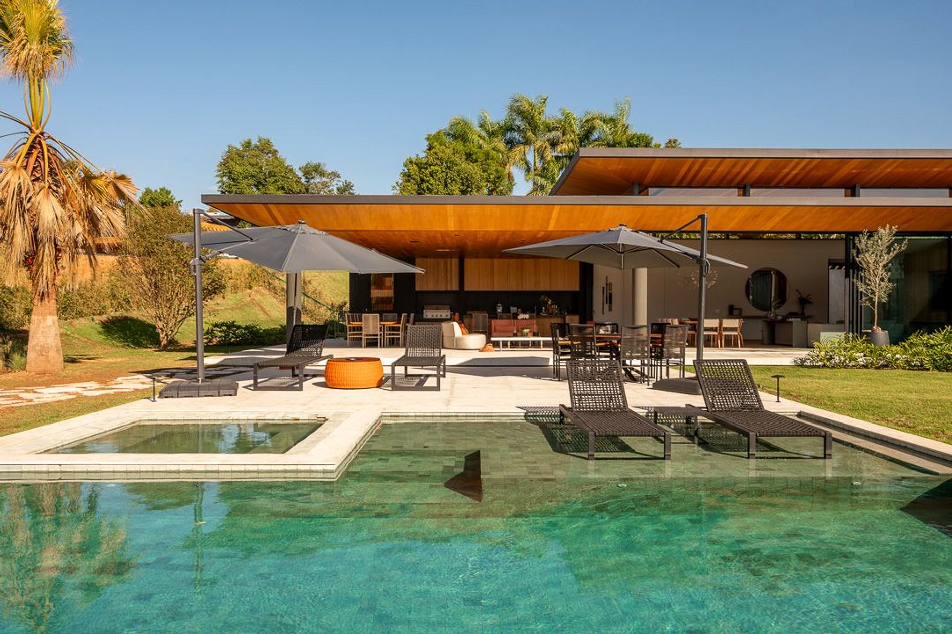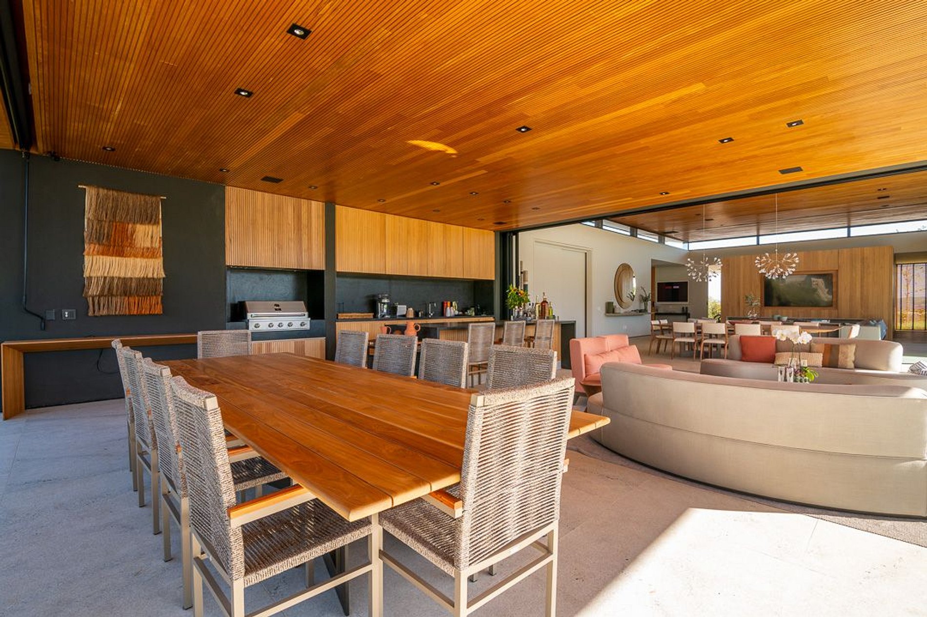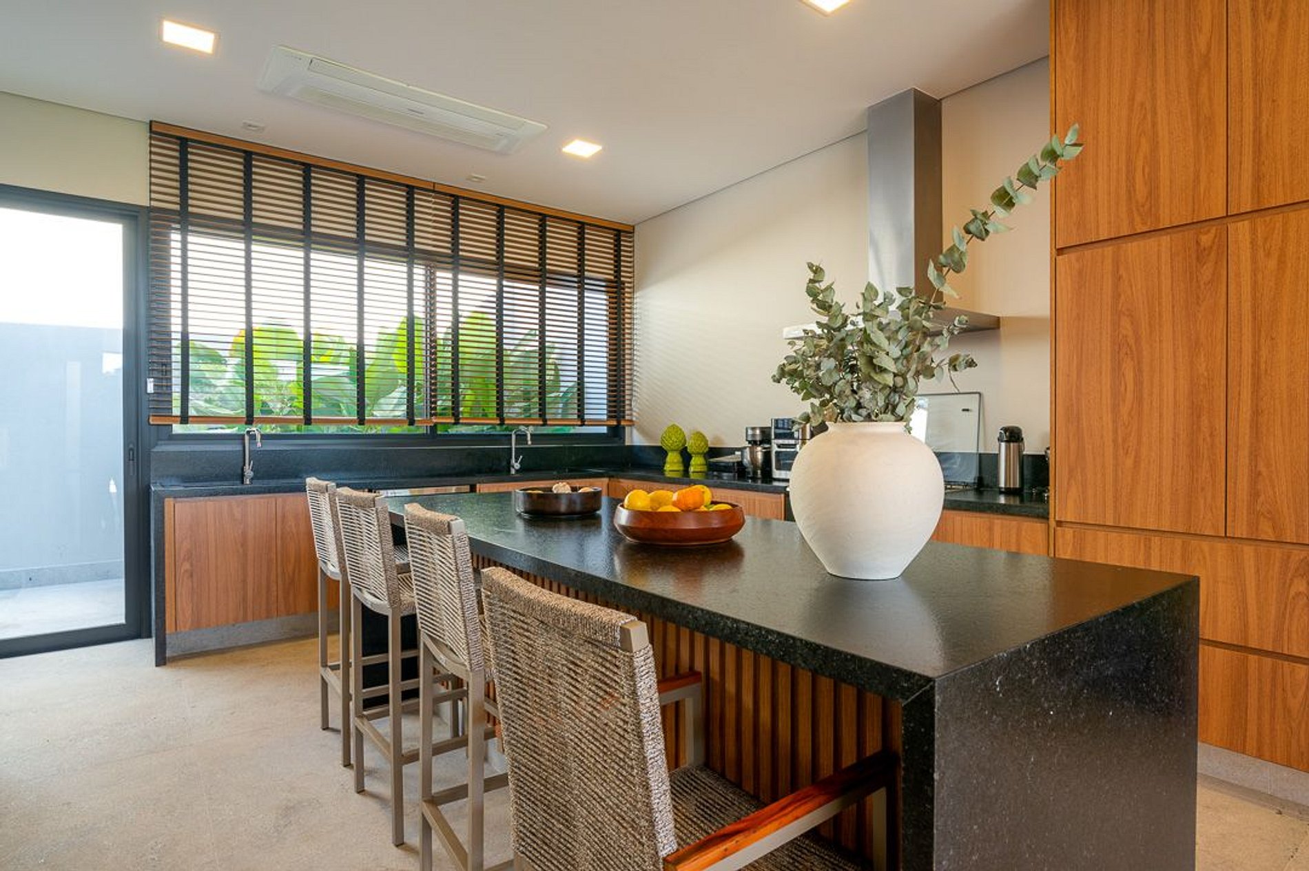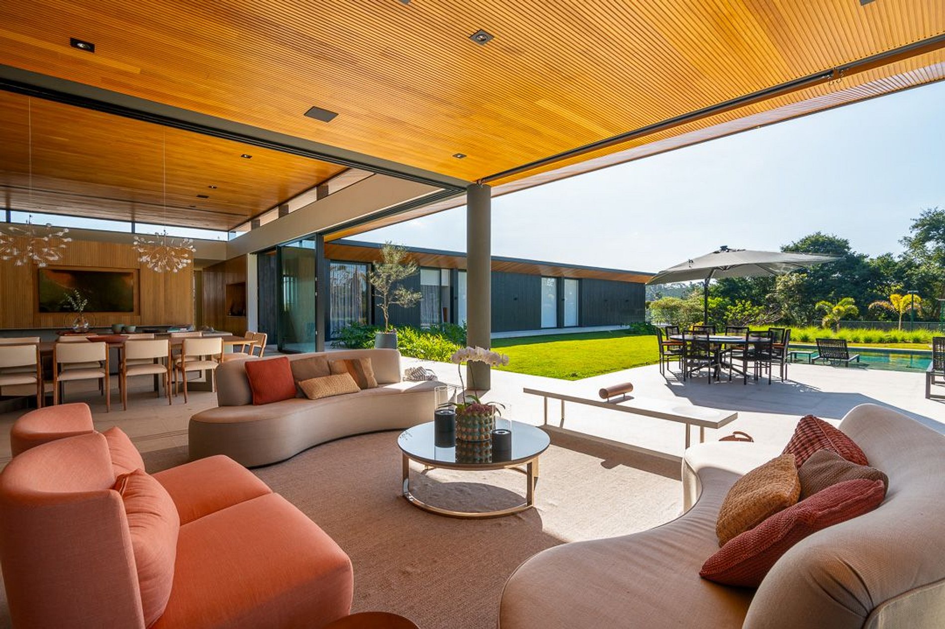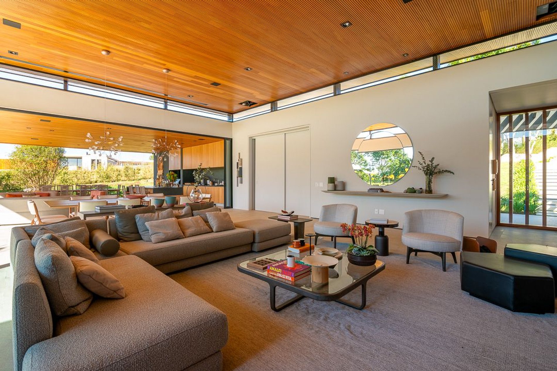 Ambientes arejados e bem iluminados; sala de jantar integrada à sala de estar/TV, à cozinha e ao espaço gourmet. Imensas portas de correr – que se abrem completamente – permitem a entrada de muita luz natural e a união do ambiente externo ao interno, trazendo a natureza para a decoração dos ambientes. Mobiliário contemporâneo e sofisticado e uma decoração elegante e minimalista.