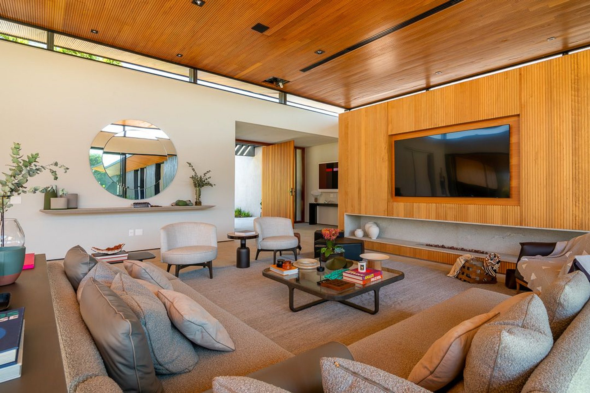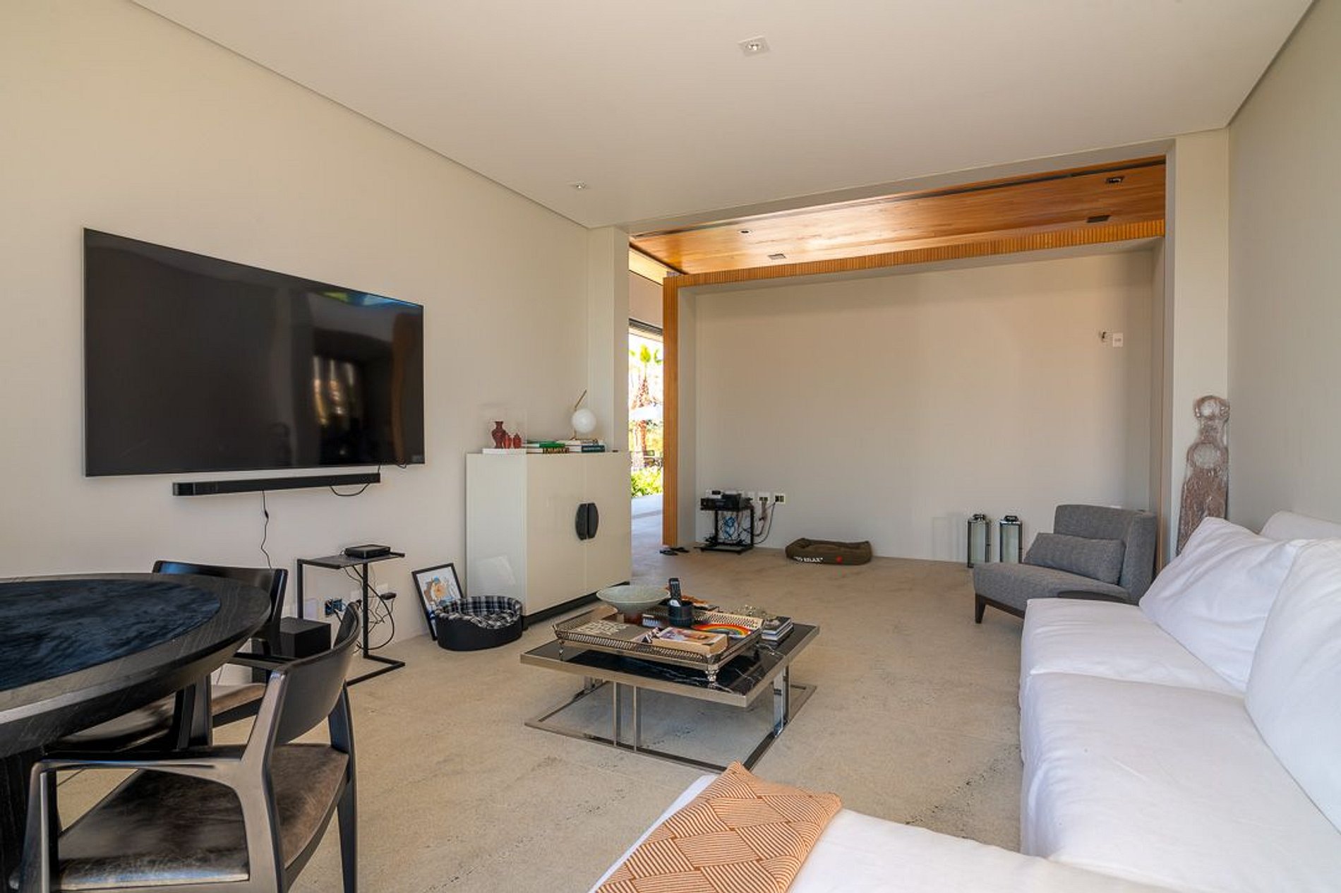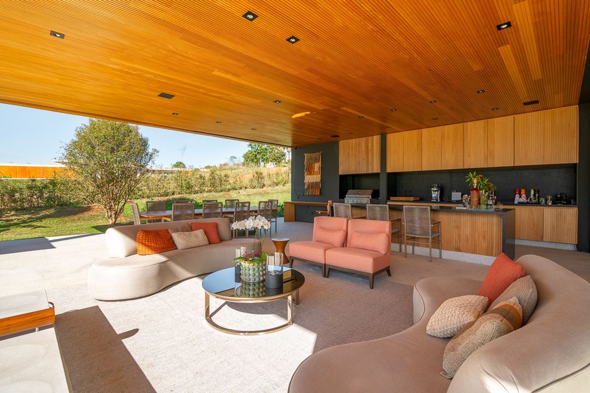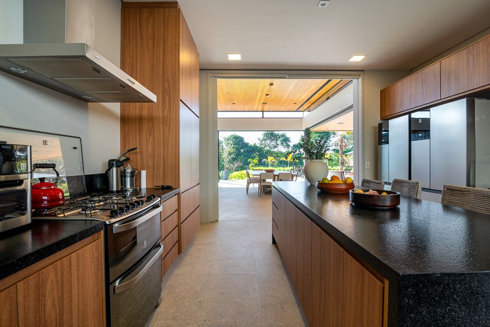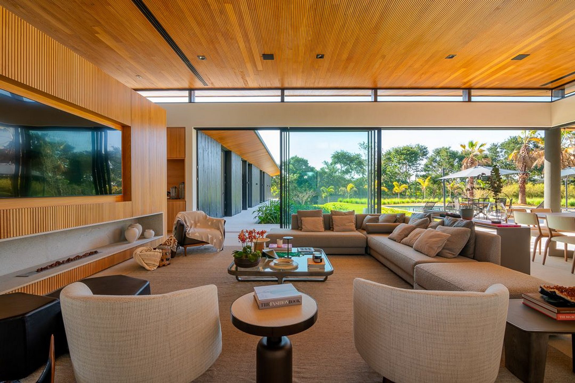 Ambientes arejados e bem iluminados; sala de jantar integrada à sala de estar/TV, à cozinha e ao espaço gourmet. Imensas portas de correr – que se abrem completamente – permitem a entrada de muita luz natural e a união do ambiente externo ao interno, trazendo a natureza para a decoração dos ambientes. Mobiliário contemporâneo e sofisticado e uma decoração elegante e minimalista.
