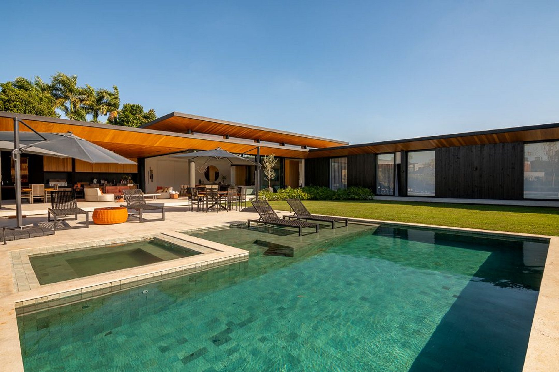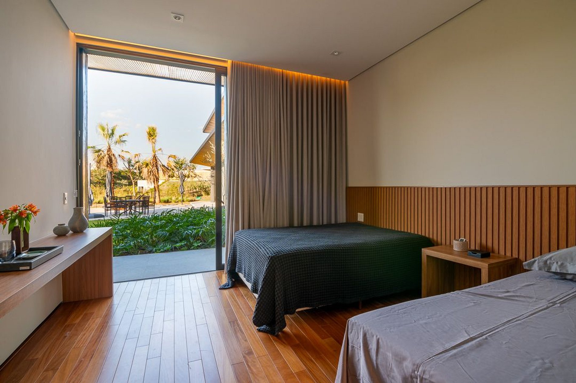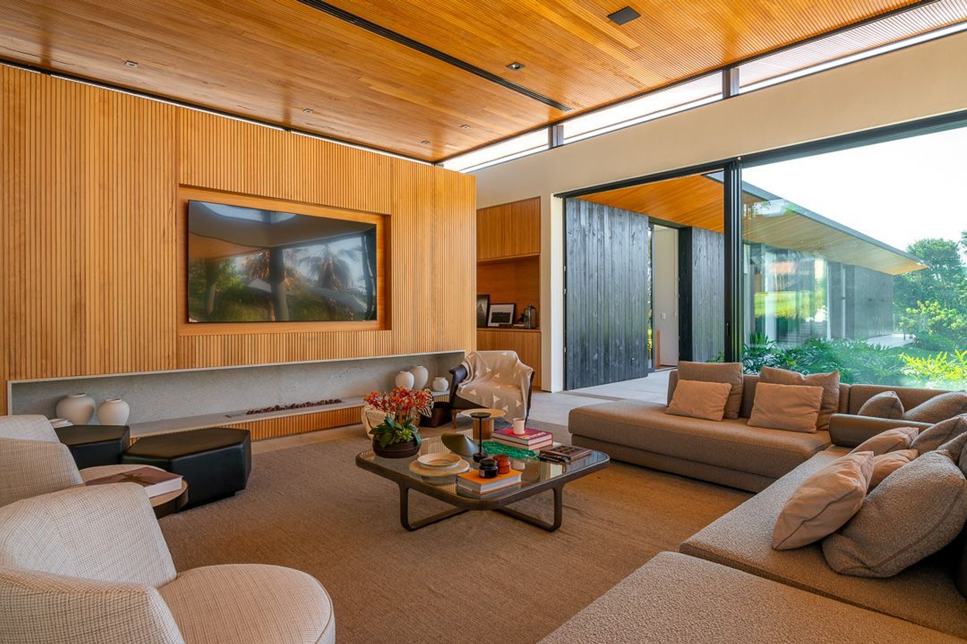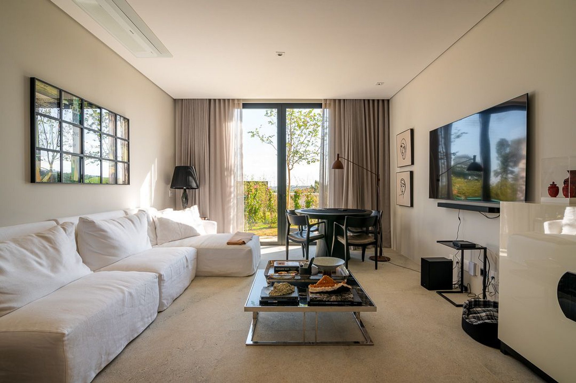 Ambientes arejados e bem iluminados; sala de jantar integrada à sala de estar/TV, à cozinha e ao espaço gourmet. Imensas portas de correr – que se abrem completamente – permitem a entrada de muita luz natural e a união do ambiente externo ao interno, trazendo a natureza para a decoração dos ambientes. Mobiliário contemporâneo e sofisticado e uma decoração elegante e minimalista.