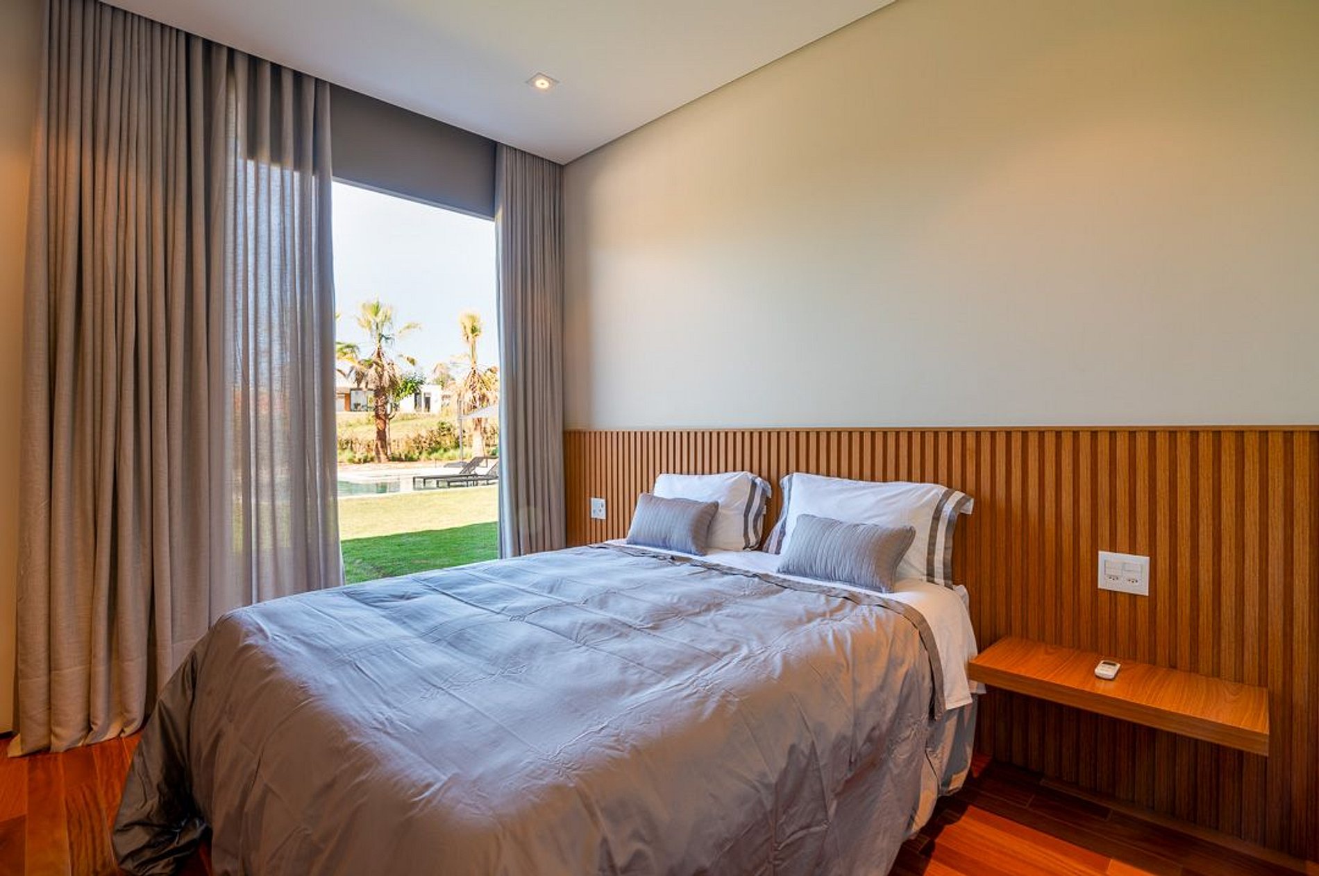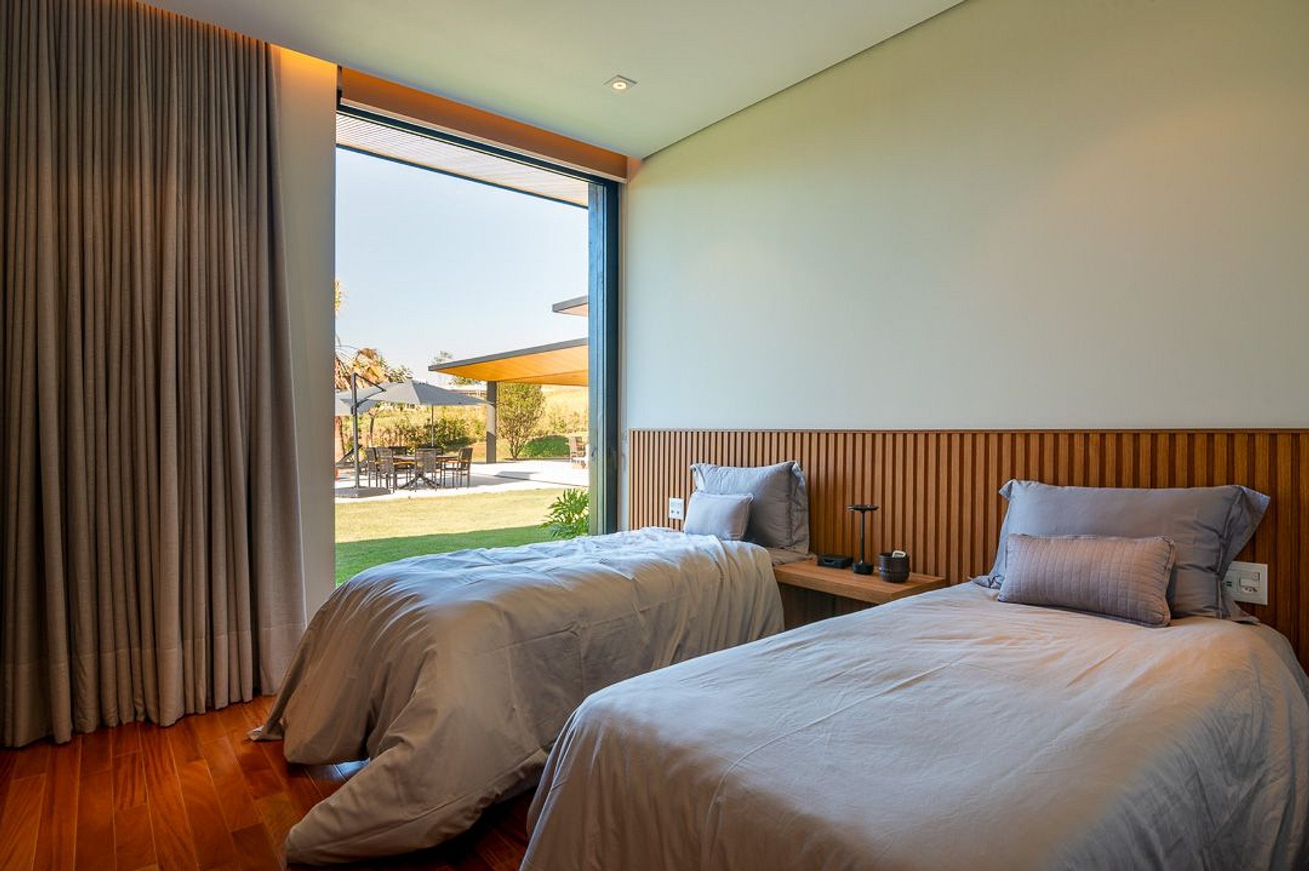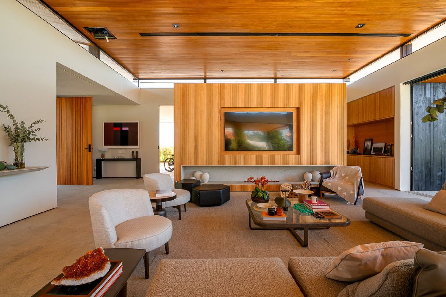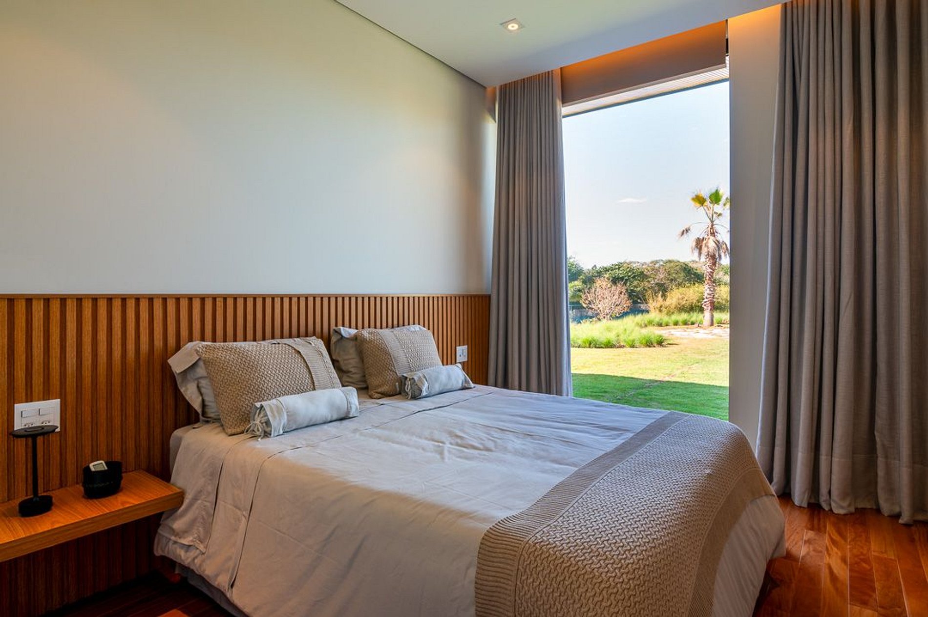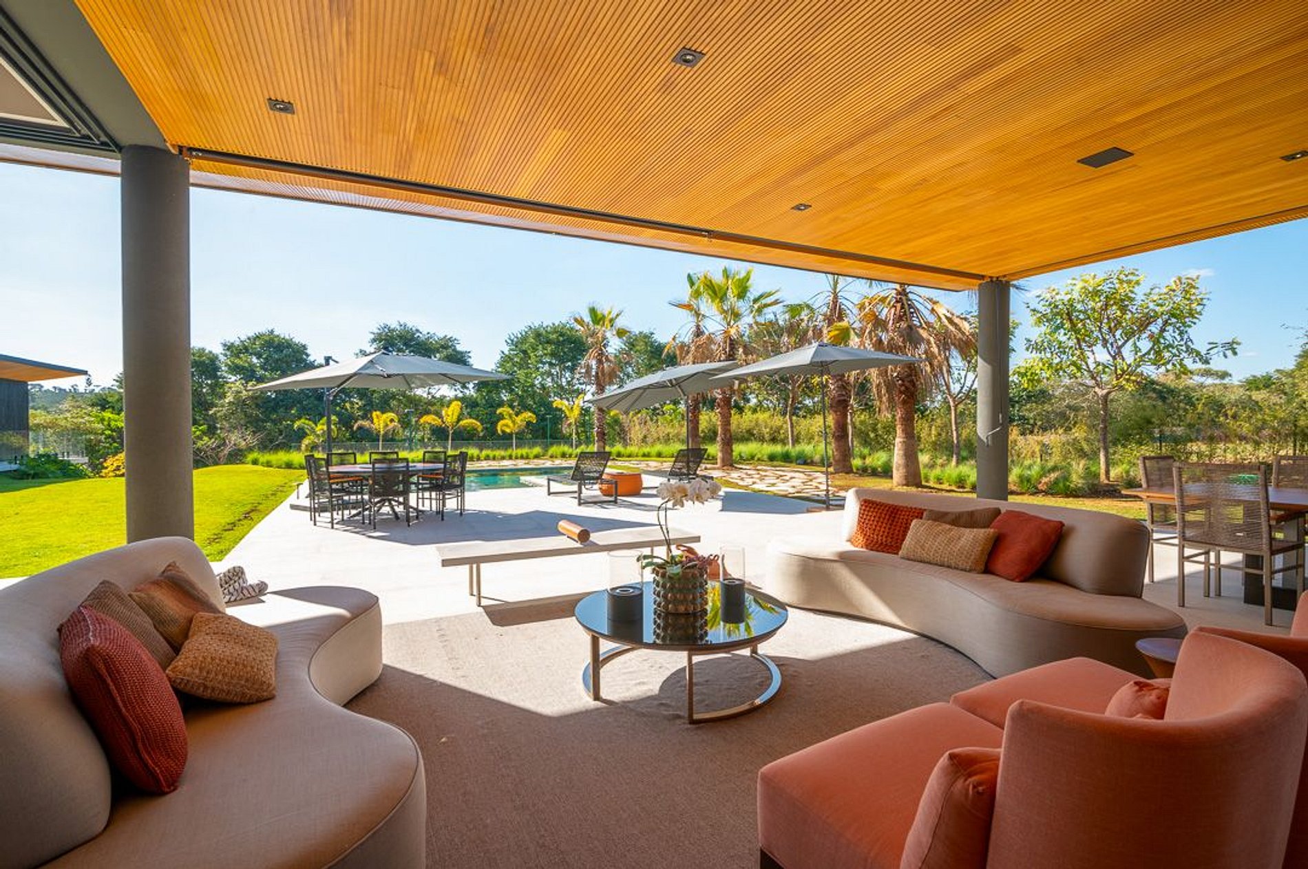 Ambientes arejados e bem iluminados; sala de jantar integrada à sala de estar/TV, à cozinha e ao espaço gourmet. Imensas portas de correr – que se abrem completamente – permitem a entrada de muita luz natural e a união do ambiente externo ao interno, trazendo a natureza para a decoração dos ambientes. Mobiliário contemporâneo e sofisticado e uma decoração elegante e minimalista.