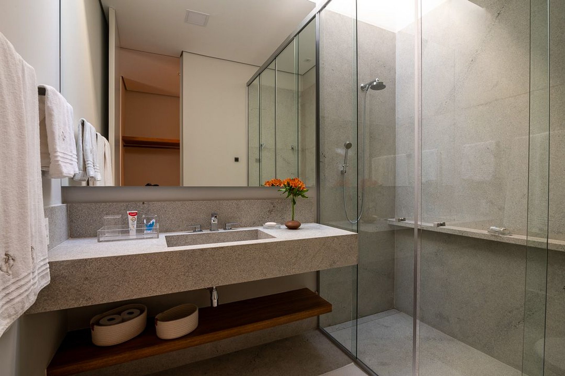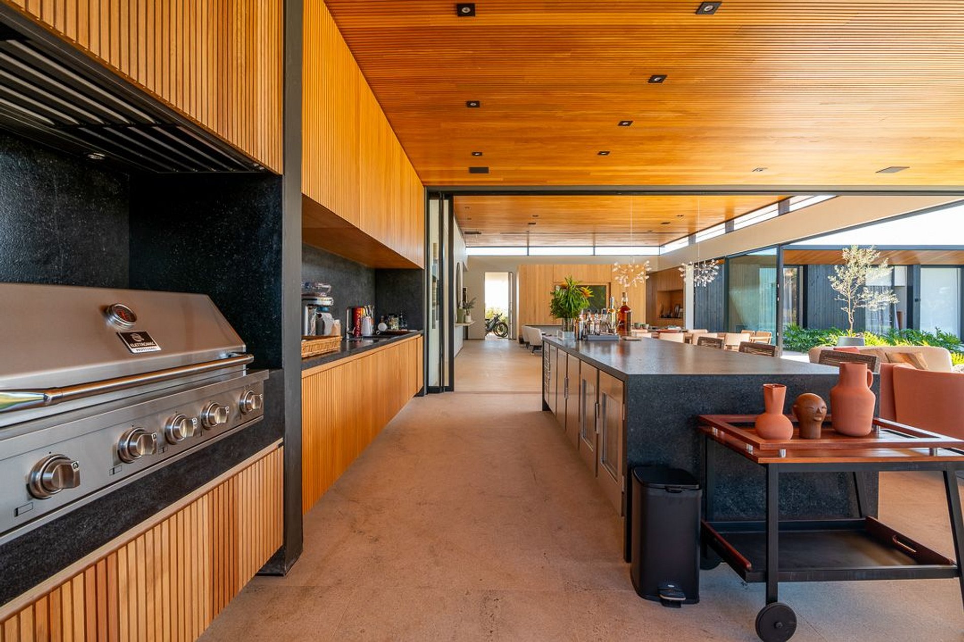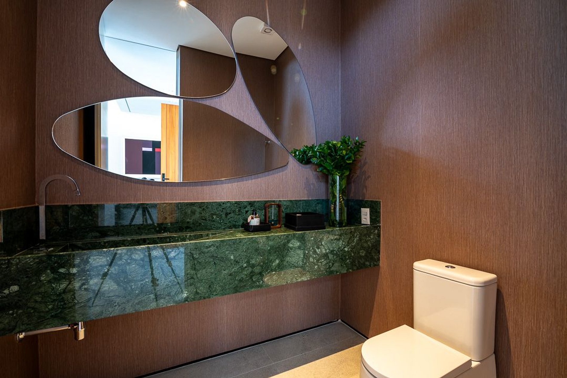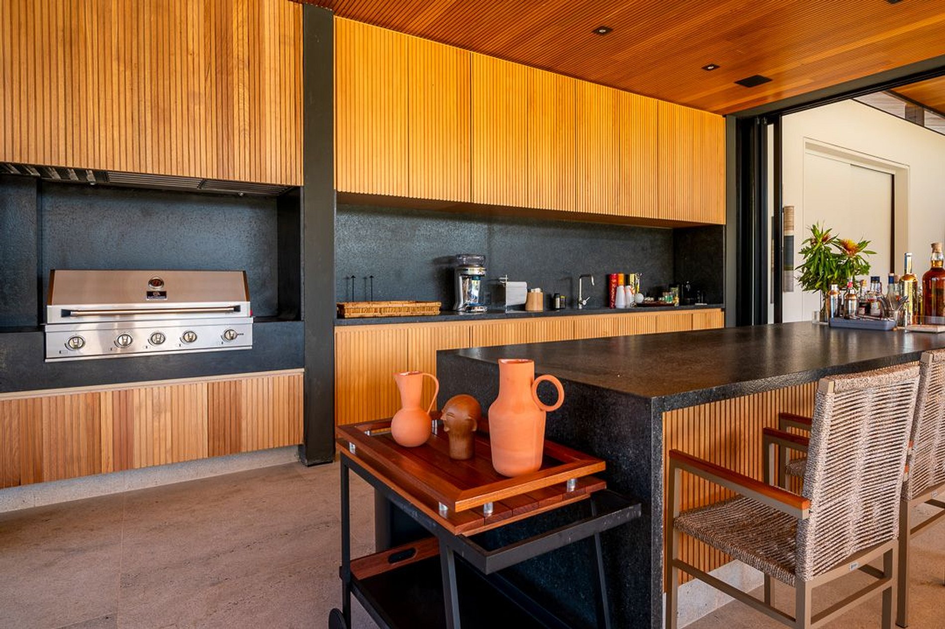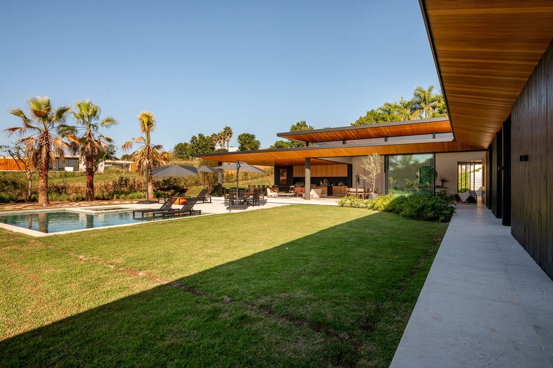 Ambientes arejados e bem iluminados; sala de jantar integrada à sala de estar/TV, à cozinha e ao espaço gourmet. Imensas portas de correr – que se abrem completamente – permitem a entrada de muita luz natural e a união do ambiente externo ao interno, trazendo a natureza para a decoração dos ambientes. Mobiliário contemporâneo e sofisticado e uma decoração elegante e minimalista.