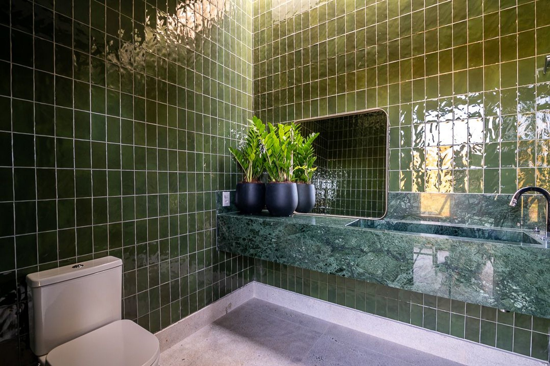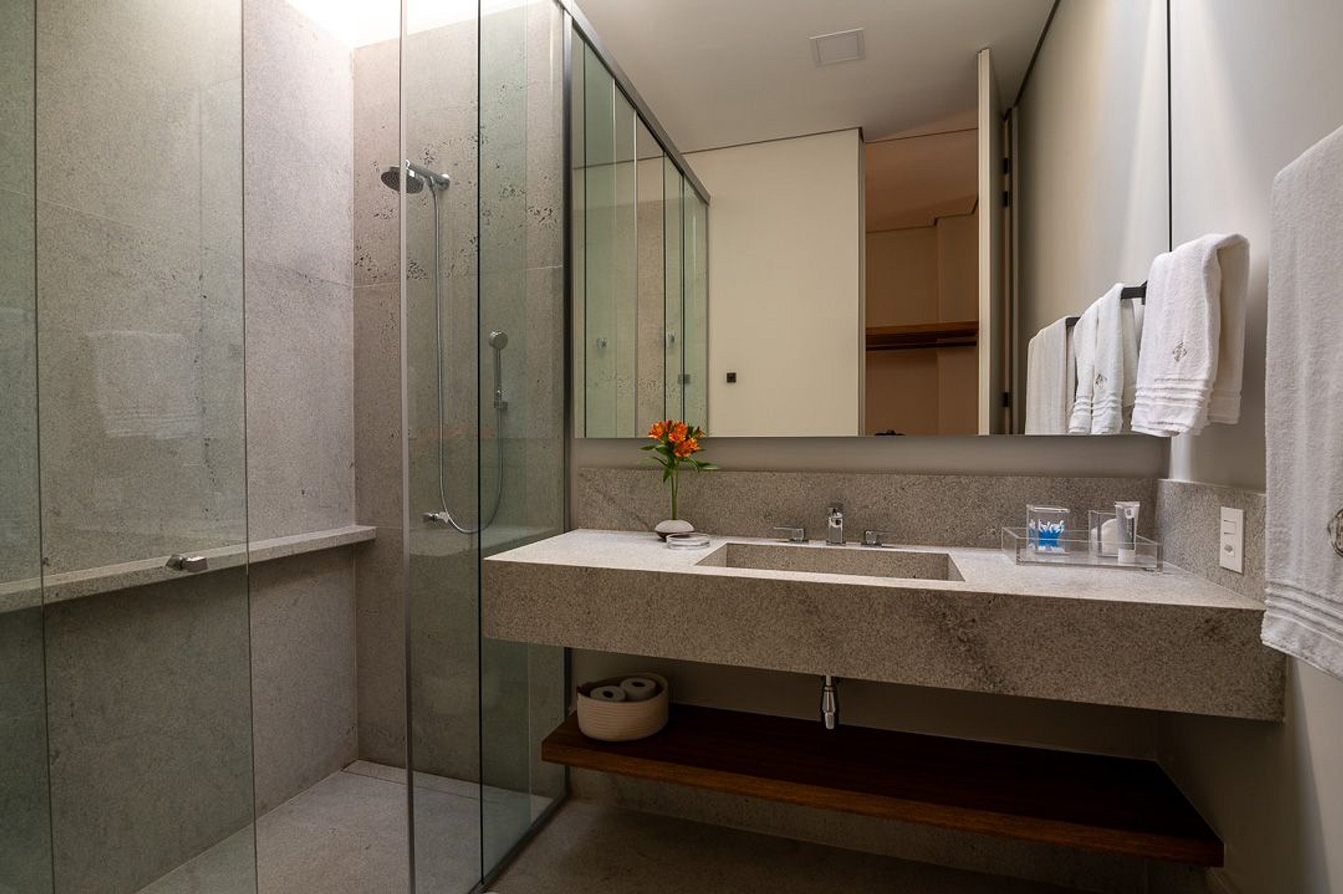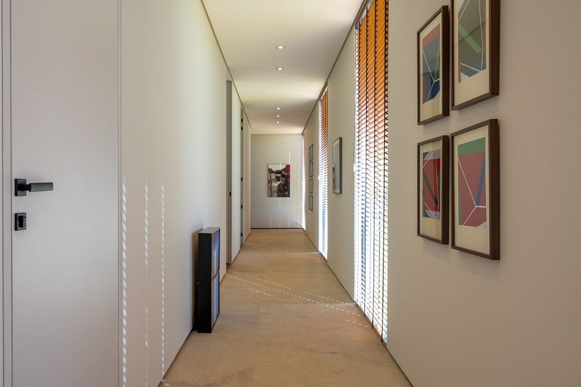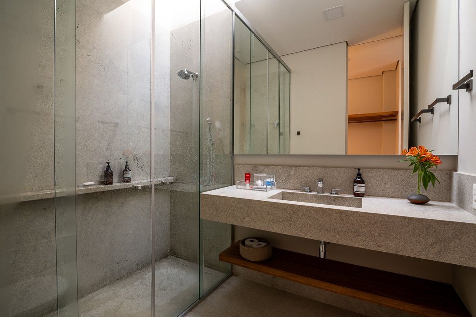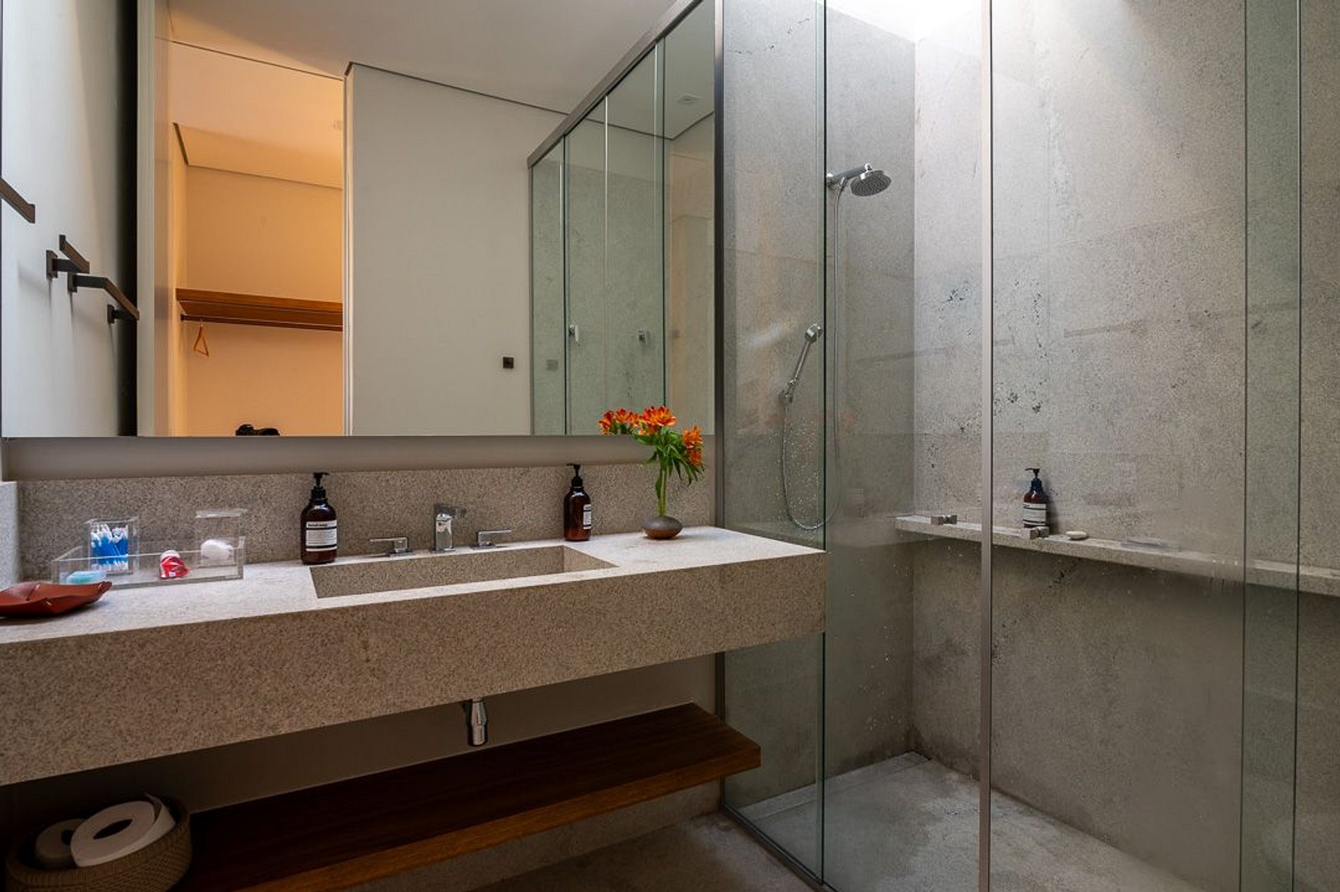 Ambientes arejados e bem iluminados; sala de jantar integrada à sala de estar/TV, à cozinha e ao espaço gourmet. Imensas portas de correr – que se abrem completamente – permitem a entrada de muita luz natural e a união do ambiente externo ao interno, trazendo a natureza para a decoração dos ambientes. Mobiliário contemporâneo e sofisticado e uma decoração elegante e minimalista.