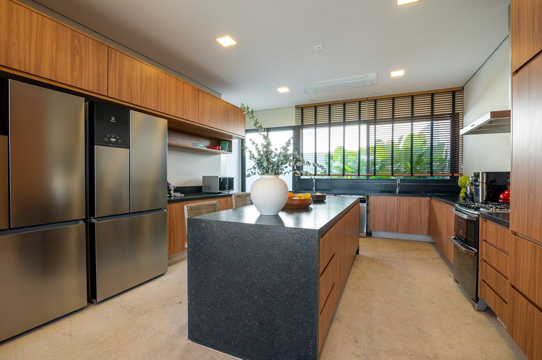 Ampla e bem iluminada, a cozinha é moderna e completa, repleta de armários e equipada com eletrodomésticos e eletroportáteis de primeira linha como cafeteira Nespresso, além de diversos utensílios culinários para o preparo de todos os tipos de refeições.