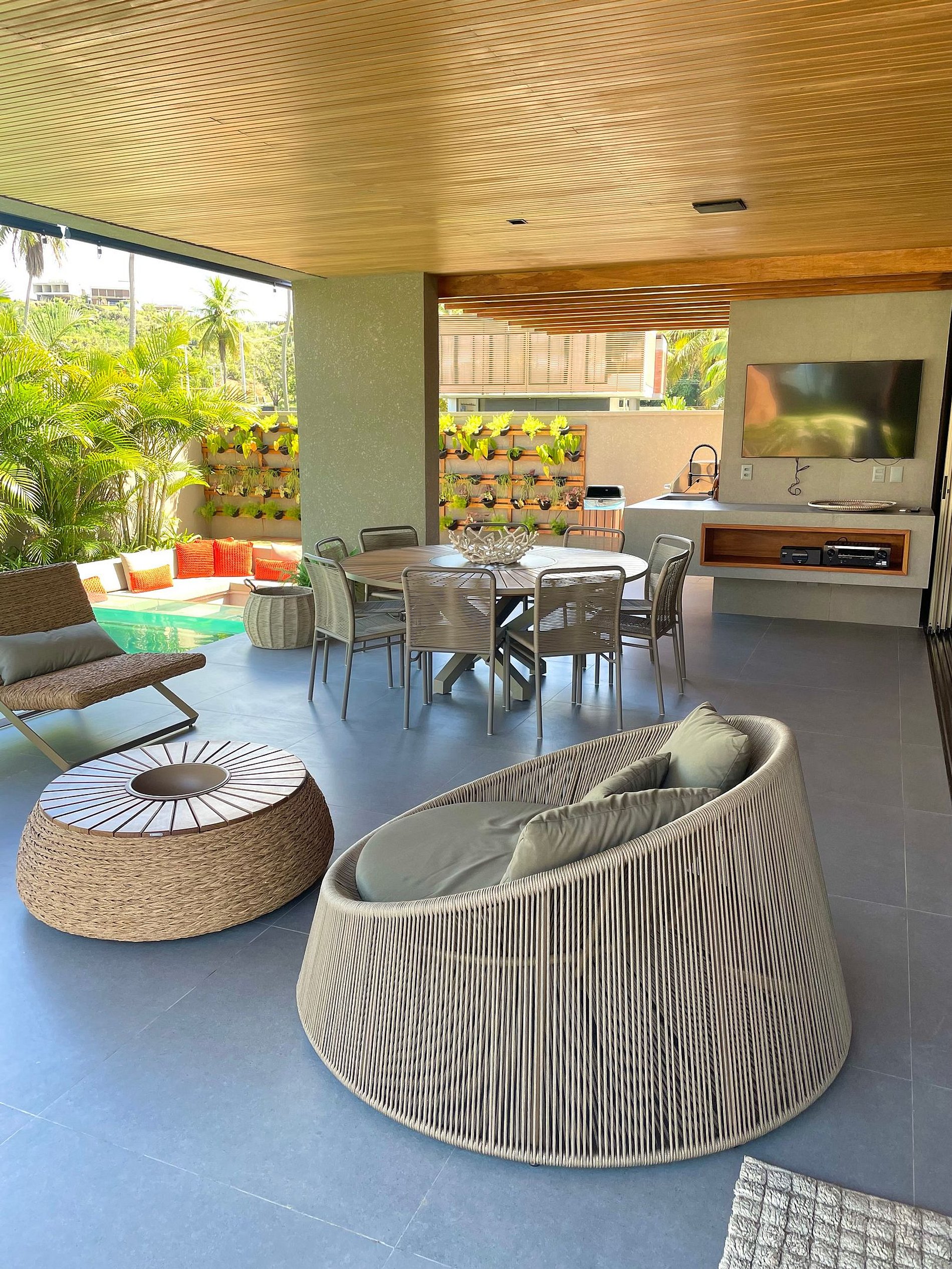 Ampla varanda com poltronas e uma mesa redonda para 10 pessoas, ideal para desfrutar de refeições leves e descontraídas! A poucos passos dali, já se tem a majestosa piscina aquecida, com hidromassagem e um lindo deck de madeira com confortáveis espreguiçadeiras para relaxar a beira d’água.