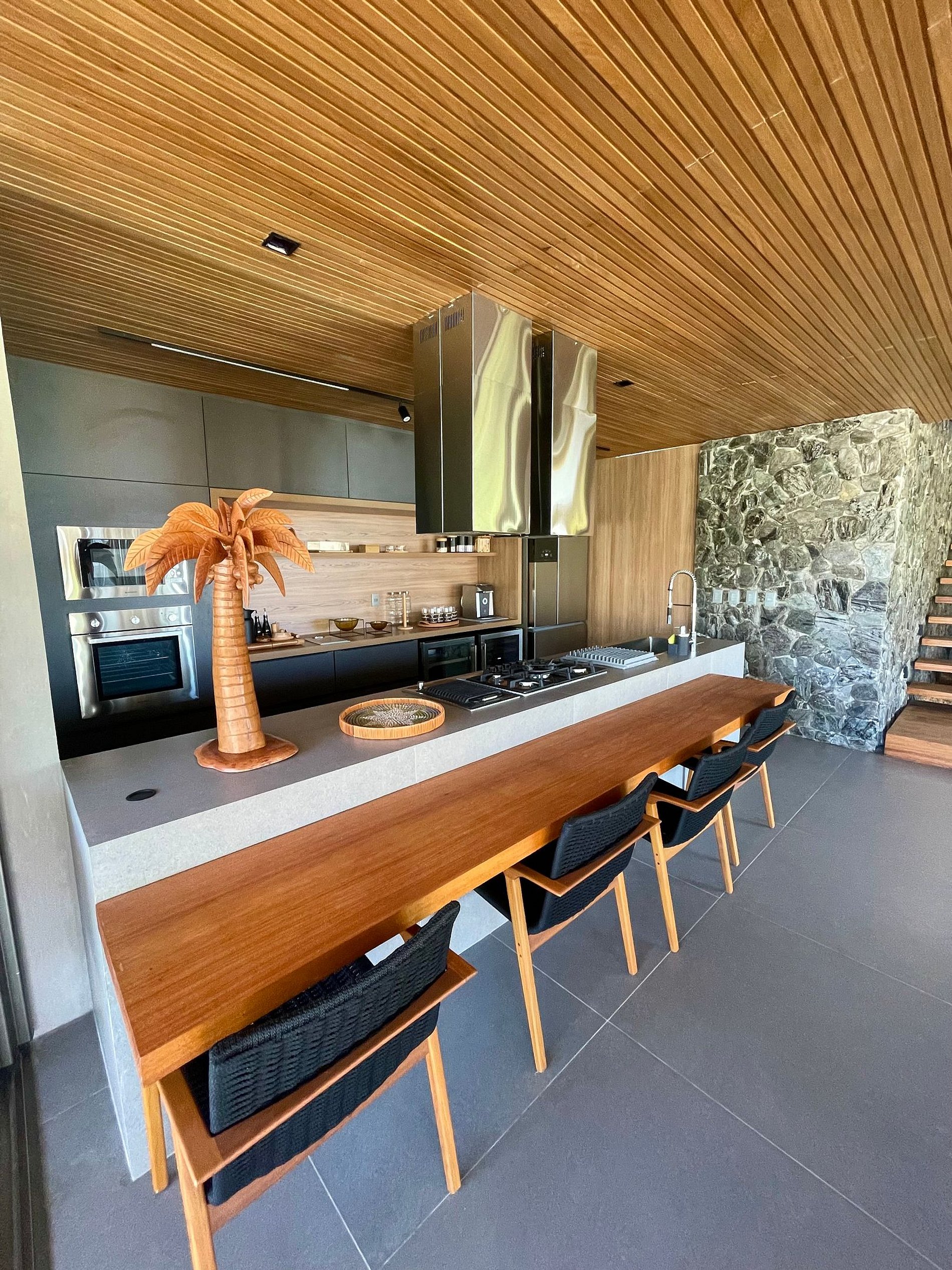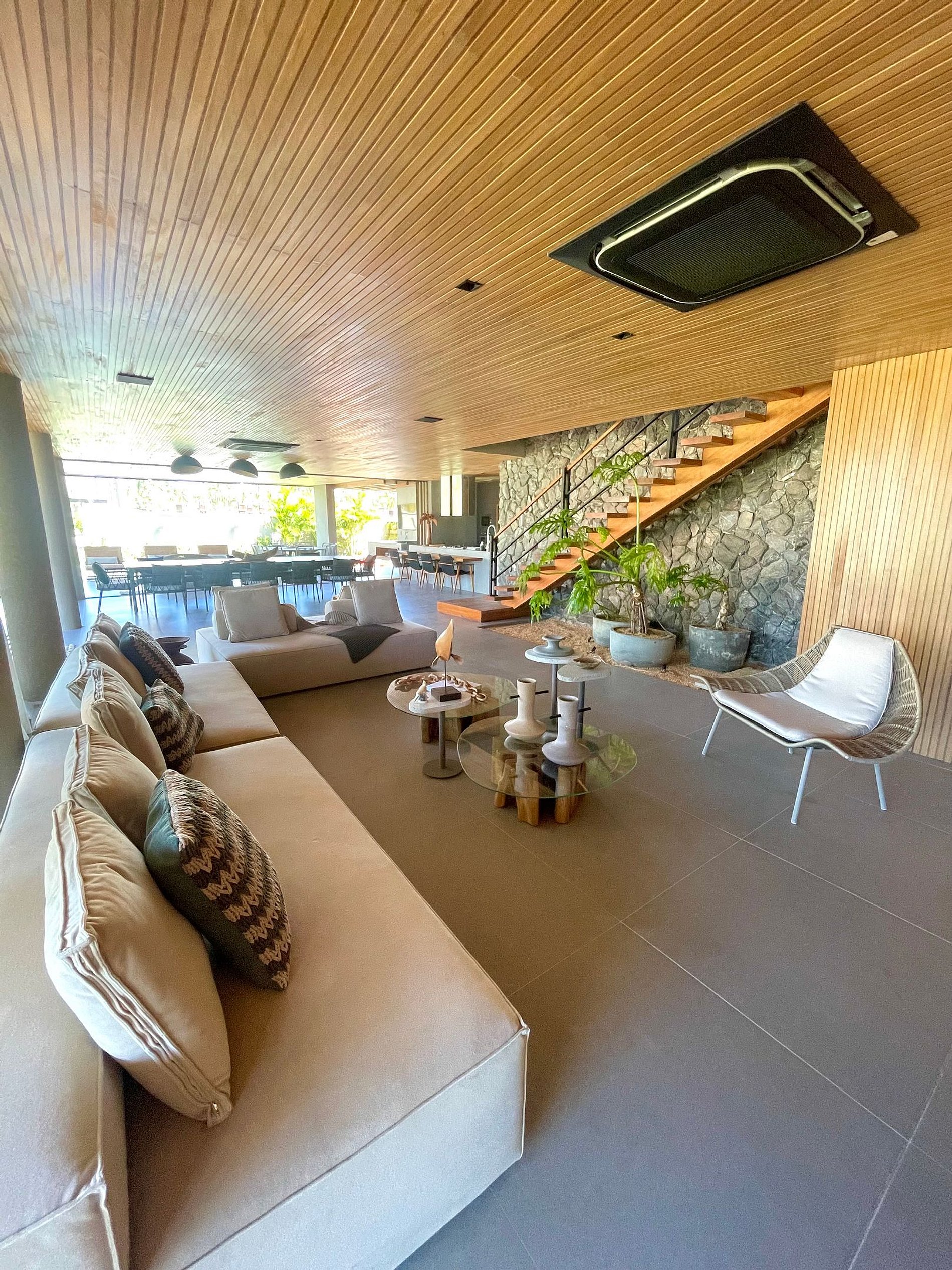 Ambientes arejados e bem iluminados; salas de jantar e estar/TV integradas, com acesso à varanda através de grandes portas de correr, que integram os ambientes e permitem a entrada de bastante luz natural. Mobiliário moderno e confortável e decoração elegante com elementos marcantes como parede de pedras e teto revestido em ripas de madeira que deixam o ambiente superaconchegante!