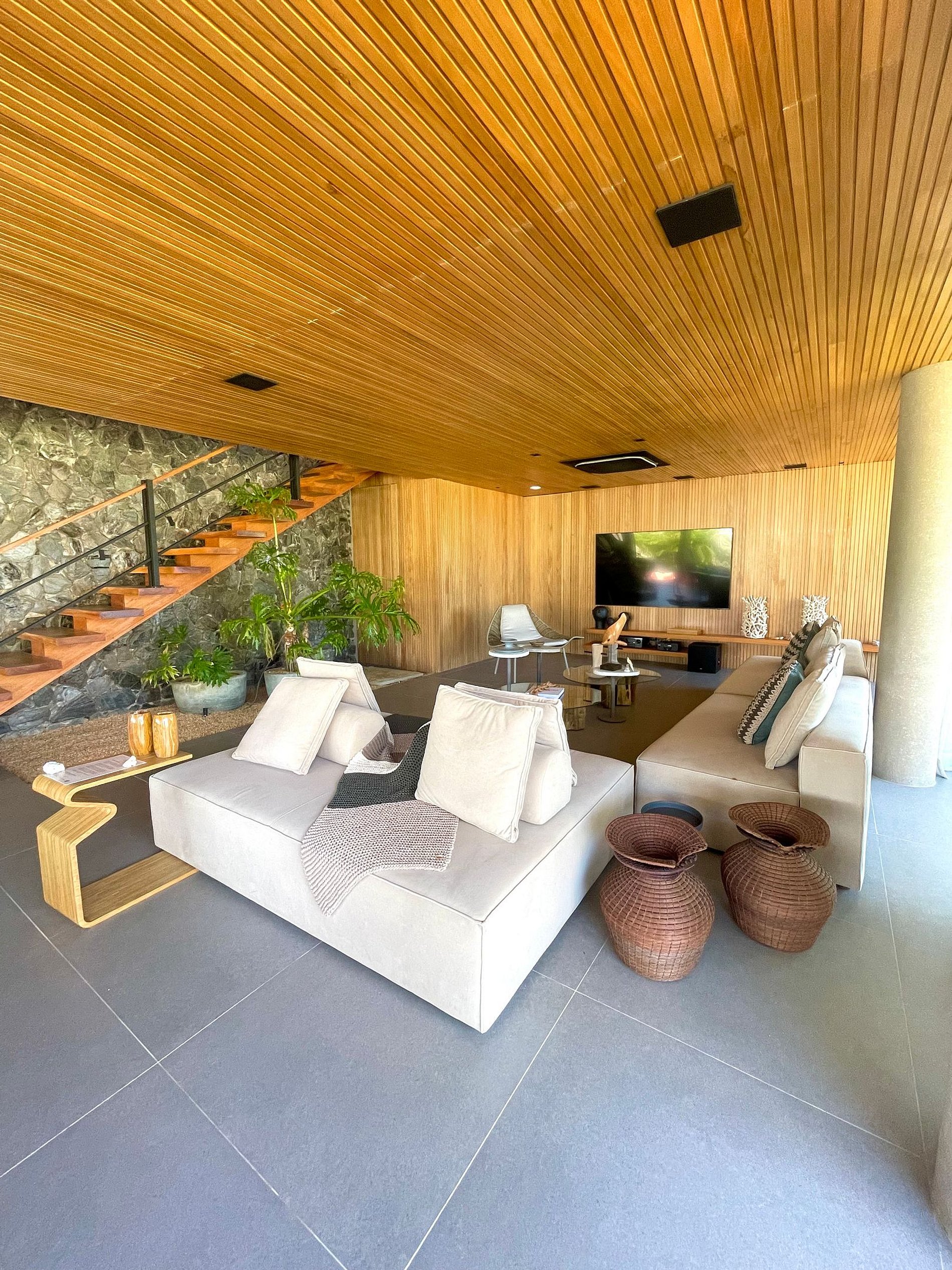 Ambientes arejados e bem iluminados; salas de jantar e estar/TV integradas, com acesso à varanda através de grandes portas de correr, que integram os ambientes e permitem a entrada de bastante luz natural. Mobiliário moderno e confortável e decoração elegante com elementos marcantes como parede de pedras e teto revestido em ripas de madeira que deixam o ambiente superaconchegante!