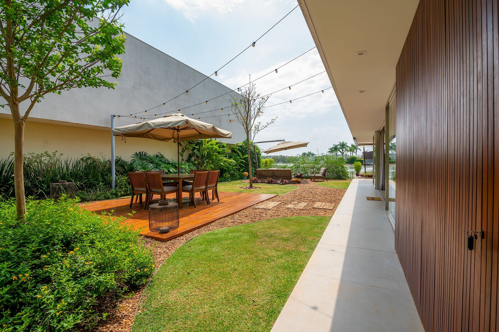 Na lateral da casa, há um espaço com três ambientes, sendo uma sala de estar externa com sofá, poltronas e um ombrelone; um deck com uma mesa para 08 pessoas, e um quarto ombrellone, ideal para desfrutar de refeições leves com familiares e amigos; e um redário. A iluminação externa e o fire pit (lareira externa) tornam o jardim o local perfeito para noites agradáveis em qualquer um desses vários ambientes.
