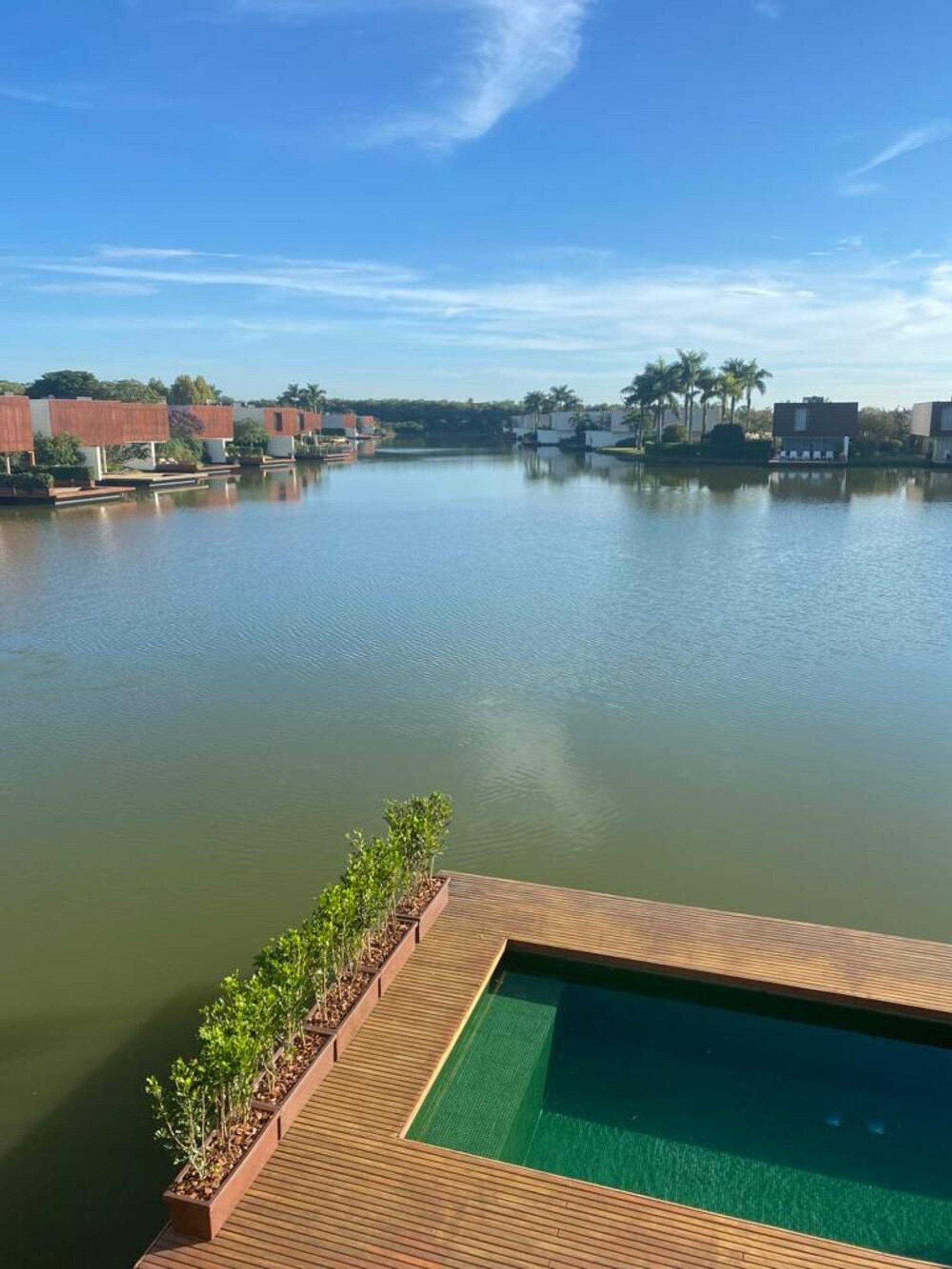 Varanda com sofá e lindas cadeiras suspensas, todos voltados para a piscina e para o lago. A piscina é revestida com pastilhas esverdeadas e cercada por um belo deck de madeira com espreguiçadeiras e ombrelones, tornando o espaço perfeito para relaxar e descansar.