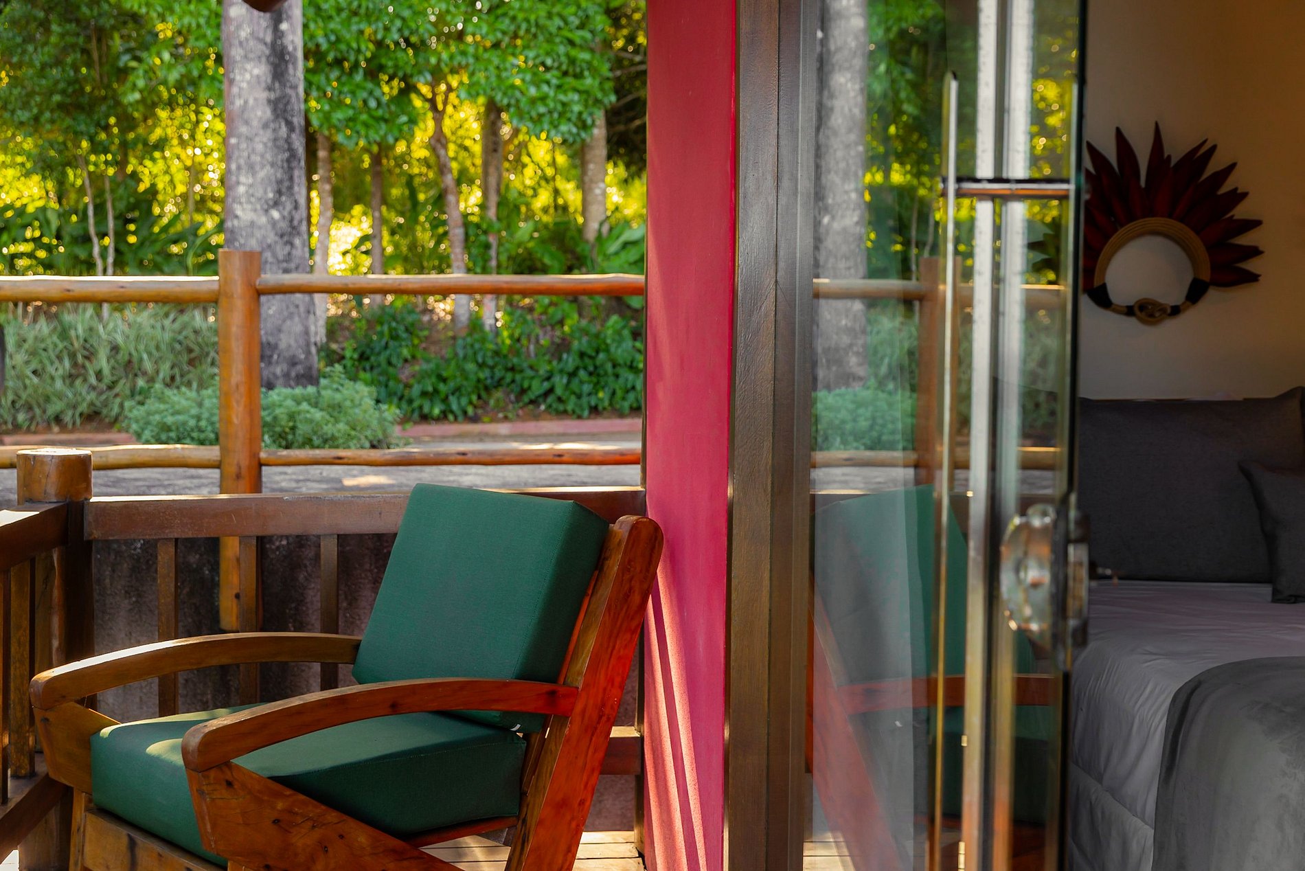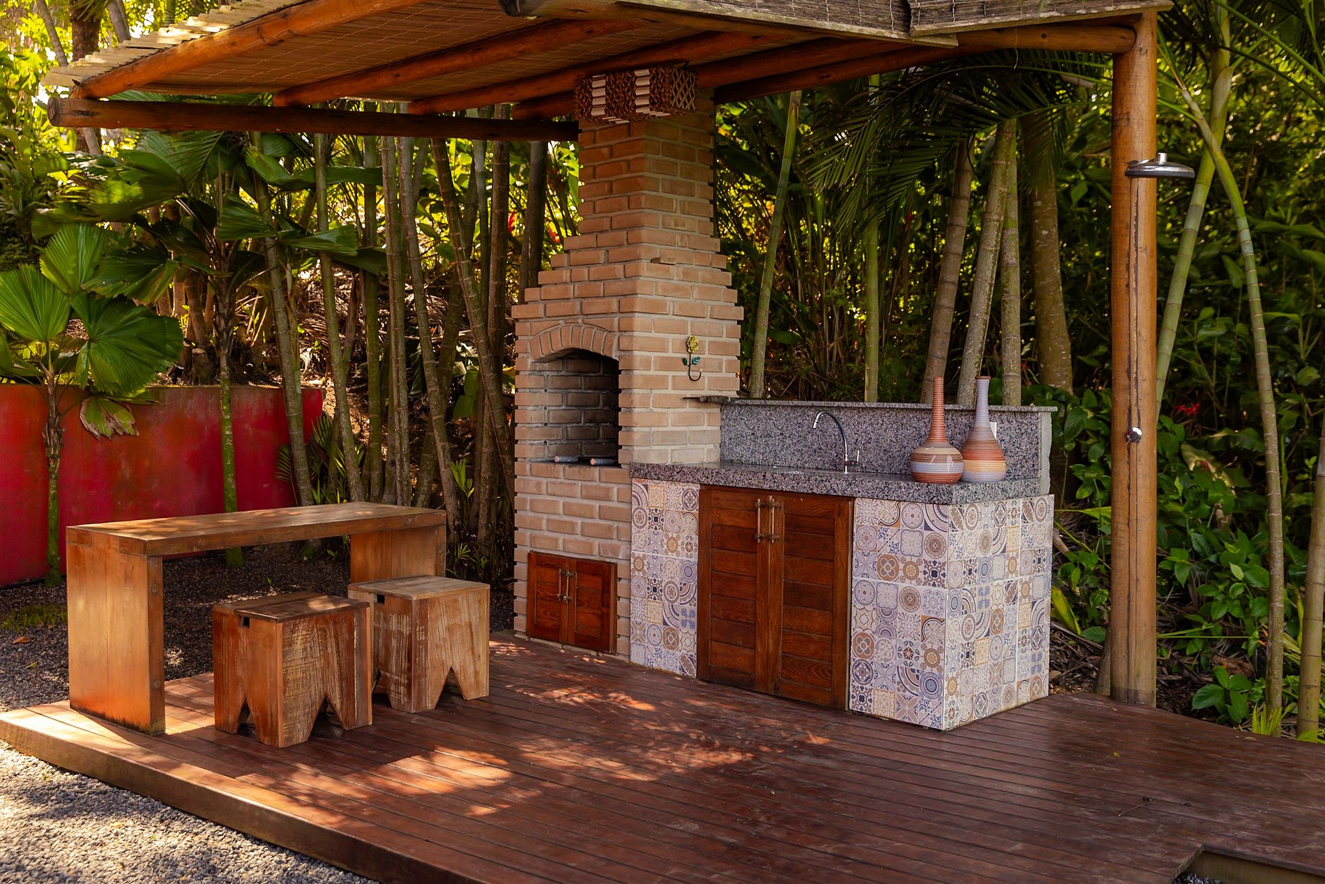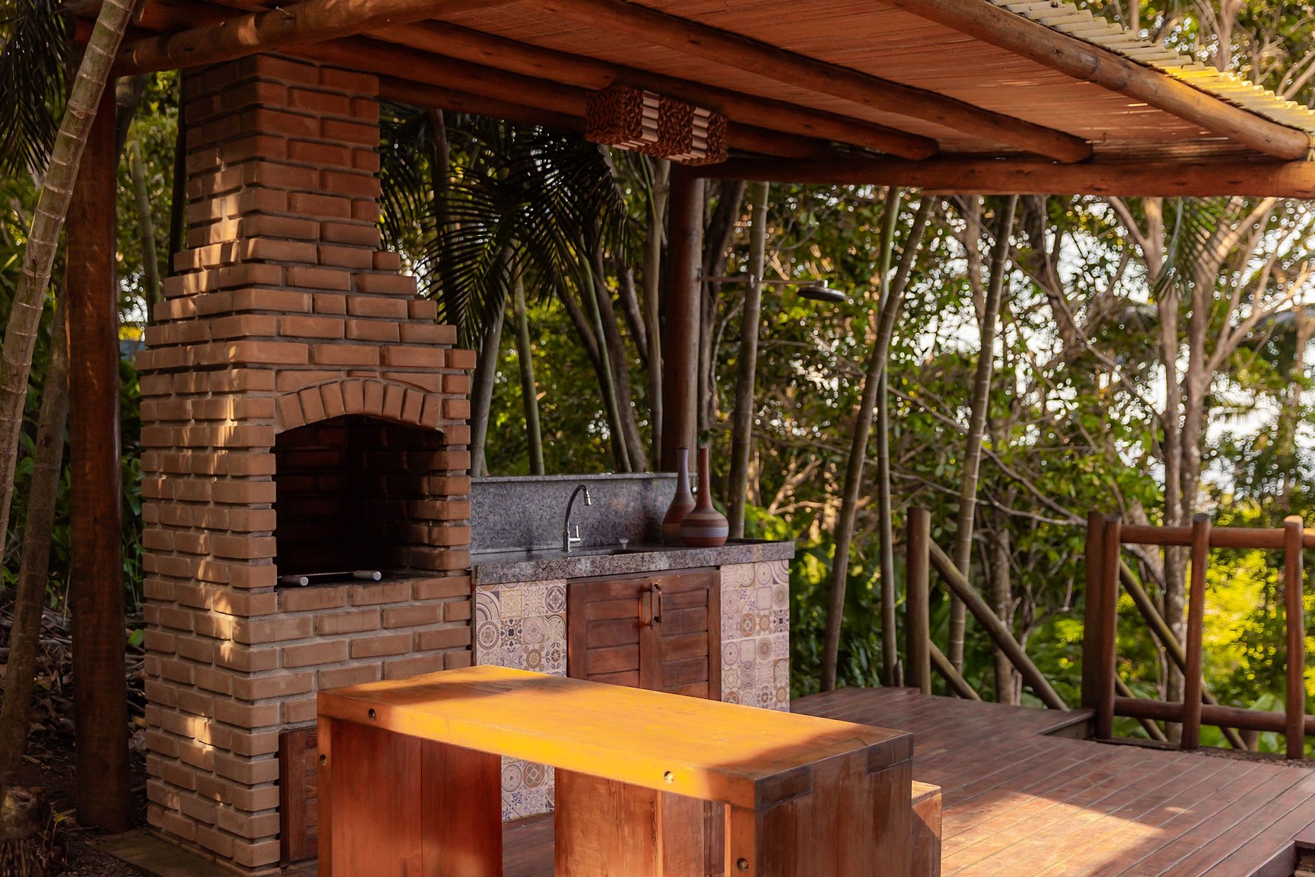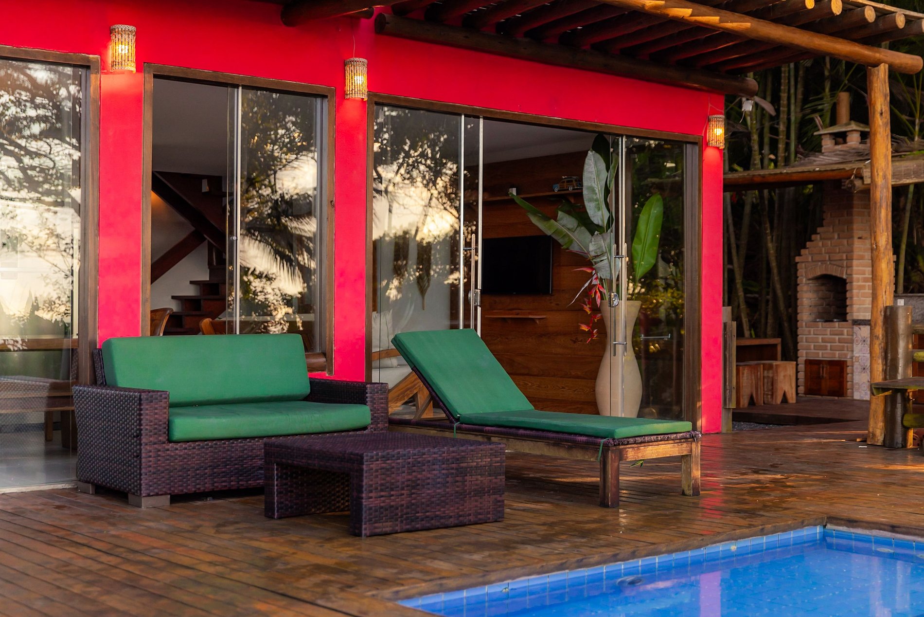Linda varanda de madeira, com sofá e espreguiçadeira confortáveis voltadas para a piscina e para a maravilhosa vista que rodeia a casa. A casa conta ainda com uma área gourmet coberta com churrasqueira, pia e área de apoio.