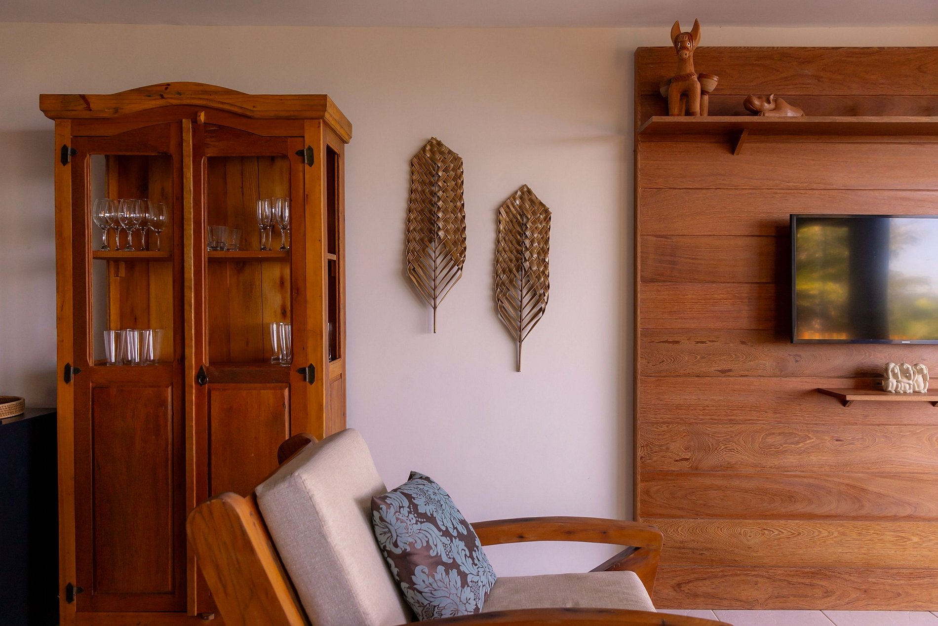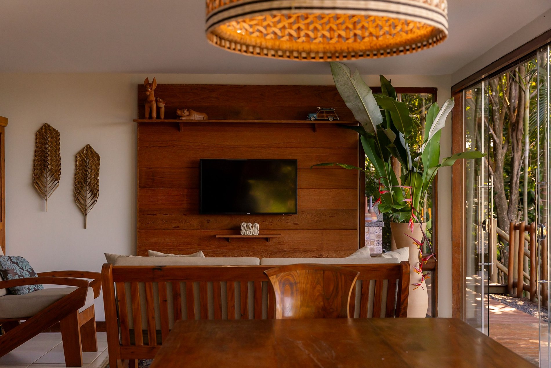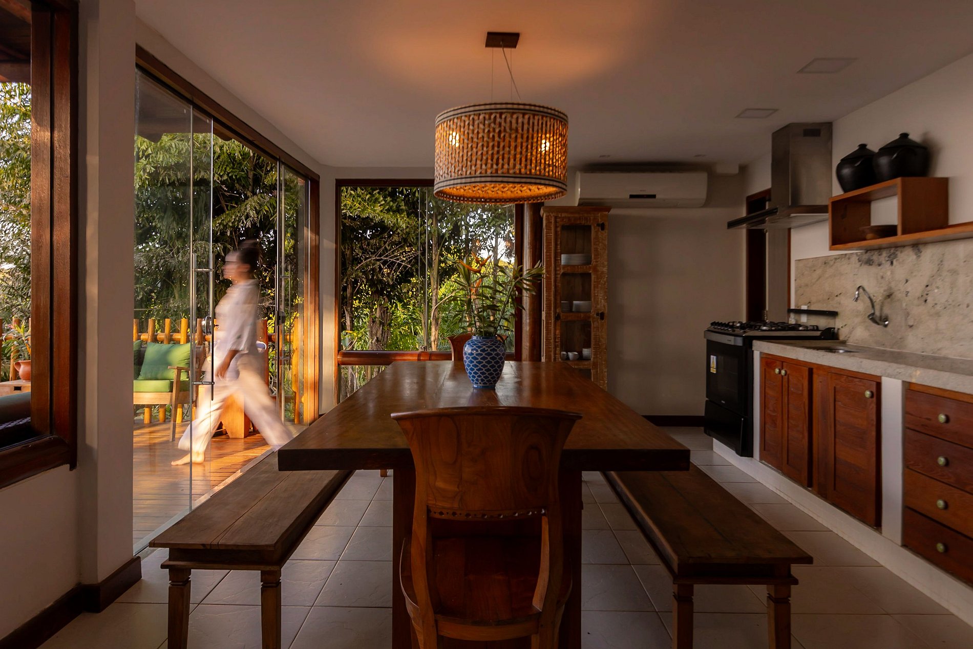 Ambientes arejados e bem iluminados; sala de estar/TV integrada com a cozinha que possui uma bela mesa de madeira para 08 pessoas. Grandes portas de vidro permitem a entrada de bastante luz natural e dão acesso à varanda e à área externa da casa. Mobiliada e decorada com elementos que unem a rusticidade à elegância, mantendo o estilo praiano.