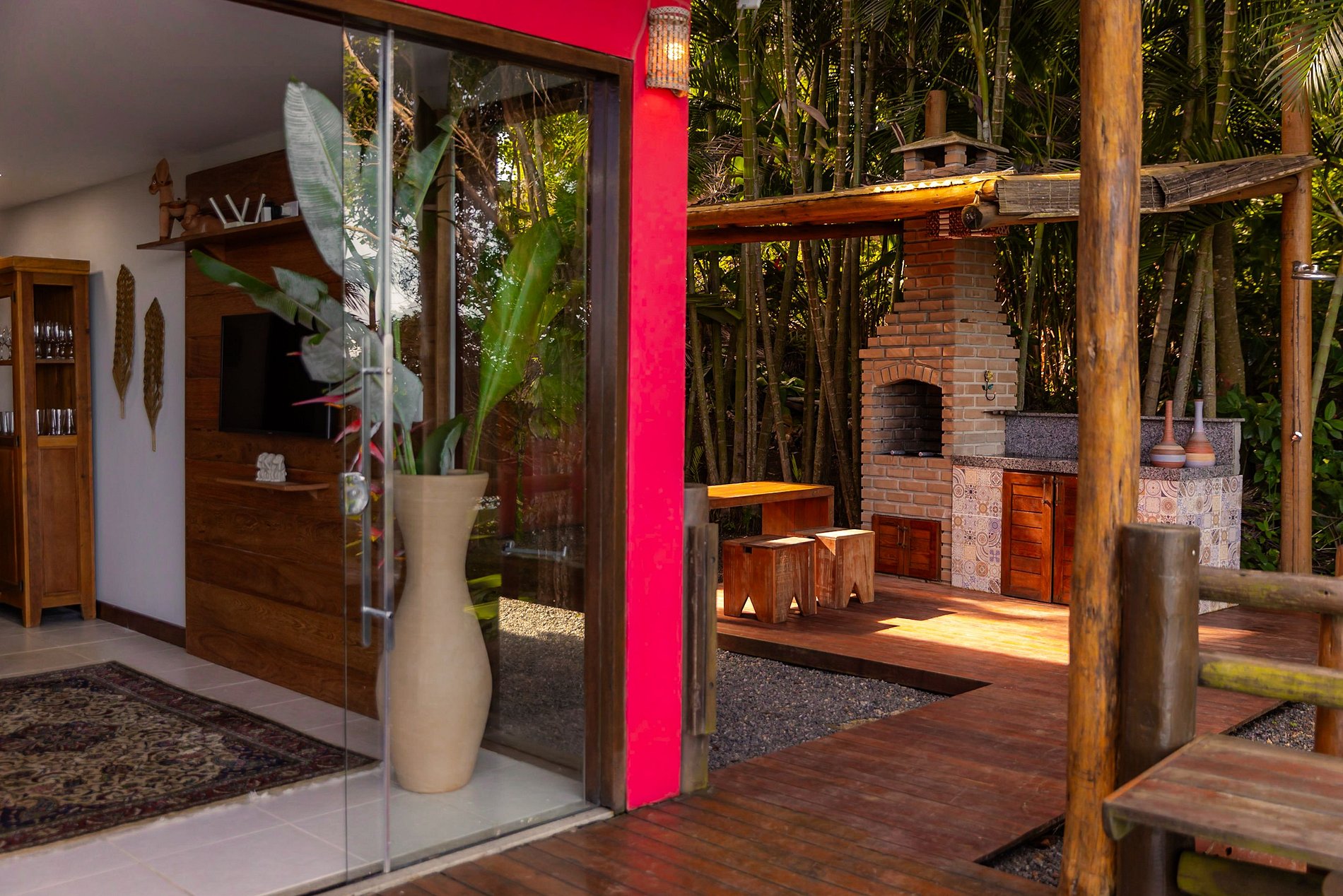 Ambientes arejados e bem iluminados; sala de estar/TV integrada com a cozinha que possui uma bela mesa de madeira para 08 pessoas. Grandes portas de vidro permitem a entrada de bastante luz natural e dão acesso à varanda e à área externa da casa. Mobiliada e decorada com elementos que unem a rusticidade à elegância, mantendo o estilo praiano.