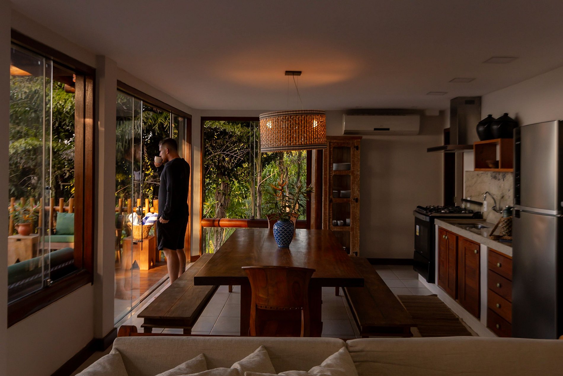 Bem iluminada e integrada à sala de TV, a cozinha conta com armários, eletrodomésticos e eletroportáteis de primeira linha como cafeteira Nespresso, além de utensílios necessários para todo tipo de refeição.