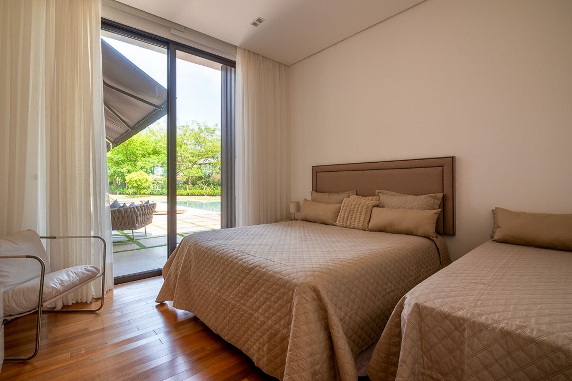 A área externa da casa é um espetáculo, com o espaço gourmet com churrasqueira e cooktop, piscina com sistema de aquecimento solar, campo de futebol, quadra de beach tênis, brinquedoteca e jardim com paisagismo deslumbrante.