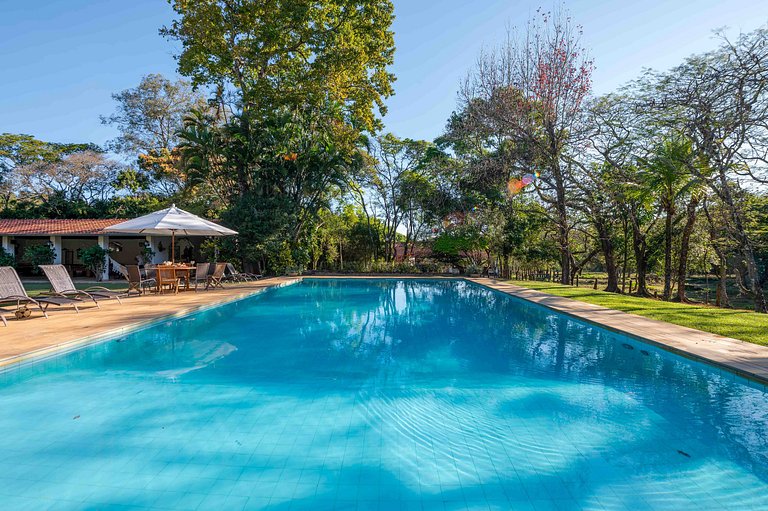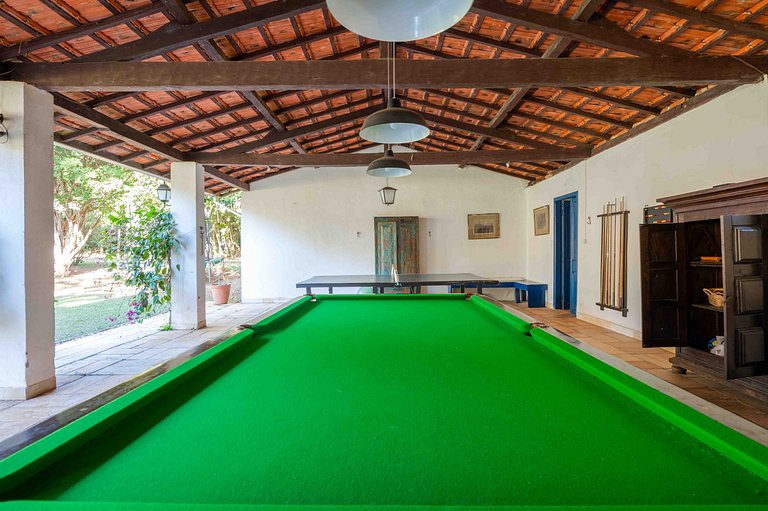 Além da sede, a propriedade oferece áreas de lazer recém-construídas, incluindo duas modernas quadras de areia para beach tênis e futevôlei, uma quadra de tênis, um pavilhão de 180m² com piscina, sauna, copa e churrasqueira, além de uma charmosa casa de hóspedes com dois quartos e um banheiro (64m²).