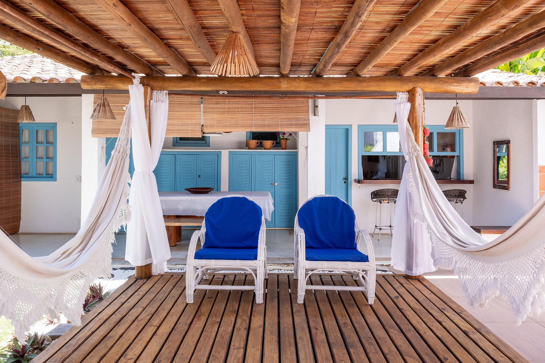 O jardim abriga uma área gourmet com churrasqueira e uma grande mesa de madeira, ideal para confraternizações e momentos descontraídos com família e amigos. A casa também conta com um agradável redário — perfeito para relaxar após um dia de sol e mar.
