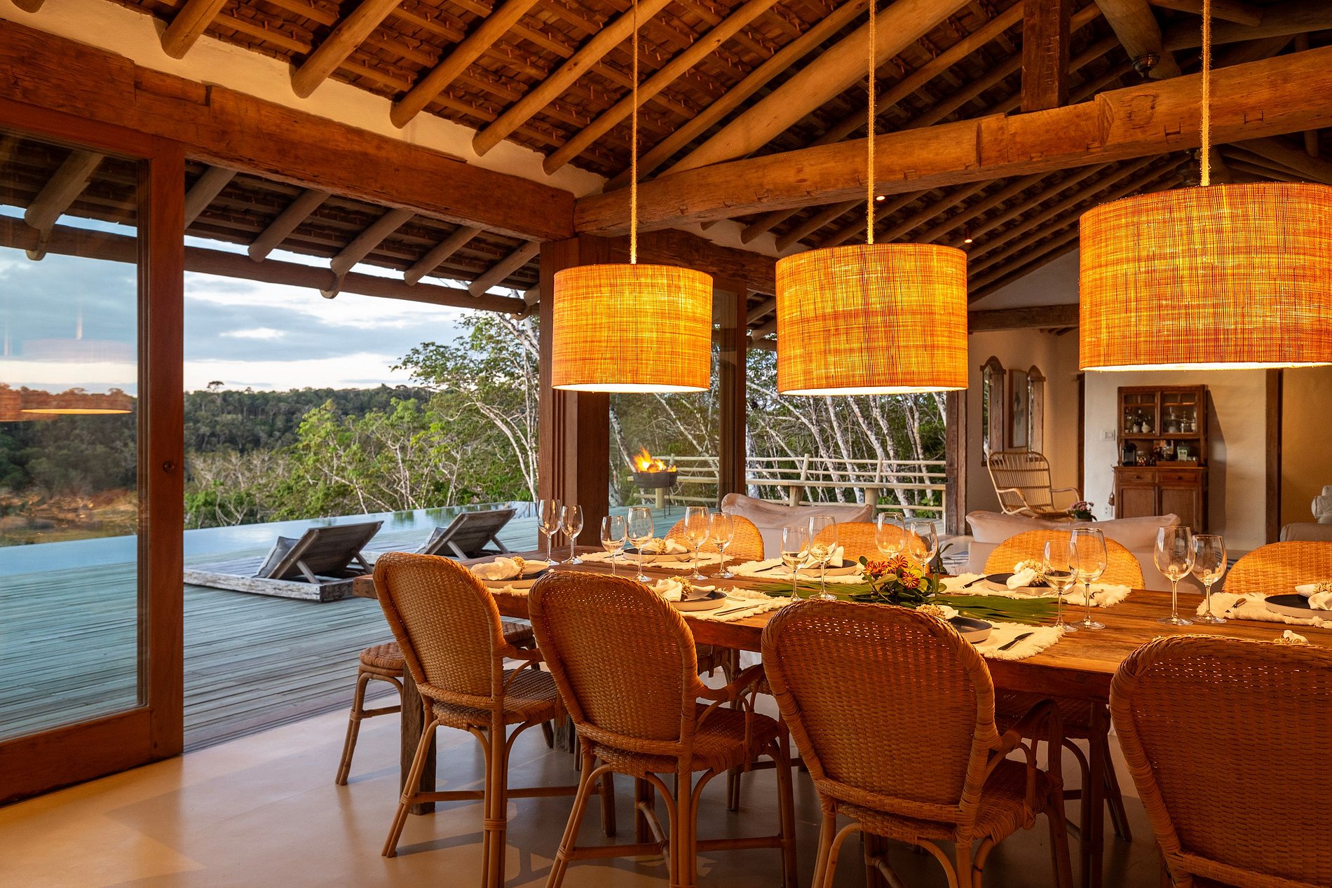 Com arquitetura rústica sofisticada, em perfeita harmonia com a paisagem ao redor, a casa oferece ambientes acolhedores e elegantes. A sala de estar conta com amplos sofás, ideais para momentos de convivência enquanto se aprecia a vista para a mata. Já a sala de jantar possui uma charmosa mesa de madeira com dez lugares, convidando a refeições descontraídas em família ou entre amigos.