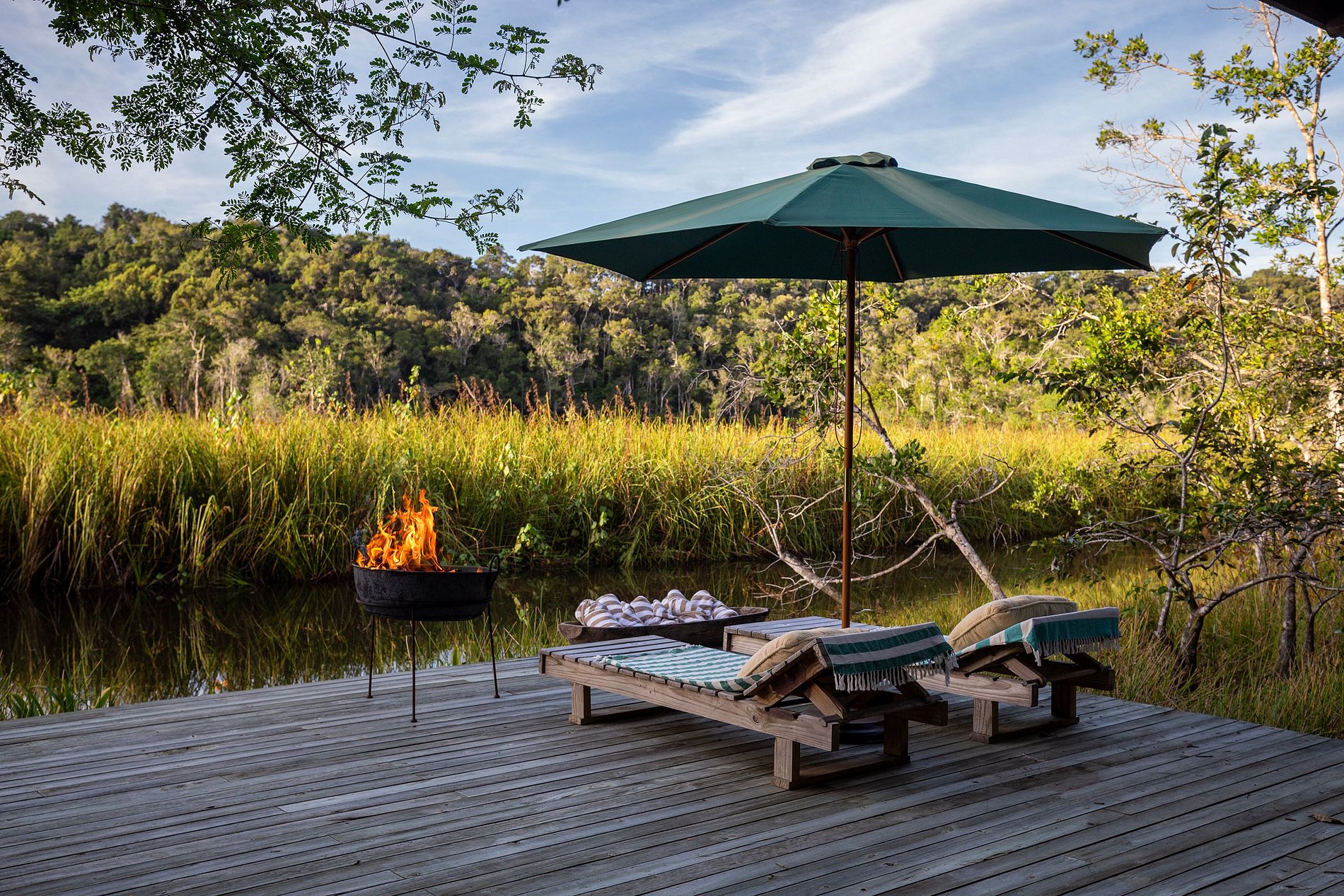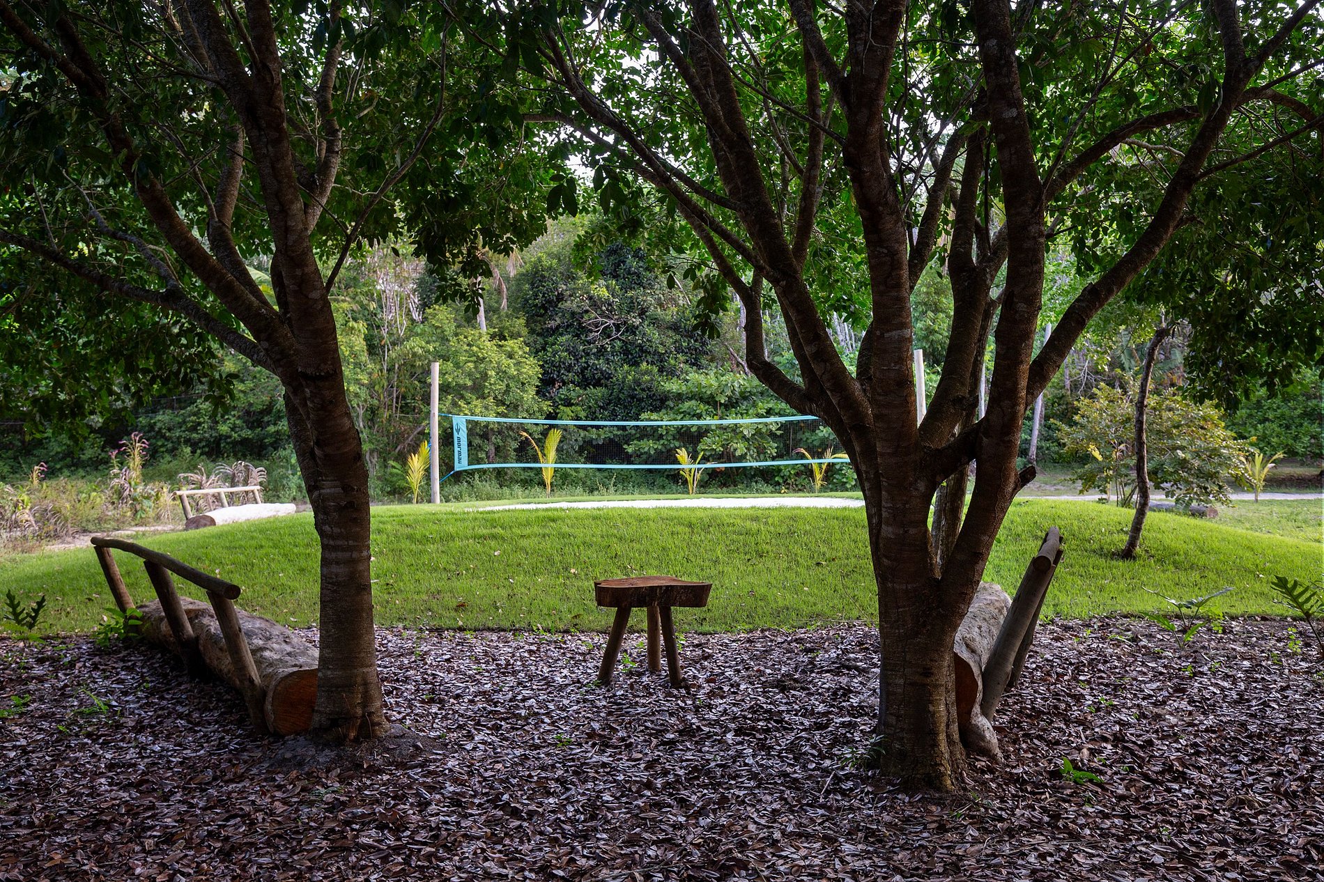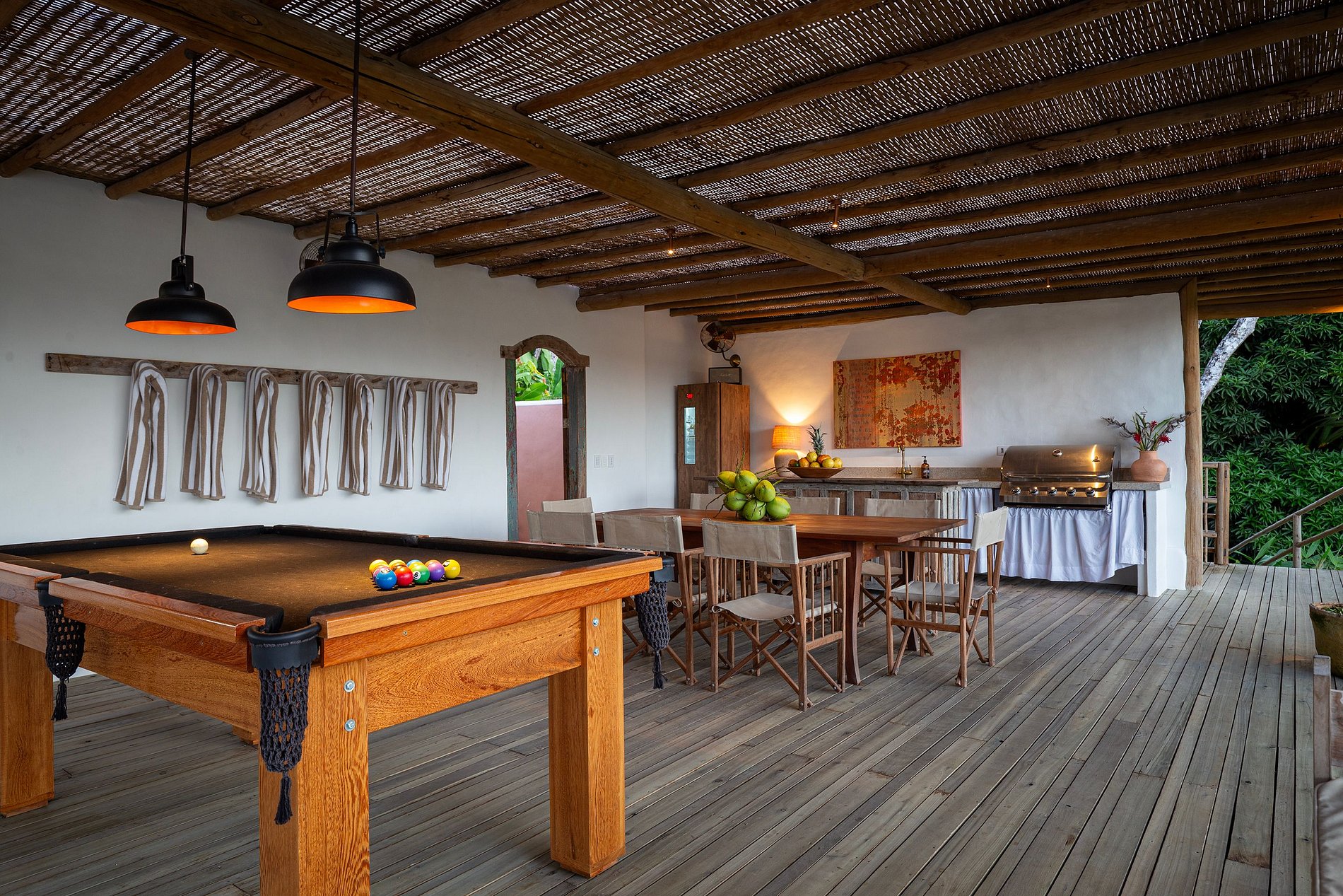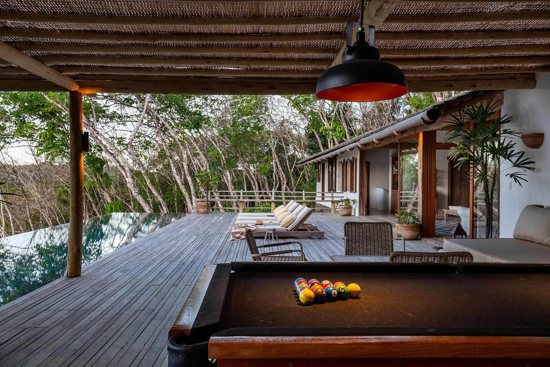 A área de lazer foi cuidadosamente pensada para proporcionar experiências únicas. A área gourmet é equipada com churrasqueira, cervejeira, máquina de gelo e mesa de sinuca, perfeita para momentos de descontração. A piscina de borda infinita se abre para um deck deslumbrante com vista panorâmica sobre o vale do Rio da Barra. Para os amantes de esportes, a propriedade conta ainda com uma quadra de beach tênis. À beira do rio, um charmoso deck privativo com caiaques convida a passeios inesquecíveis pelas águas tranquilas.