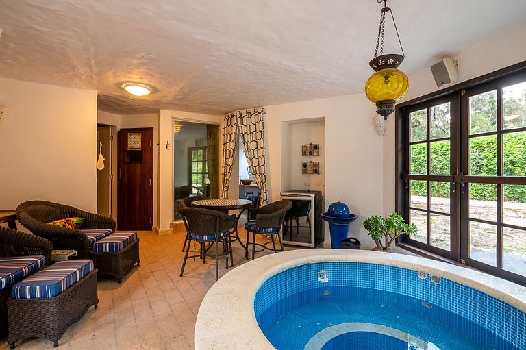 Residência com ampla área social dividida em vários ambientes, sendo salas de estar – duas delas com lareira –; sala de jantar clara e funcional, com mesa para 10 pessoas; sala de TV mais reservada e um home theater. A casa conta também com spa com sauna seca, jacuzzi para 06 pessoas (aquecimento contratado à parte) e 02 vestiários completos. Mobiliário elegante e confortável, e decoração clássica e sofisticada.