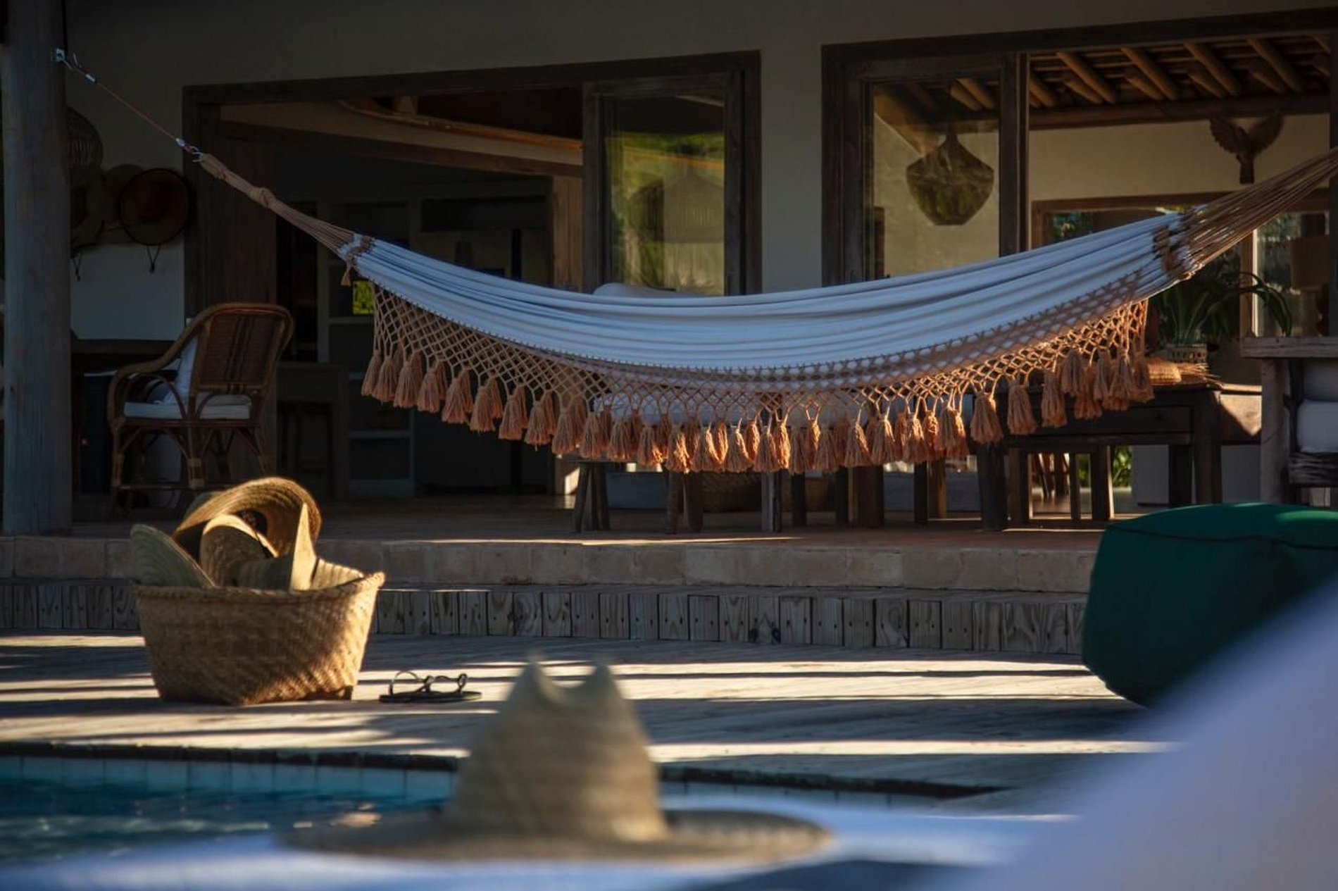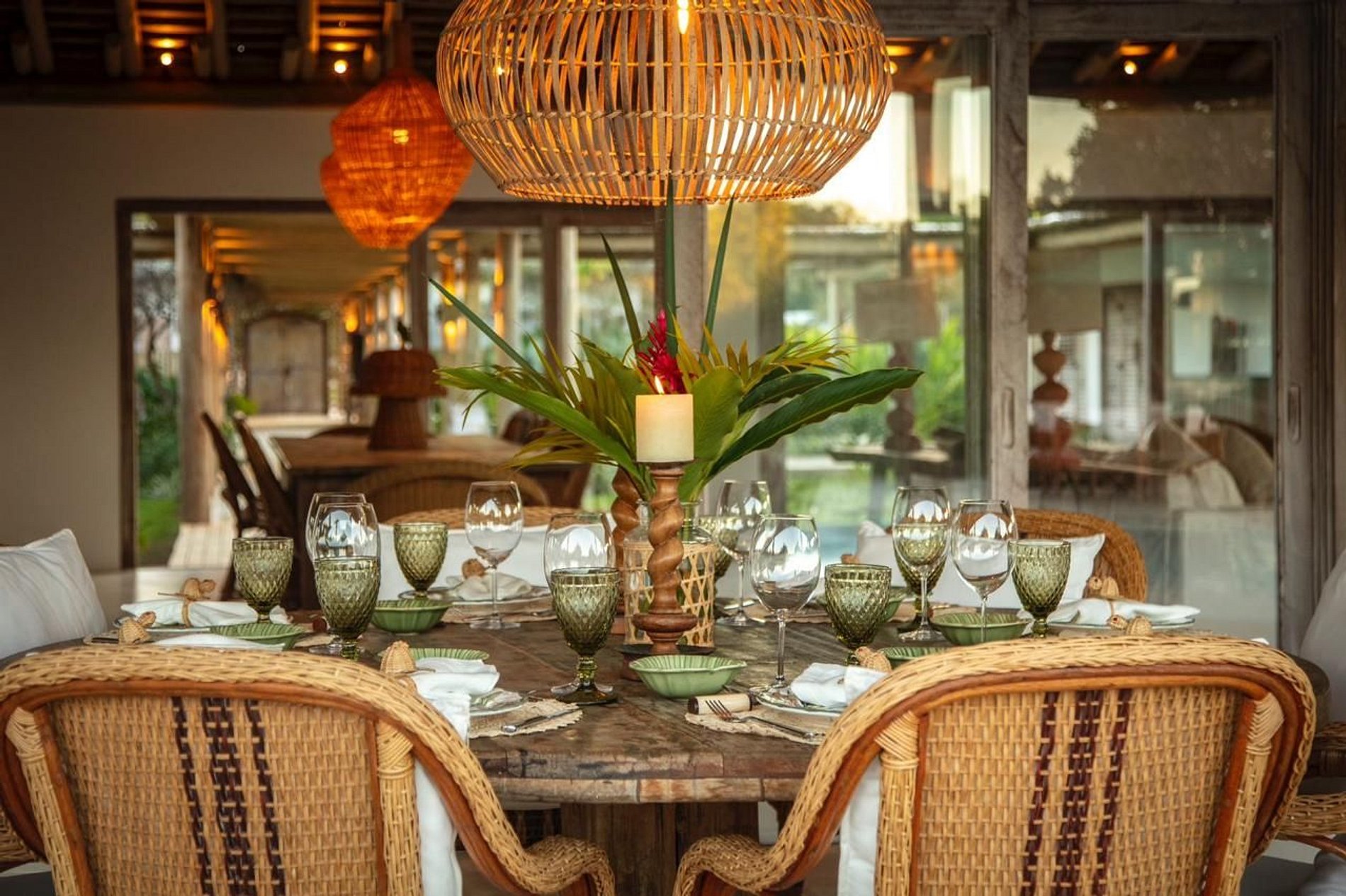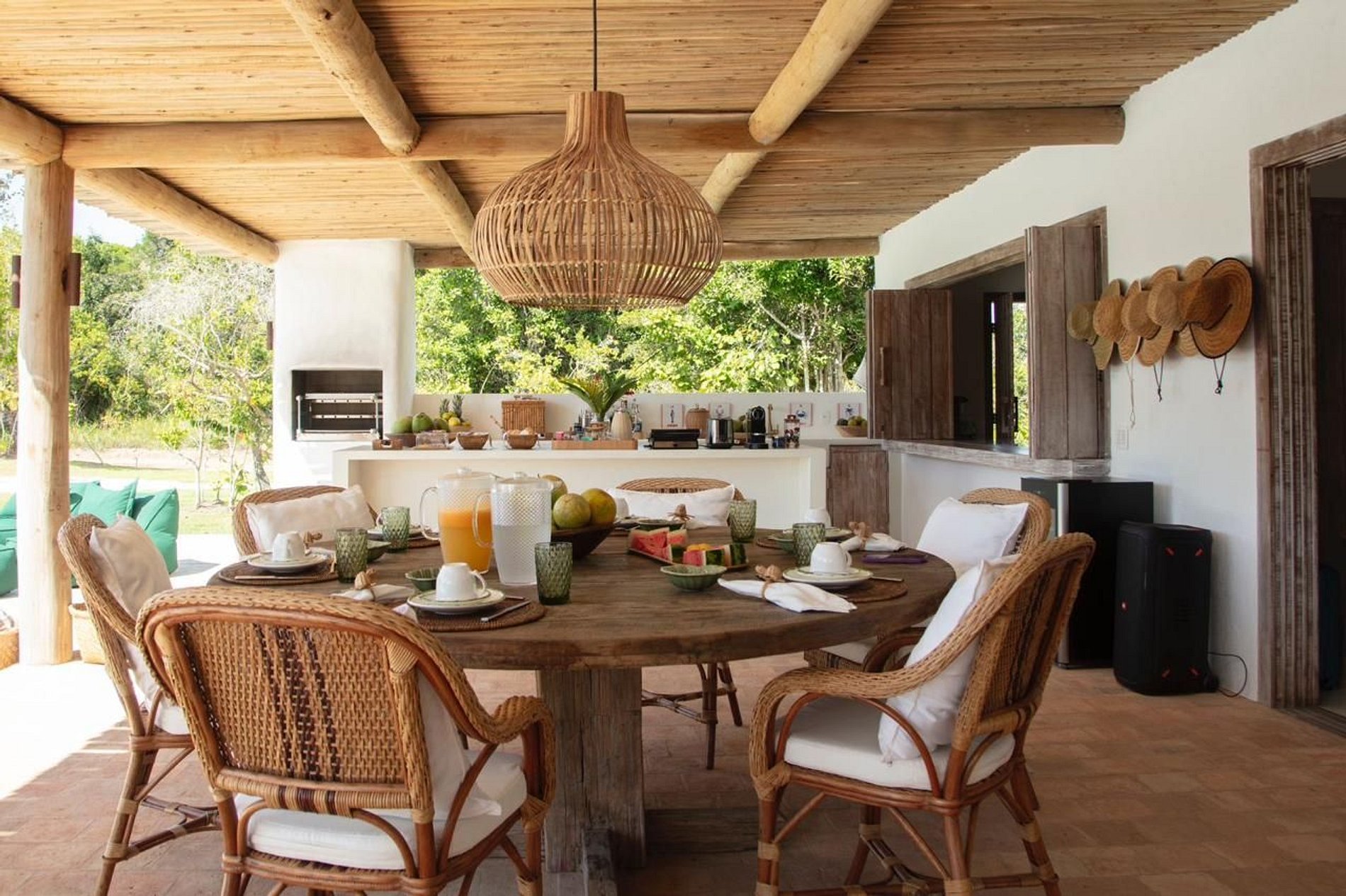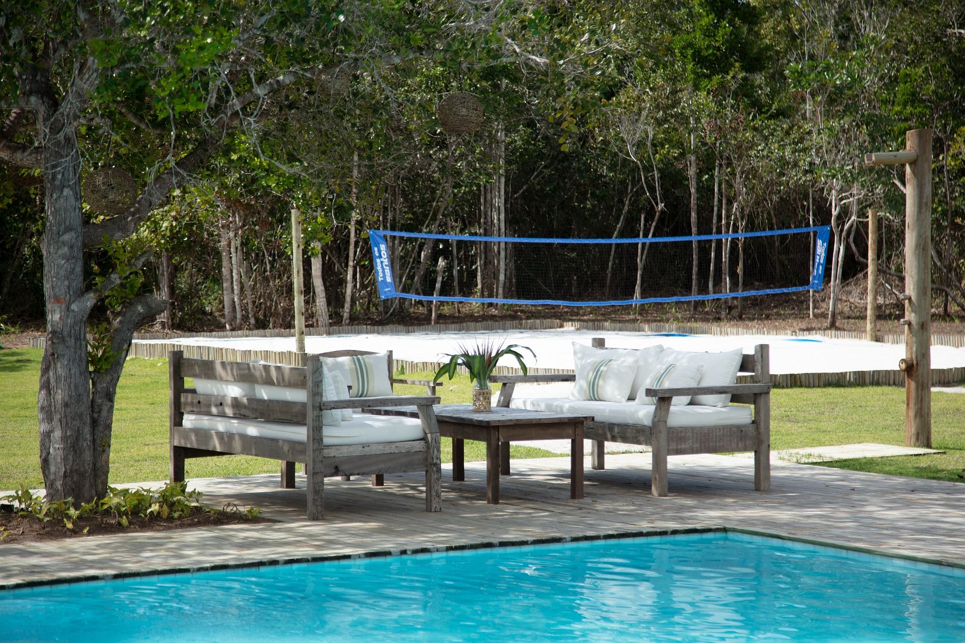 A ampla varanda abriga uma área gourmet com churrasqueira e mesa redonda perfeita para o café da manhã em meio ao verde. Redes, sofás e poltronas convidam ao descanso após um dia de praia. No jardim, o cenário é completo: piscina com deck de madeira e espreguiçadeiras, além de uma quadra de beach tênis para momentos de lazer exclusivos.
