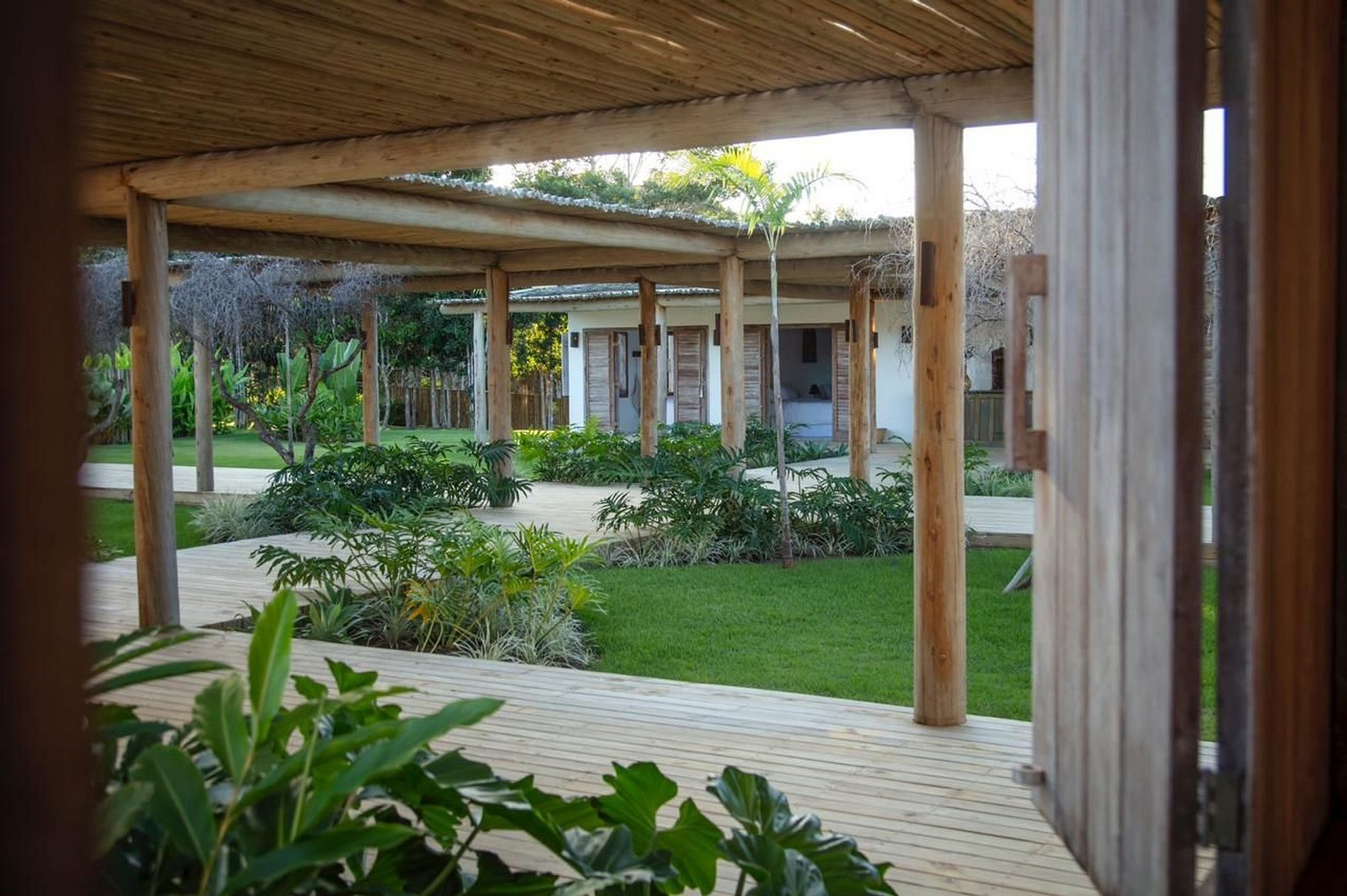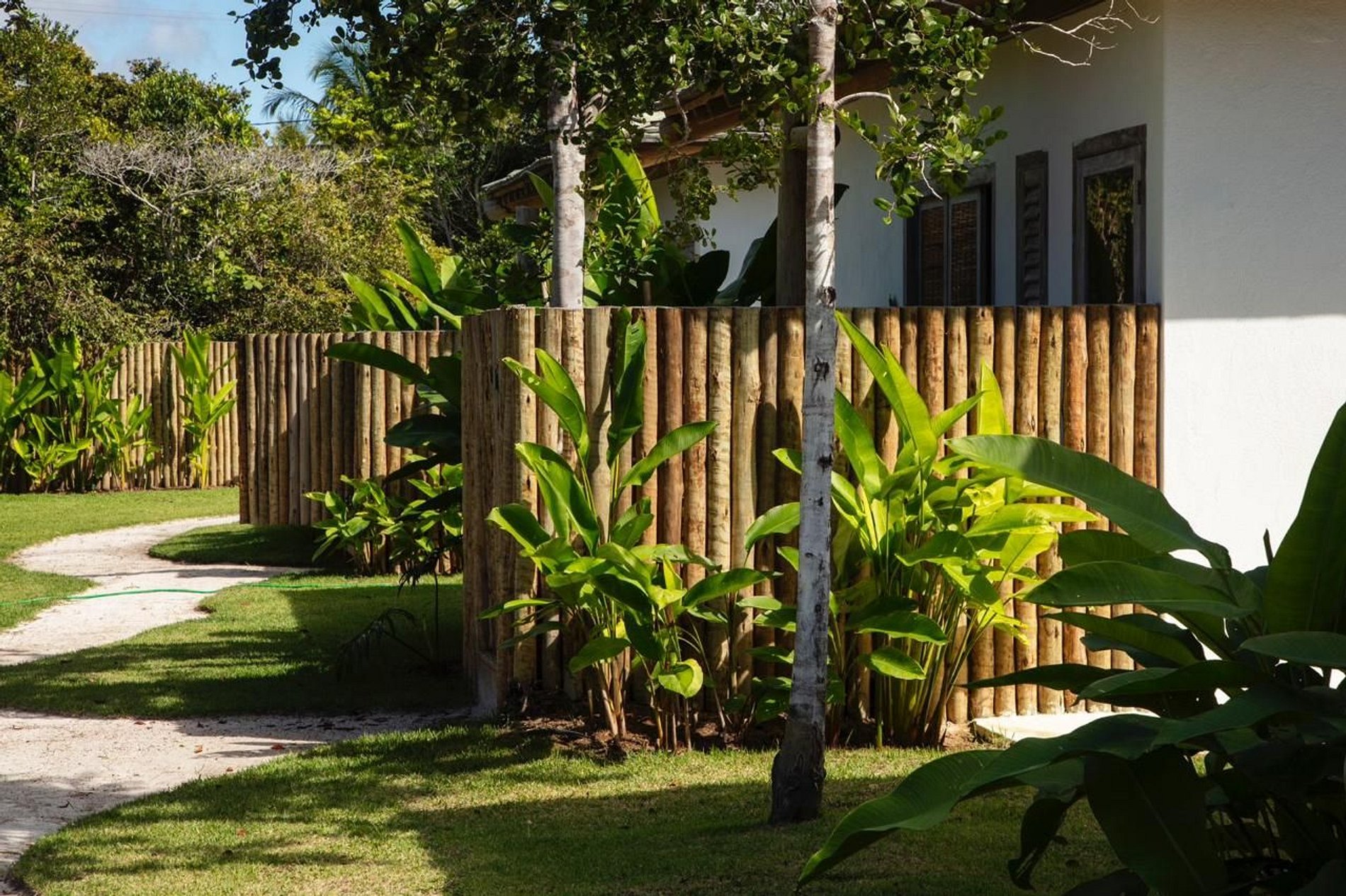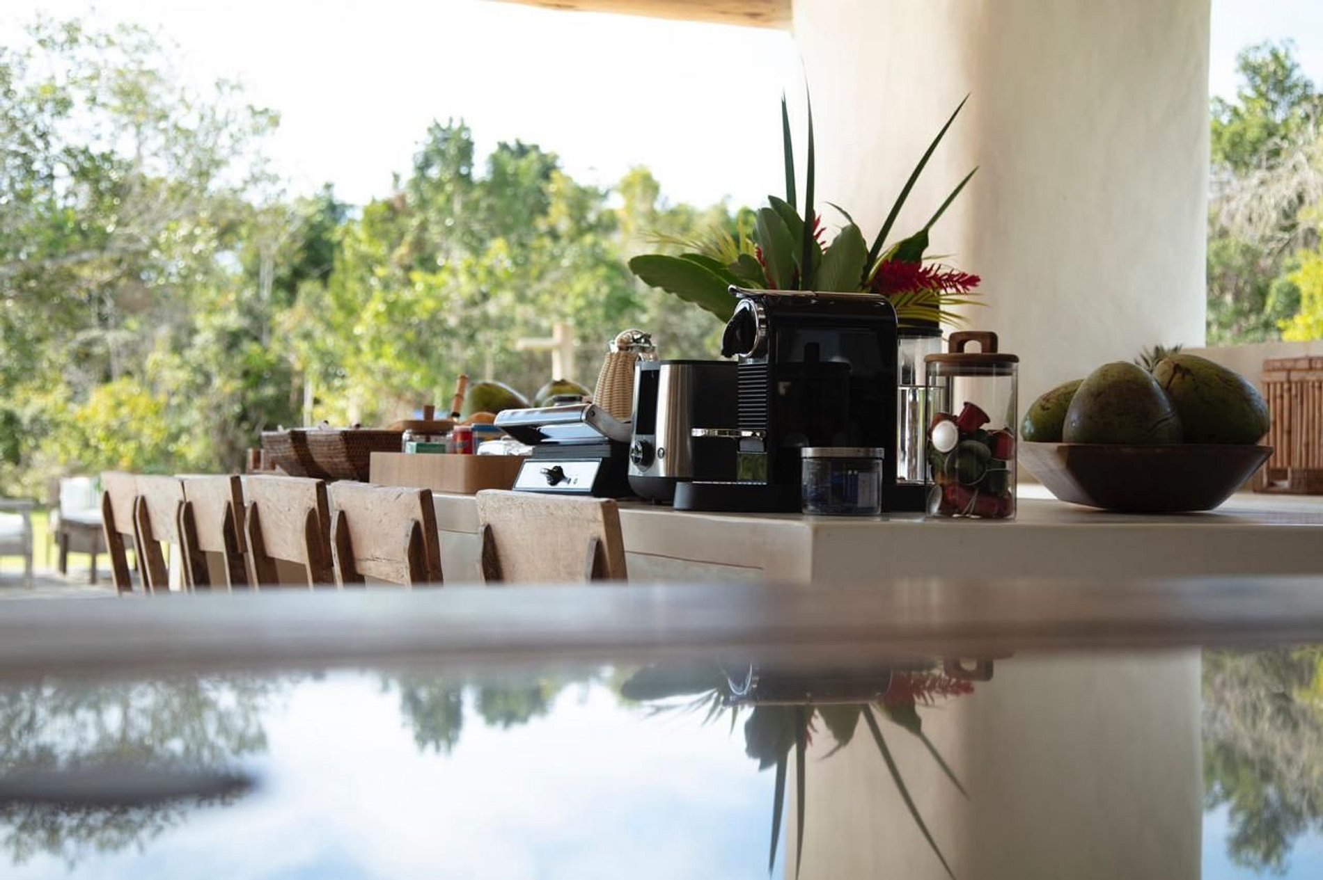 A ampla varanda abriga uma área gourmet com churrasqueira e mesa redonda perfeita para o café da manhã em meio ao verde. Redes, sofás e poltronas convidam ao descanso após um dia de praia. No jardim, o cenário é completo: piscina com deck de madeira e espreguiçadeiras, além de uma quadra de beach tênis para momentos de lazer exclusivos.