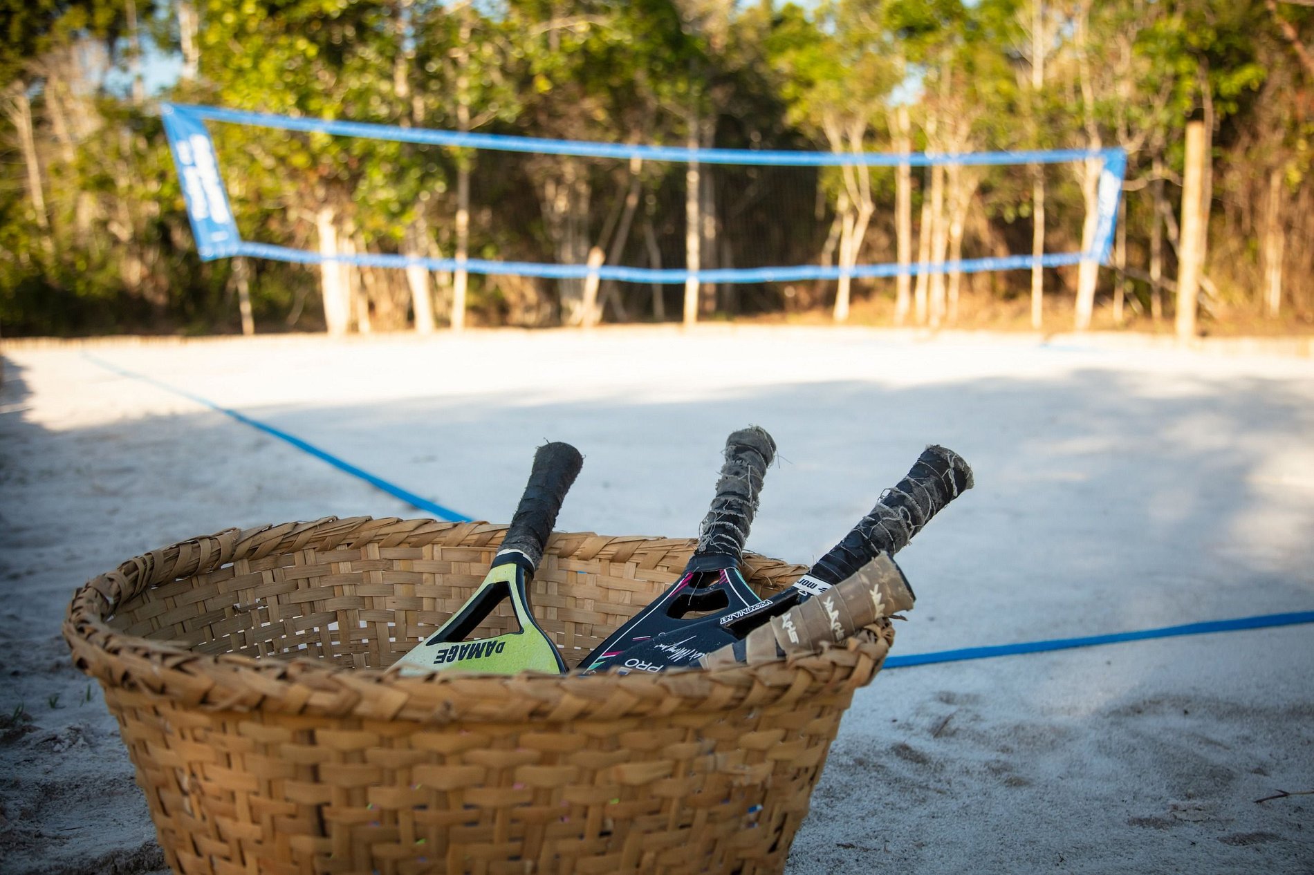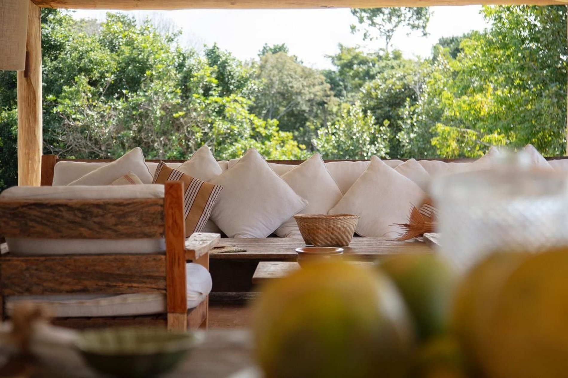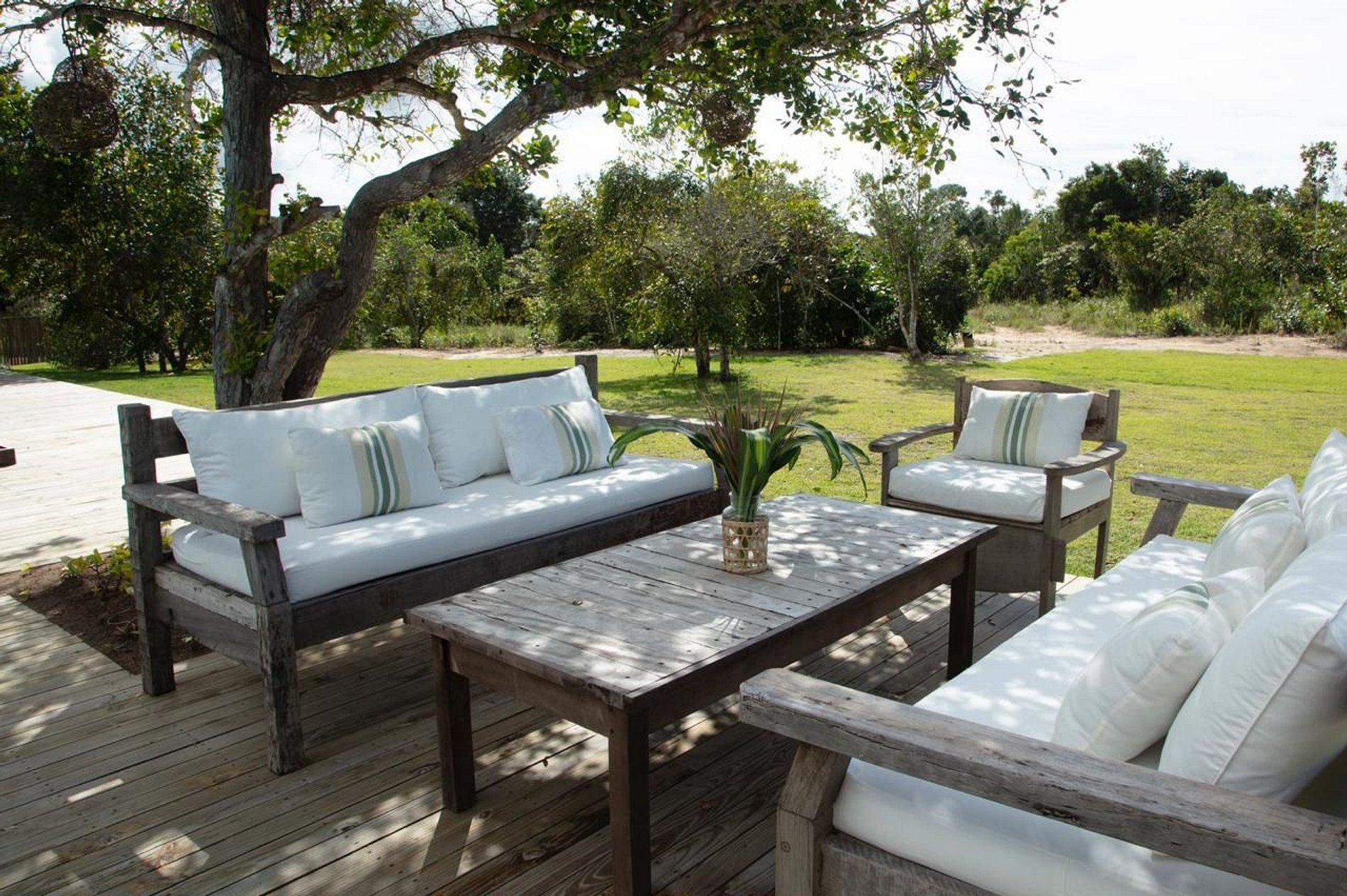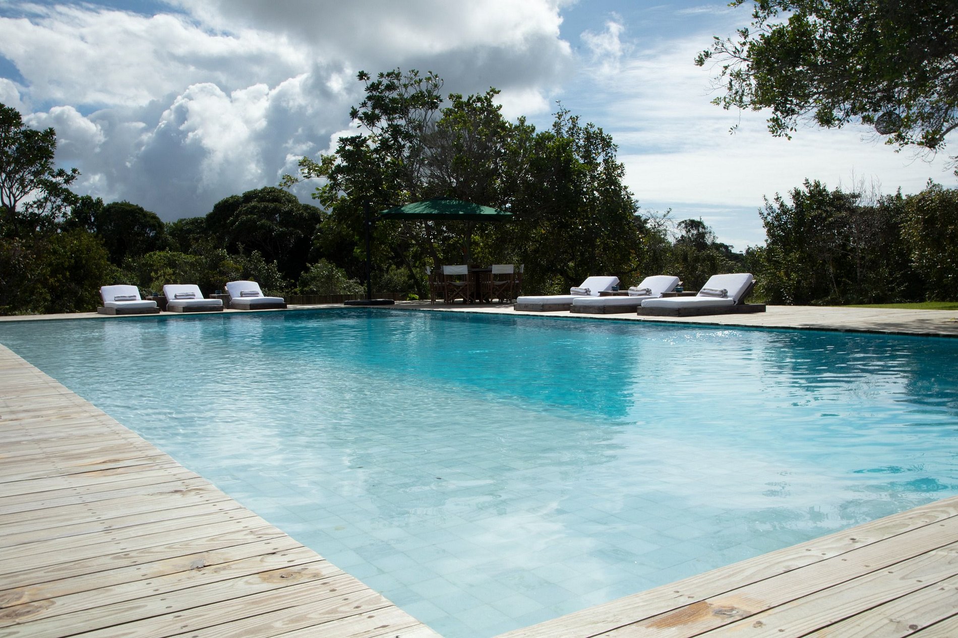 A ampla varanda abriga uma área gourmet com churrasqueira e mesa redonda perfeita para o café da manhã em meio ao verde. Redes, sofás e poltronas convidam ao descanso após um dia de praia. No jardim, o cenário é completo: piscina com deck de madeira e espreguiçadeiras, além de uma quadra de beach tênis para momentos de lazer exclusivos.